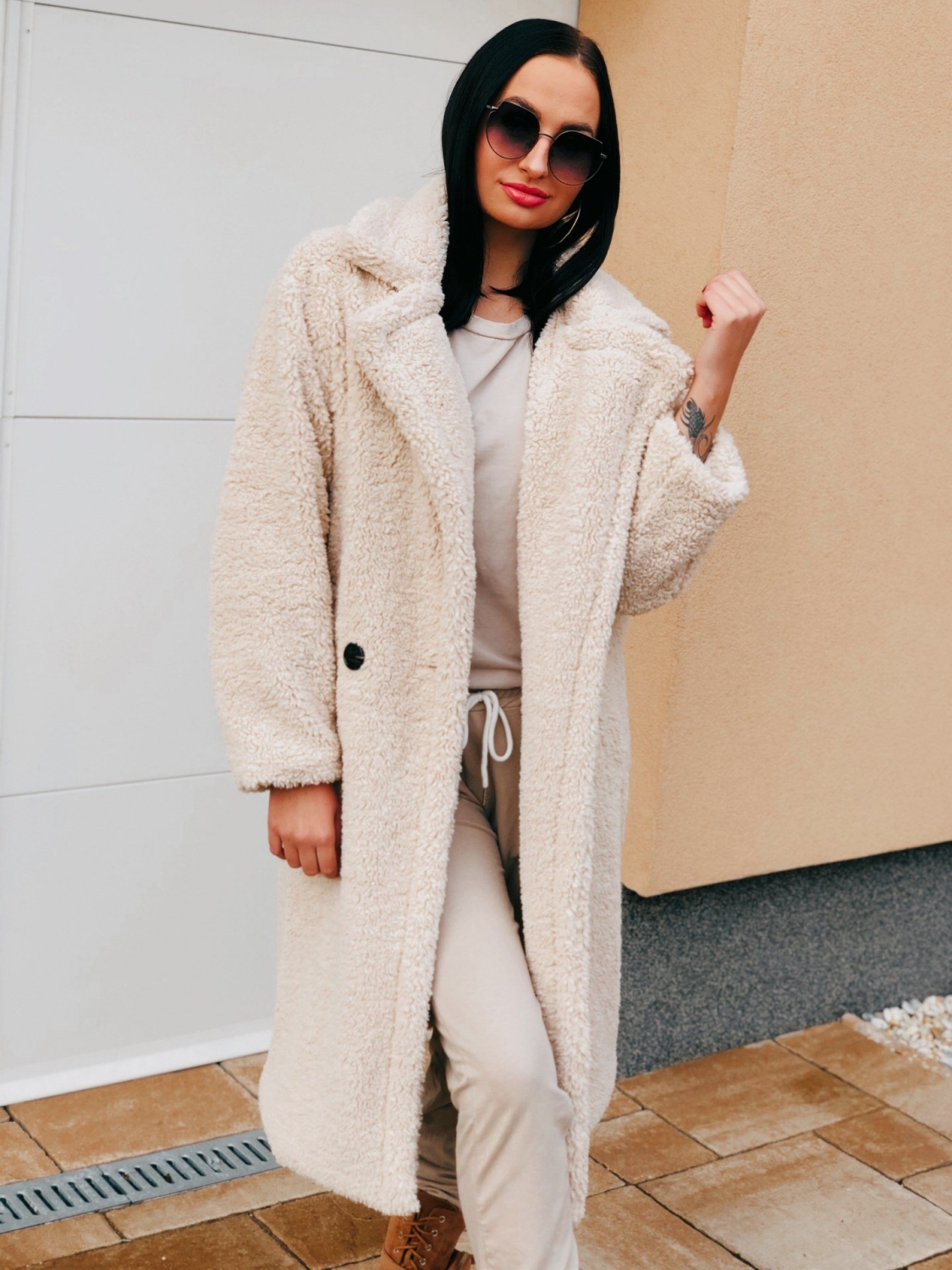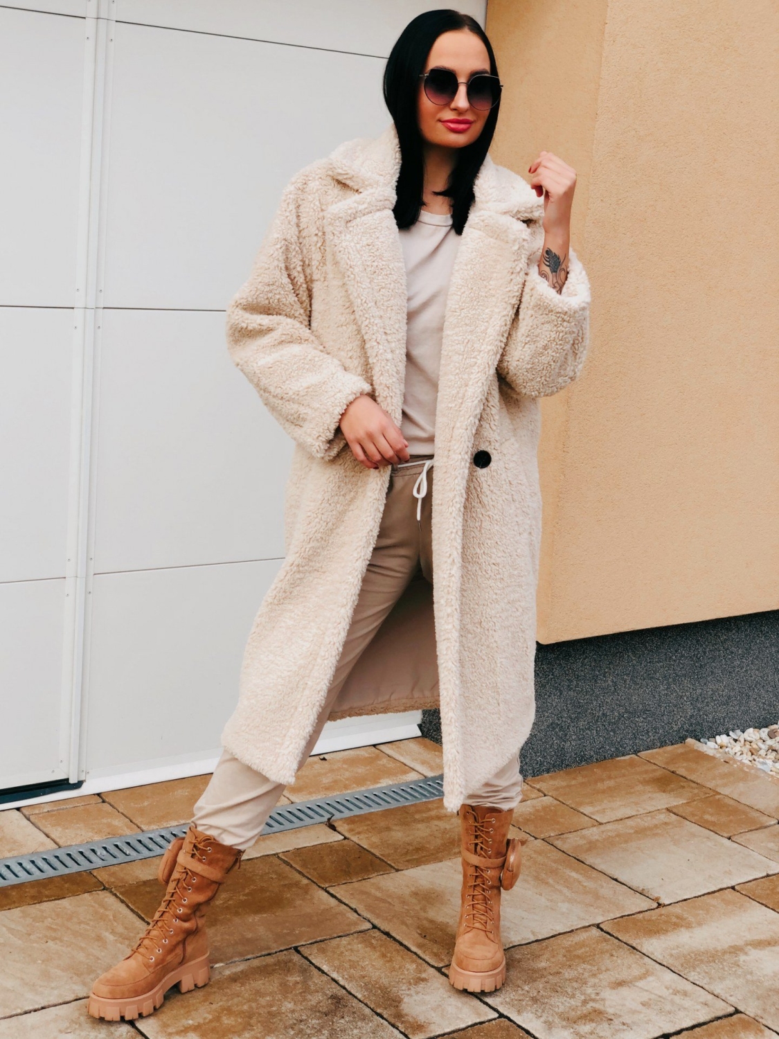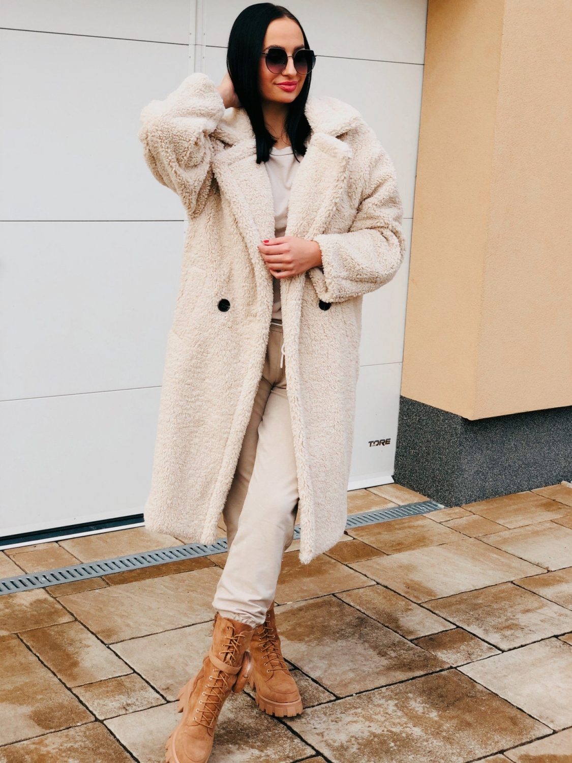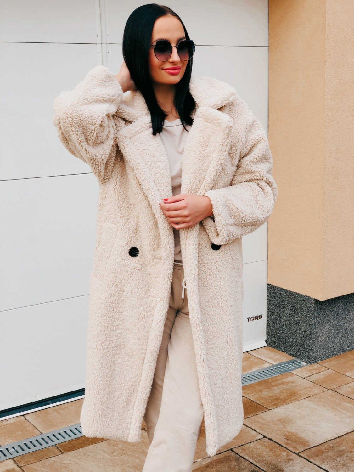 Dámsky béžový Teddy kabátik vhodný na jeseň aj zimu. Svojím oversize strihom pôsobí mohutne a extravagantne. Sľubujeme Vám, že pri ňom neostane žiadne oko bez povšimnutia. Jednoducho neprehliadnuteľný kúsok, ktorý by mala vlastniť každá módna maniačka. Kabát má dlhý rukáv a je v béžovej farbe. Dĺžka kabátu siaha pod kolená. Zapínanie na gombík vo svojej prednej časti. Vrecká na oboch stranách. Doplňte Váš šatník týmto štýlovým kúskom, ktorý jednoducho skombinujete a budete zaručene štýlová aj počas bežného dňa. Modelka je vysoká 175 cm a oblečenú má veľkosť M.