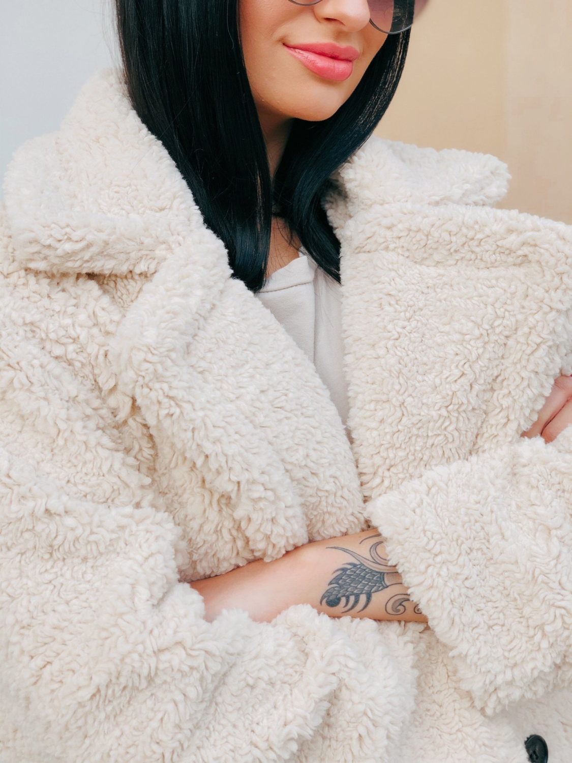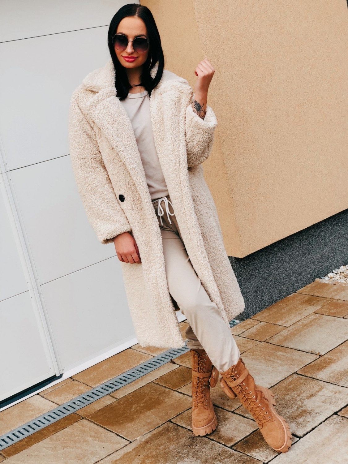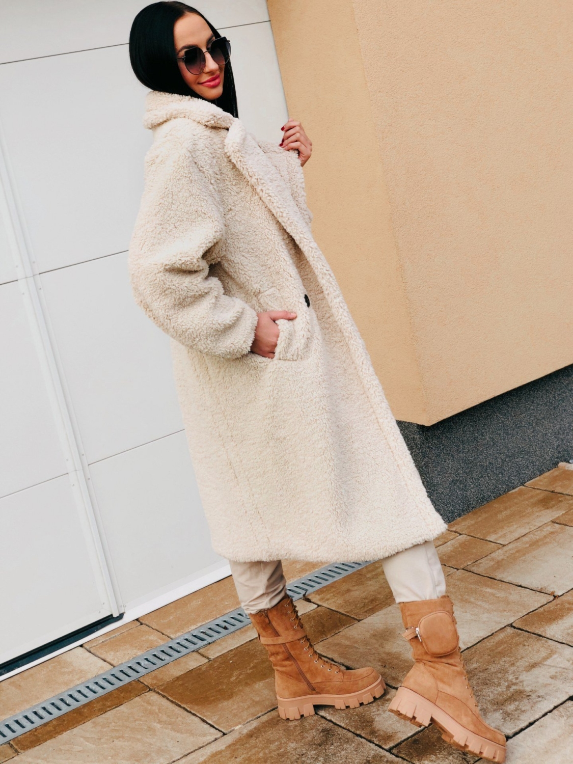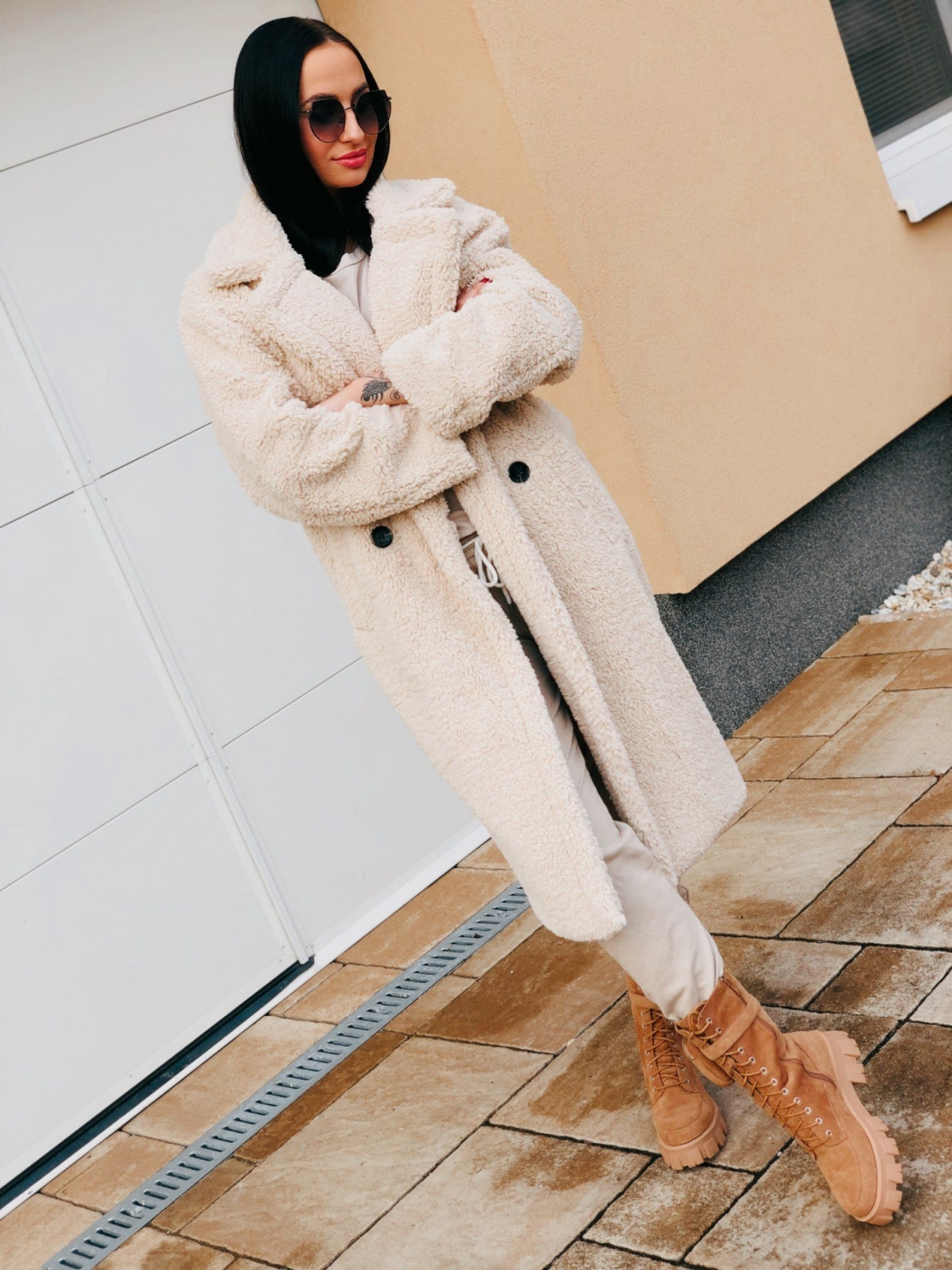 Dámsky béžový Teddy kabátik vhodný na jeseň aj zimu. Svojím oversize strihom pôsobí mohutne a extravagantne. Sľubujeme Vám, že pri ňom neostane žiadne oko bez povšimnutia. Jednoducho neprehliadnuteľný kúsok, ktorý by mala vlastniť každá módna maniačka. Kabát má dlhý rukáv a je v béžovej farbe. Dĺžka kabátu siaha pod kolená. Zapínanie na gombík vo svojej prednej časti. Vrecká na oboch stranách. Doplňte Váš šatník týmto štýlovým kúskom, ktorý jednoducho skombinujete a budete zaručene štýlová aj počas bežného dňa. Modelka je vysoká 175 cm a oblečenú má veľkosť M.