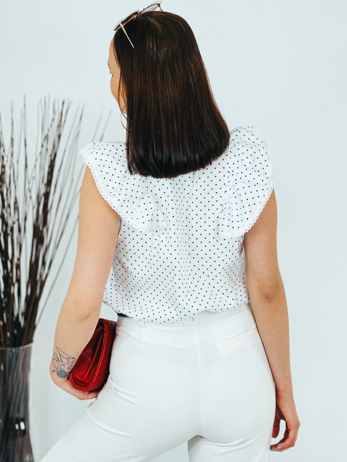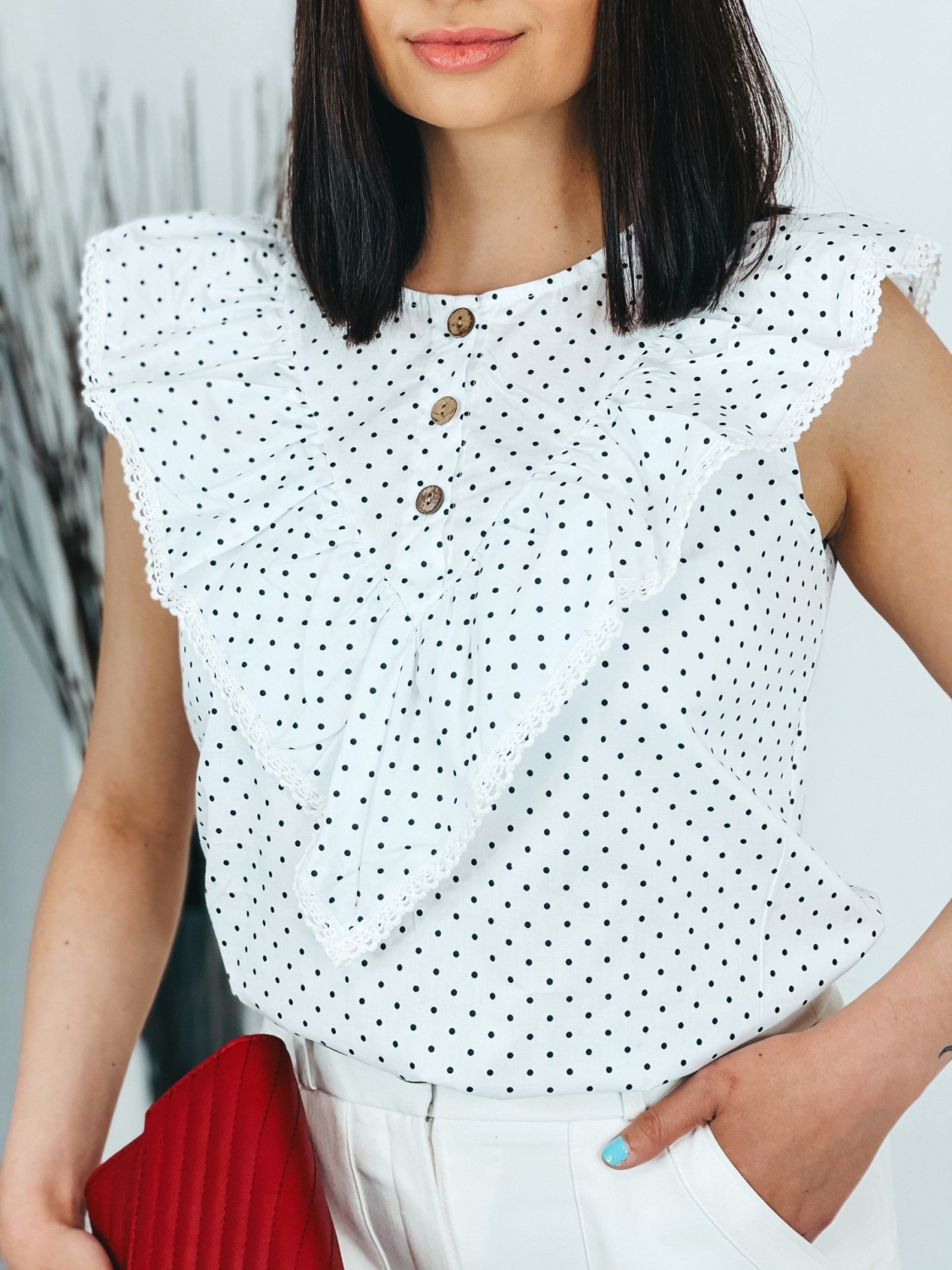 Dámska biela bodkovaná blúzka, ktorá je doplnená gombíkmi vo svojej prednej časti. Blúzka je v zaujímavom a trendy prevedení. Príjemný a vzdušný materiál. Bez zapínania. Sadne takmer každému. Búdete sa v nej cítiť pohodlne a príjemne. Vhodná na bežné dni aj na slávnostnejšiu príležitosť. Modelka je vysoká 175 cm a oblečenú má veľkosť UNI.