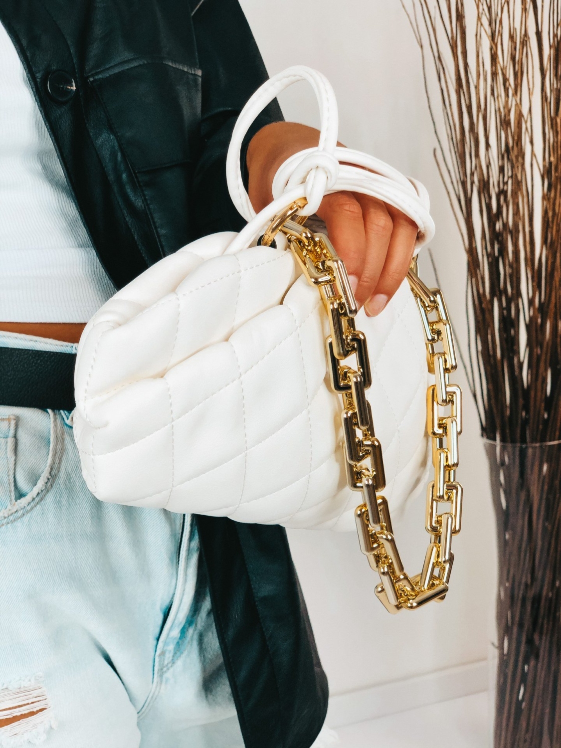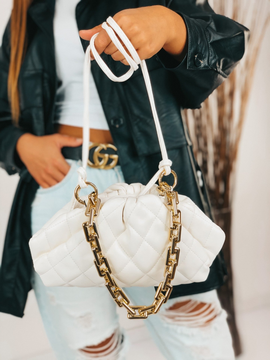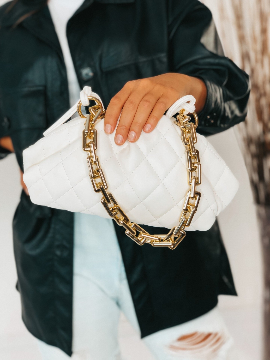 Dámska kabelka v bielej farbe je štýlovým trendy kúskom. Kabelka má zlatú reťaz, ktorá je odopínateľná. Možnosť pripnutia na inú kabelku. Remienok na kabelke je taktiež odnímateľný a dĺžku remienka si môžete prispôsobiť podľa Vášho vkusu. Kabelka je prepracovaná do detailov ako z vonkajšej strany, tak i zvnútra. Originálny vzhľad kabelky ti dodá jedinečný štýl. Buď trendy a choď tým správnym módnym smerom. Skombinujete ju s akýmkoľvek štýlom.