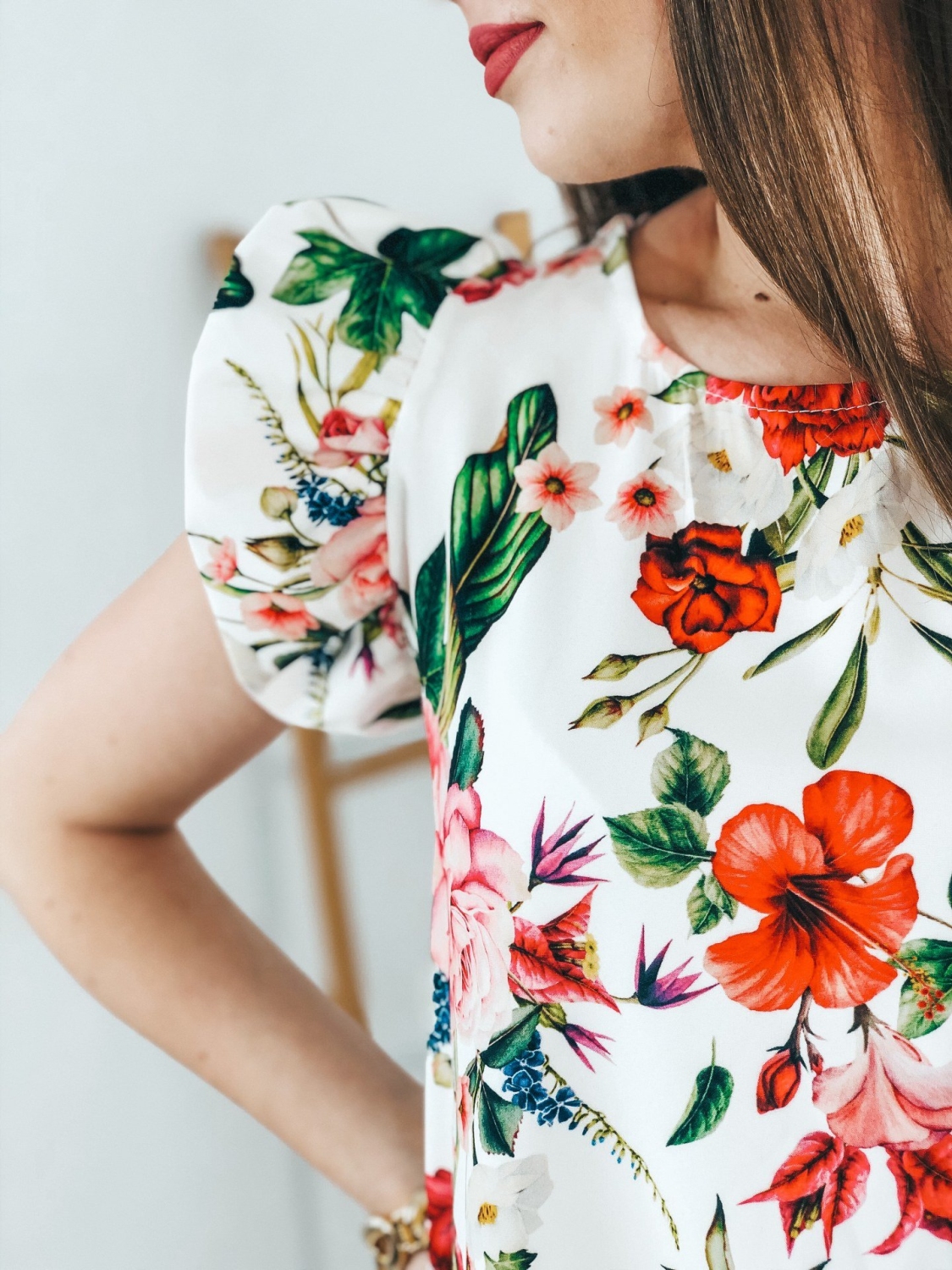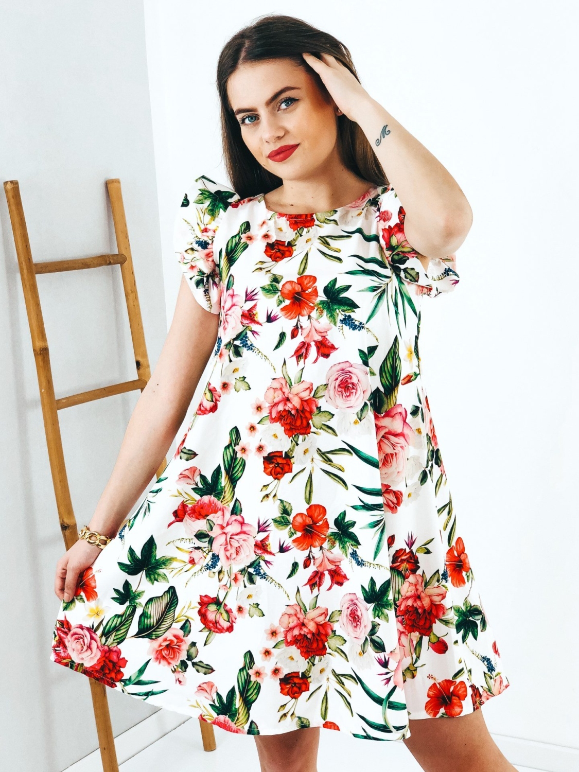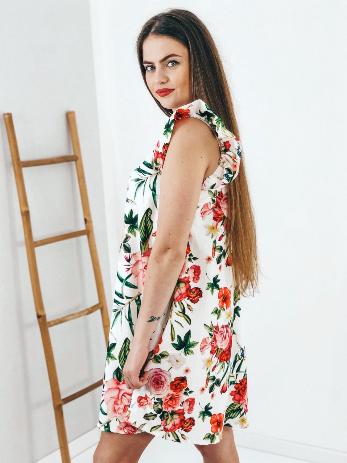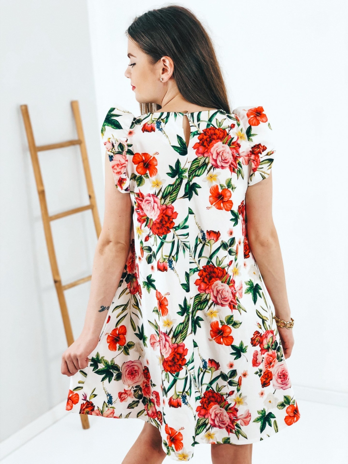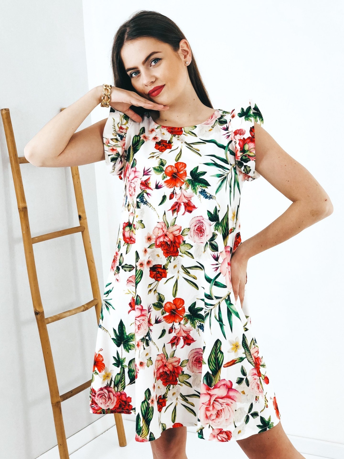 Elegantné krátke kvetované šaty v bielej farbe s volánovými rukávmi v zaujímavom prevedení s dĺžkou nad kolená. Vzadu zapínanie na gombík. Materiál je príjemný, pohodlný a skvelo padne na postave. Modelka meria 172 cm a má oblečenú veľkosť UNI.