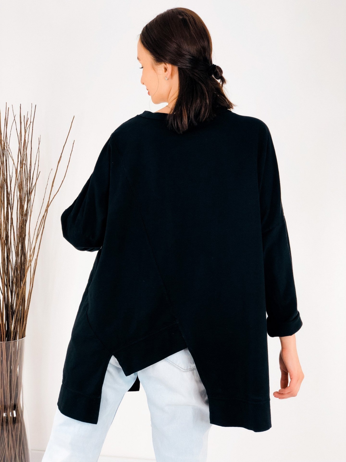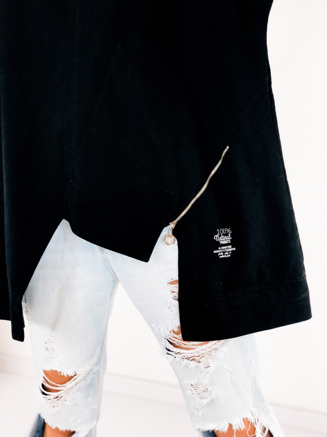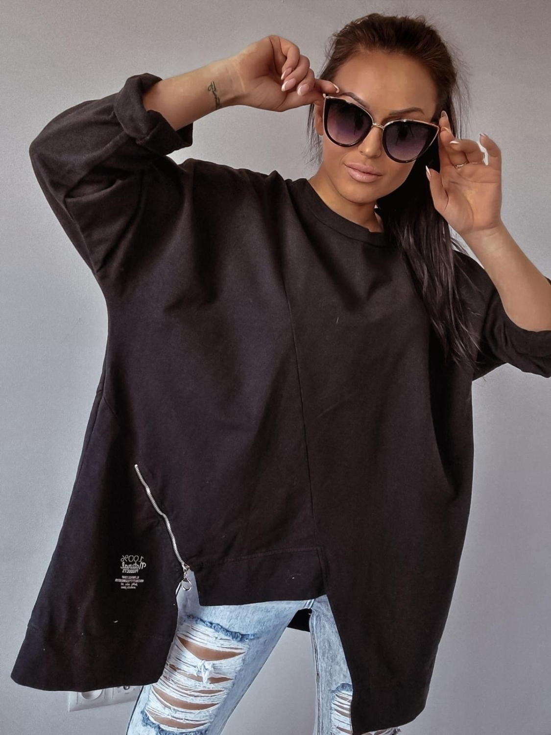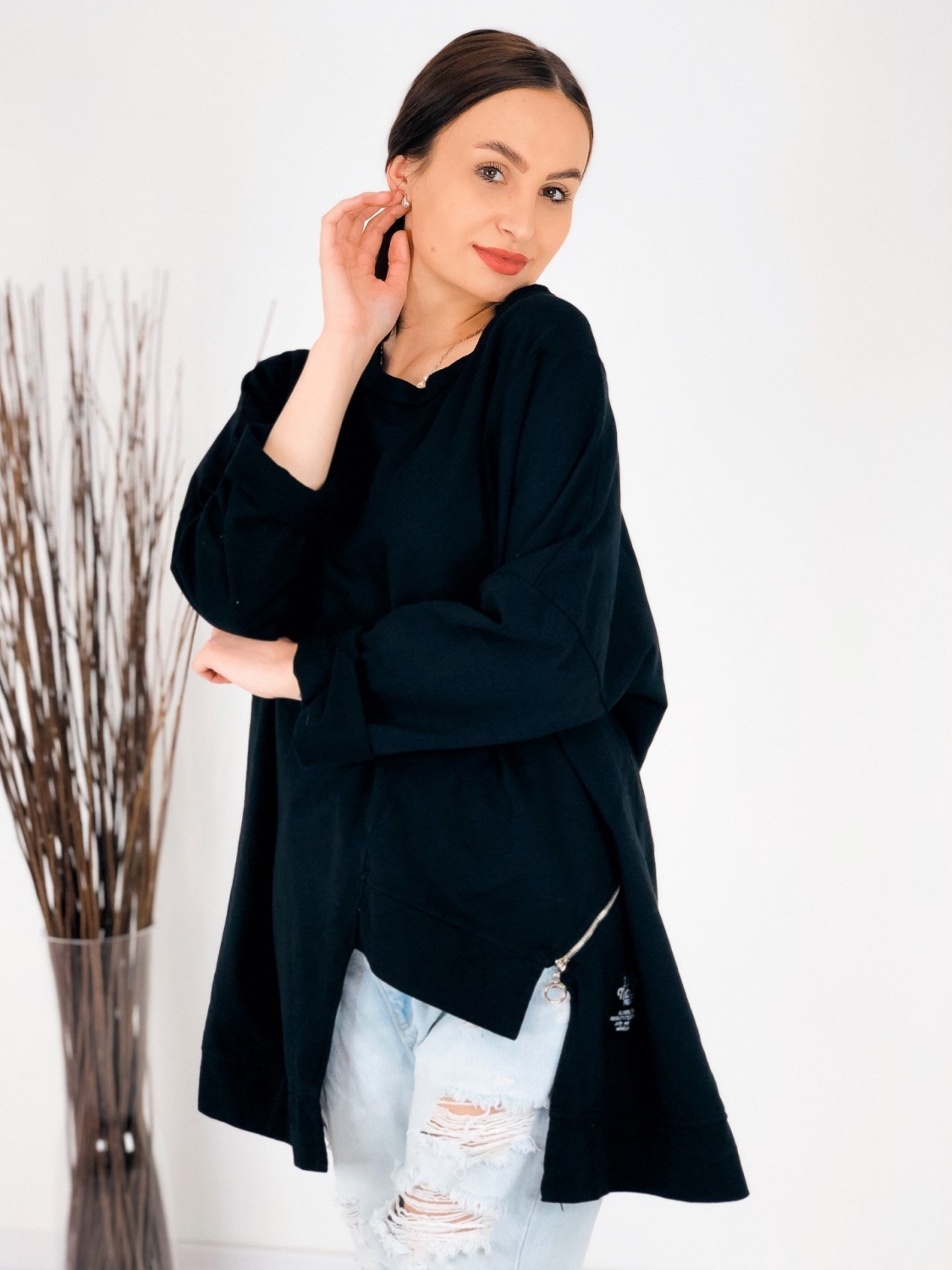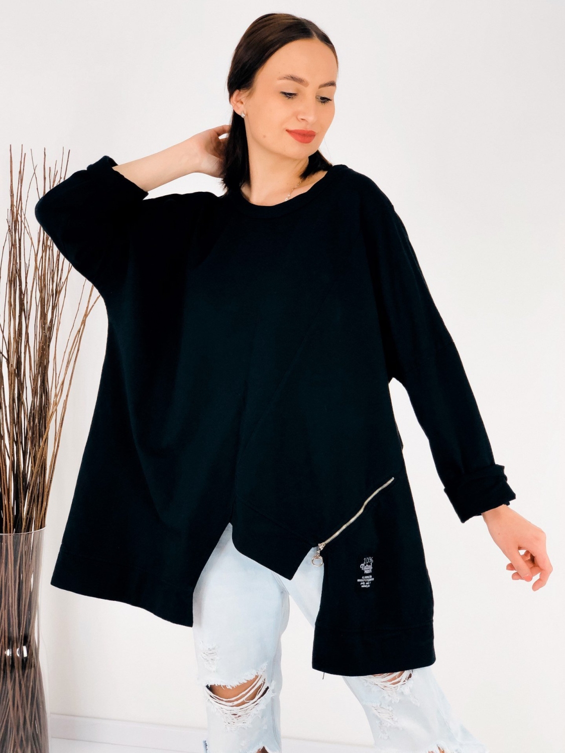 Dámska trendová čierna oversize mikina, ktorá je doplnená zipsom. Mikina, ktorá je zaujímavo strihaná. Originálny a jedinečný kúsok, vhodný na viacero príležitosti. Módny kúsok. Materiál je príjemný, pohodlný a skvelo padne na postave. S touto trendy mikinu môžete vyraziť kamkoľvek sa Vám zachce a stále sa budete cítiť pohodlne. Mikina je vo veľkosti UNI, takže pohodlne sadne na akúkoľvek postavu. Trendy kúsok a hit sezóny.