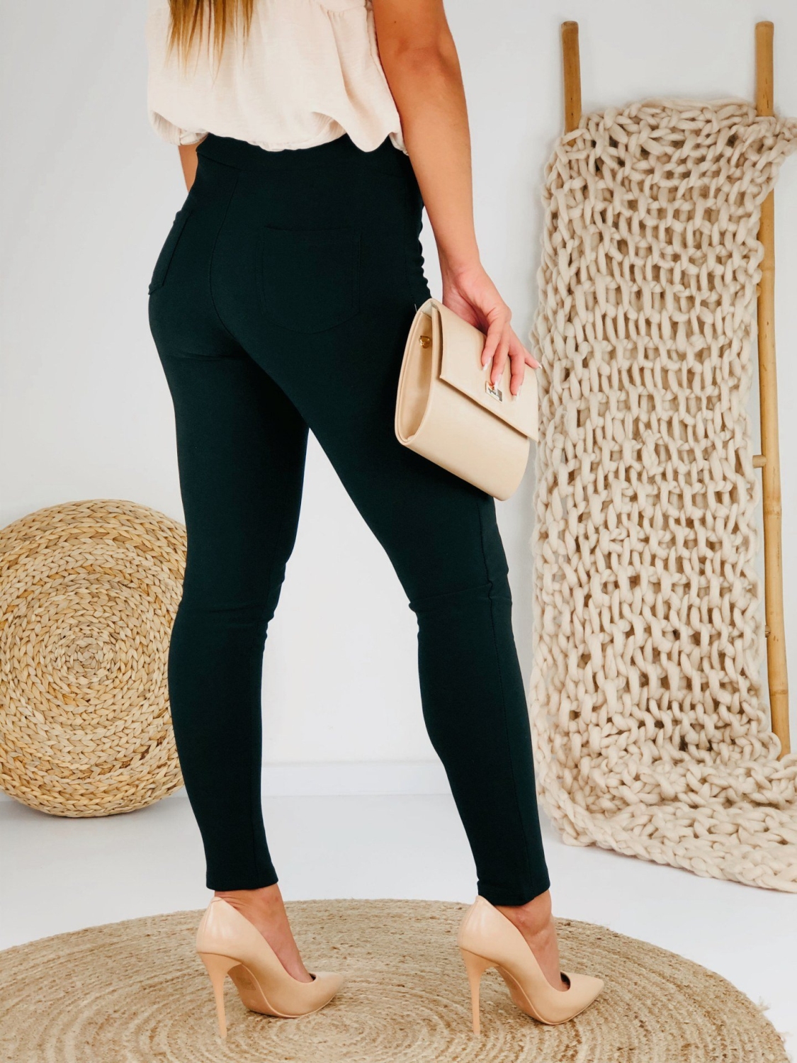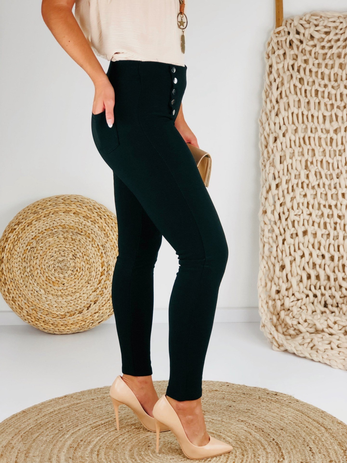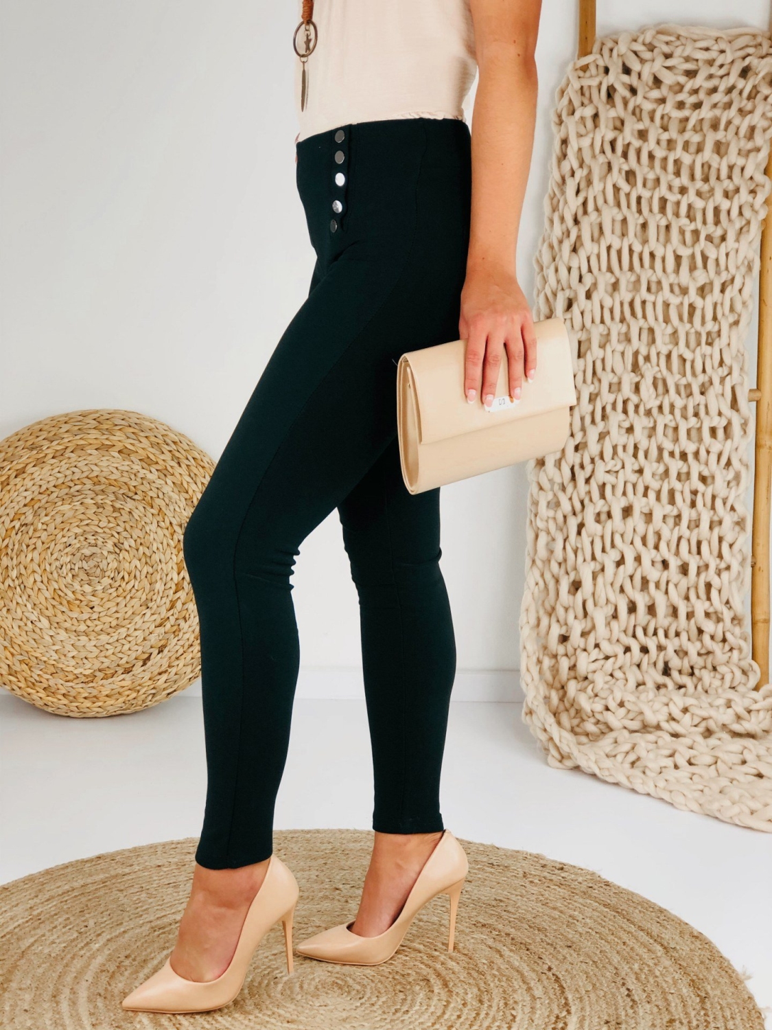 Dámske legínové čierne nohavice s gombíkmi, ktoré sú z elastického a pevného materiálu. Prispôsobia sa každej postave. Kúsok, ktorý skombinuješ so všetkým. Modelka je vysoká 173 cm a oblečenú má veľkosť S/M.