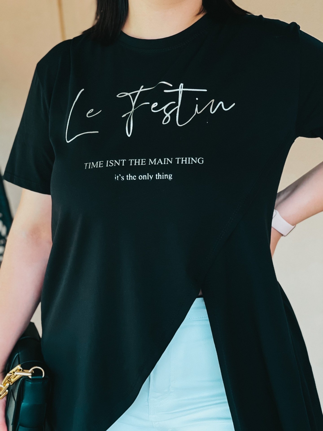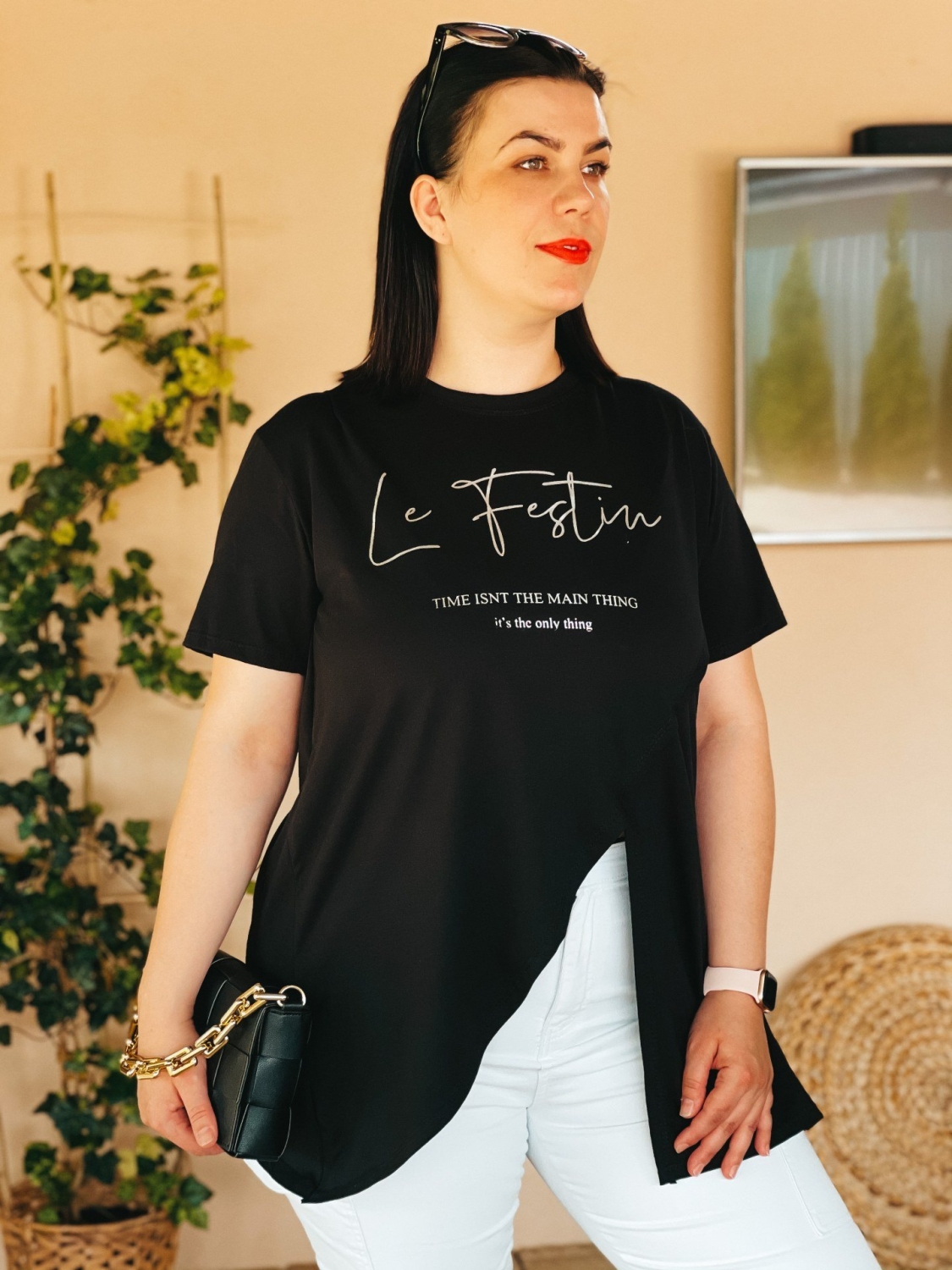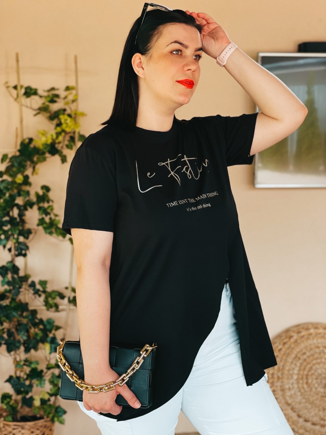 Dámske predĺžené tričko s razporkami. Tričko je v čiernej farbe a s krátkym rukávom. Oversize strih, ktorý sadne takmer každému. Pohodlný tričkový materiál, ktorý skombinujete s akýmkoľvek kúskom a vždy budete vyzerať trendy. Využijete ho na každý deň. TOP kúsok pre každú z Vás. Modelka je vysoká 180 cm a oblečenú má veľkosť UNI.