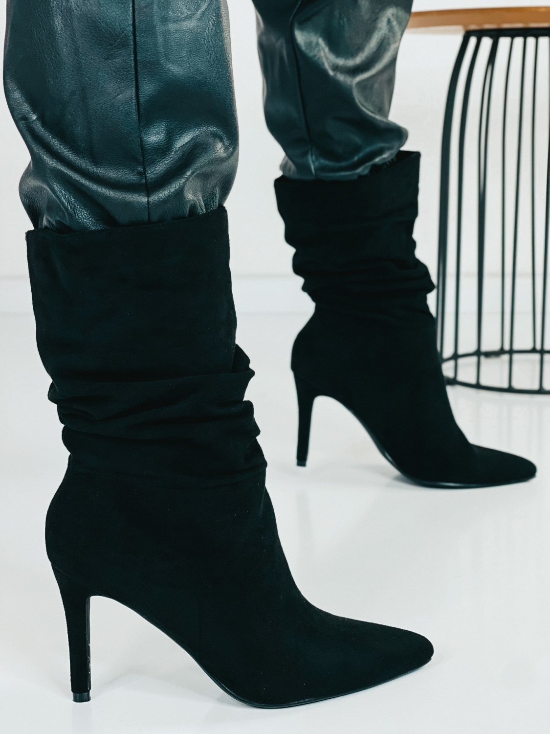 Dámske semišové nazberané čižmy na tenkom opätku v čiernej farbe. Veľmi pohodlný a trendový model na každodenné nosenie. Tieto štýlové dámske čižmy Vás už na prvý pohľad zaujmú svojím perfektným spracovaním. Čižmy sú mierne zateplené, takže sú vhodné aj do chladnejšieho počasia. Jednoduchý strih. Bez zapínania. Veľkosti sedia presne.
