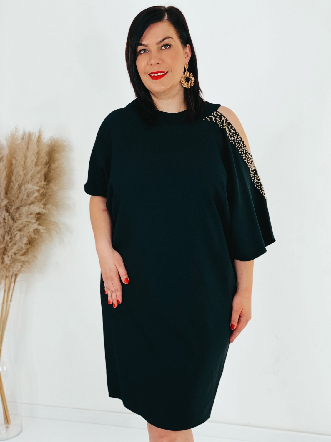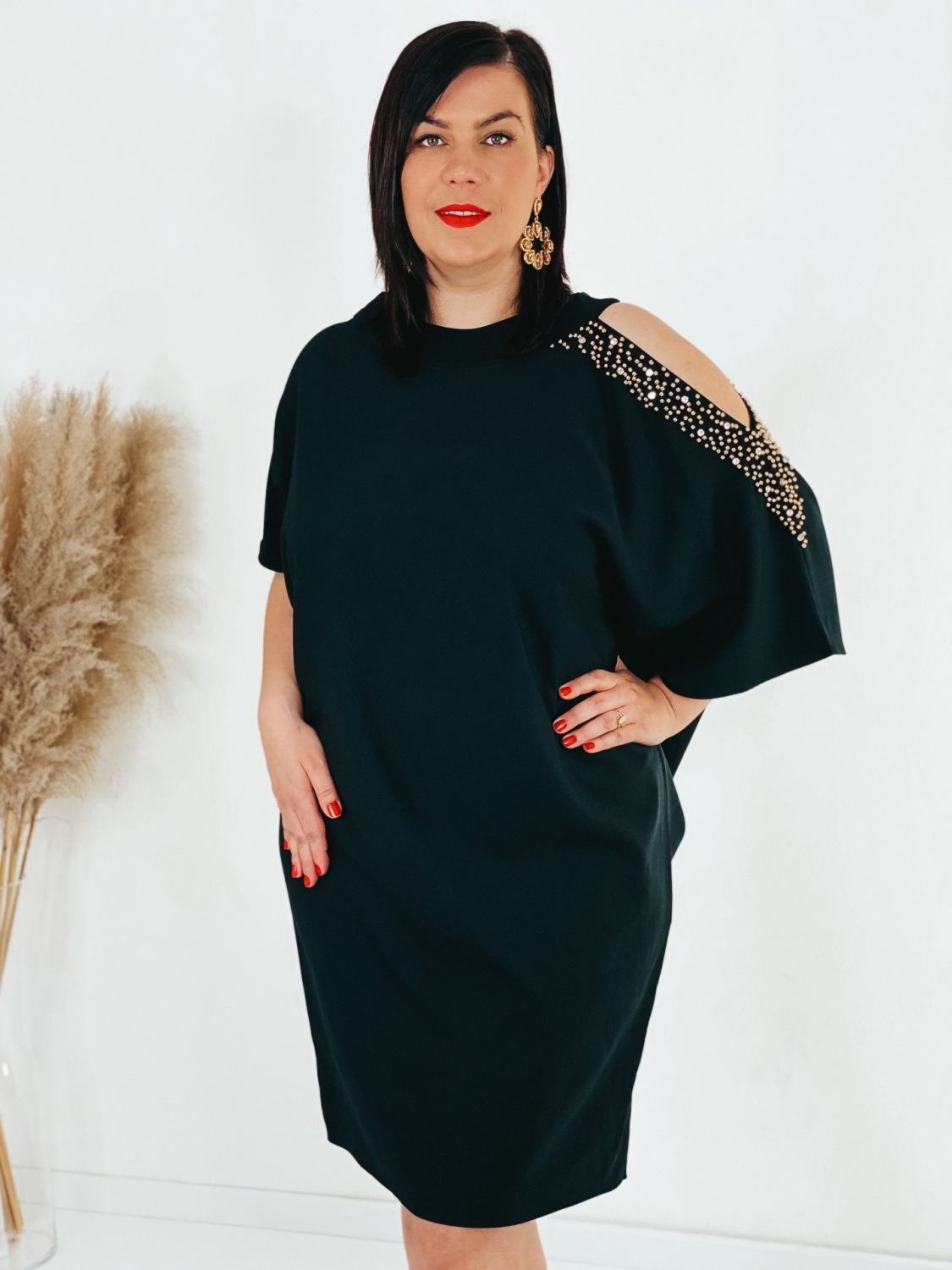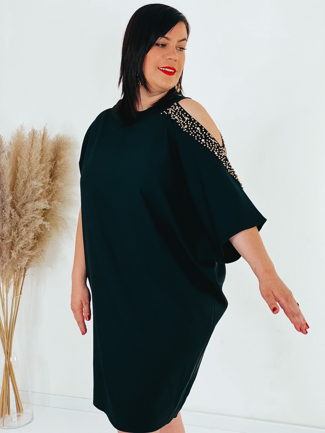 Exkluzívne krátke spoločenské šaty pre moletky s ozdobnými kamienkami na rukávoch a s vykrojením. Šaty v ktorých zažiari každá dáma. Veľmi luxusný a štýlový kúsok z našej ponuky, ktorý očarí každú z Vás a samozrejme aj ostatných okolo Vás. Vhodné sú na rôzne spoločenské udalosti ako je svadba či stužková slávnosť. Doplnené sú okruhlým výstrihom. Šaty sú bez zapínania. Šaty sú v oversize strihu. Vďaka tomu sa skvelo prispôsobia postave. Modelka meria 178 cm a má oblečenú veľkosť 44.