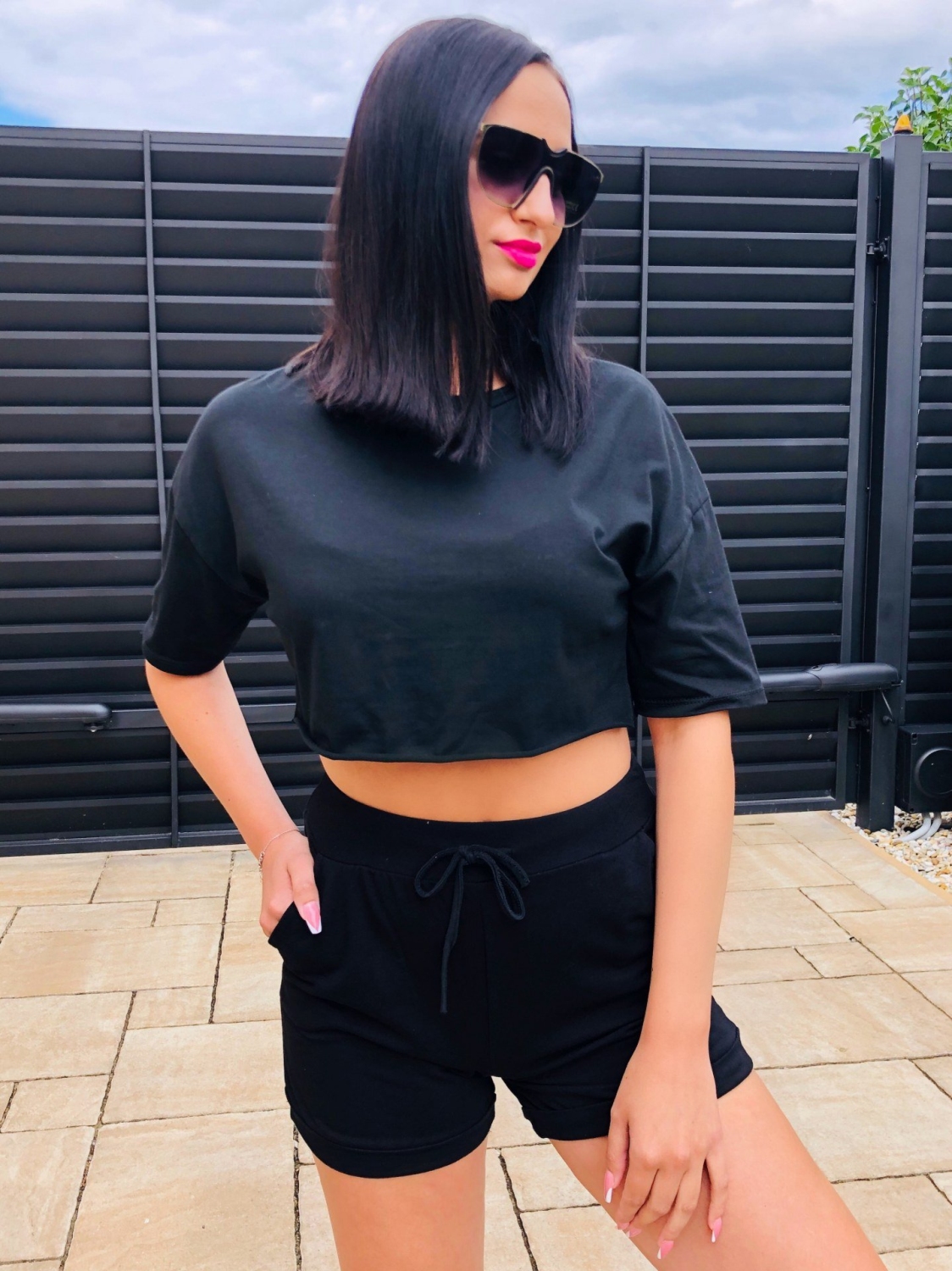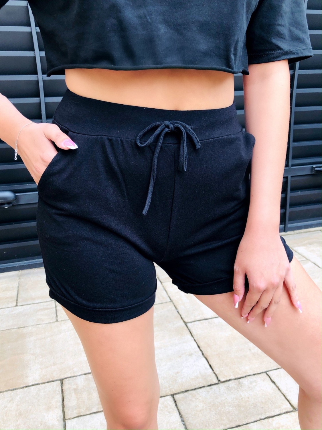 Čierne teplákové kraťasy, ktoré sú z pohodlného a mierne elastického materialu. Kraťasy sú s vysokým pásom. Vhodné pre každú z Vás, ktorá má rada trendy kúsky zaujímavého strihu. Modelka je vysoká 175 cm a oblečenú má veľkosť UNI.