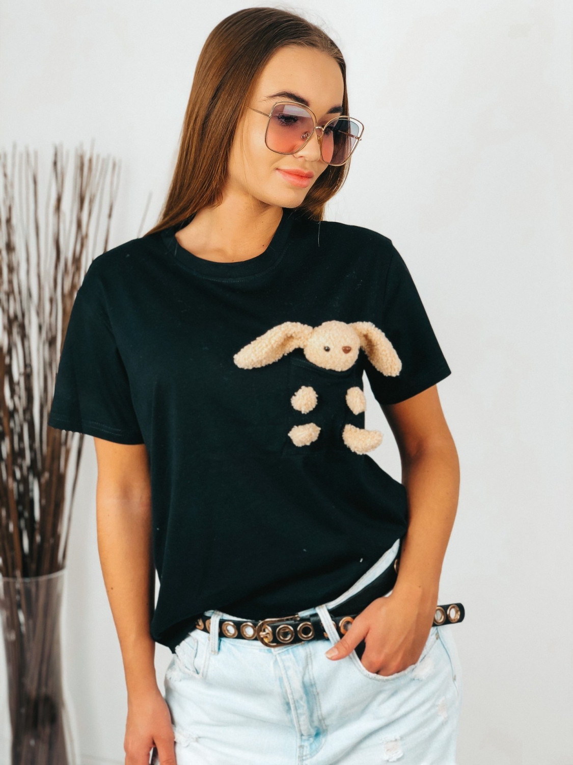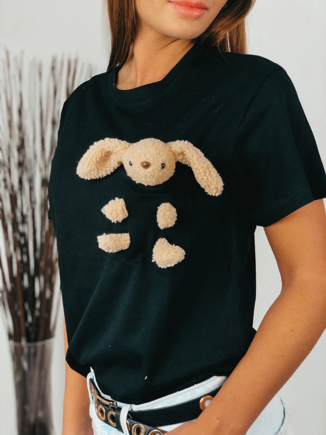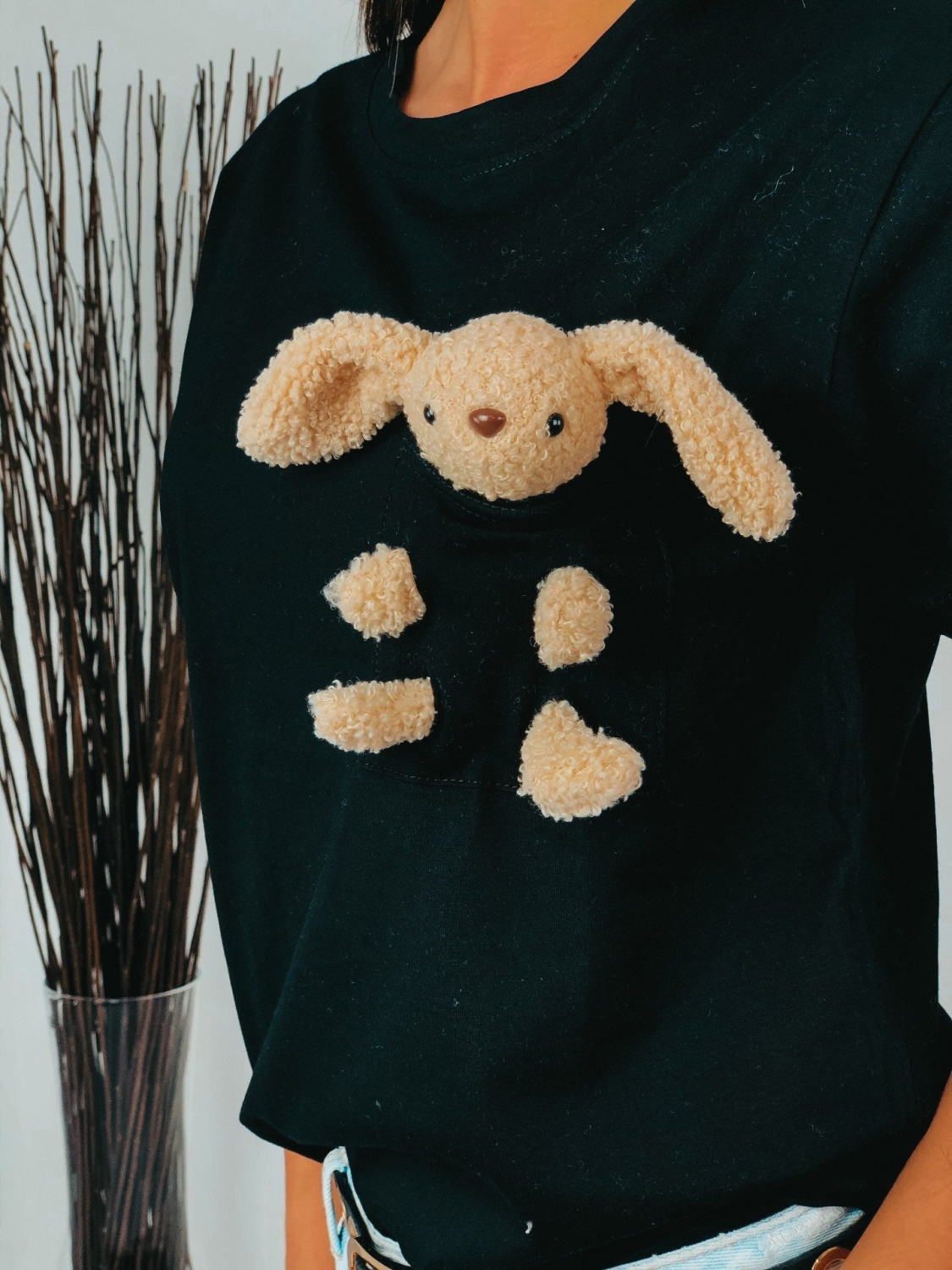 Dámske oversize tričko, ktoré je doplnené plyšovou hračkou. Tričko je s krátkym rukávom v čiernej farbe. Hračku je možnosť z trička odstrániť. Pohodlný tričkový materiál, ktorý skombinujete s akýmkoľvek kúskom a vždy budete vyzerať trendy. Pohodlie nadovšetko. Modelka je vysoká 175 cm a má oblečenú veľkosť UNI.