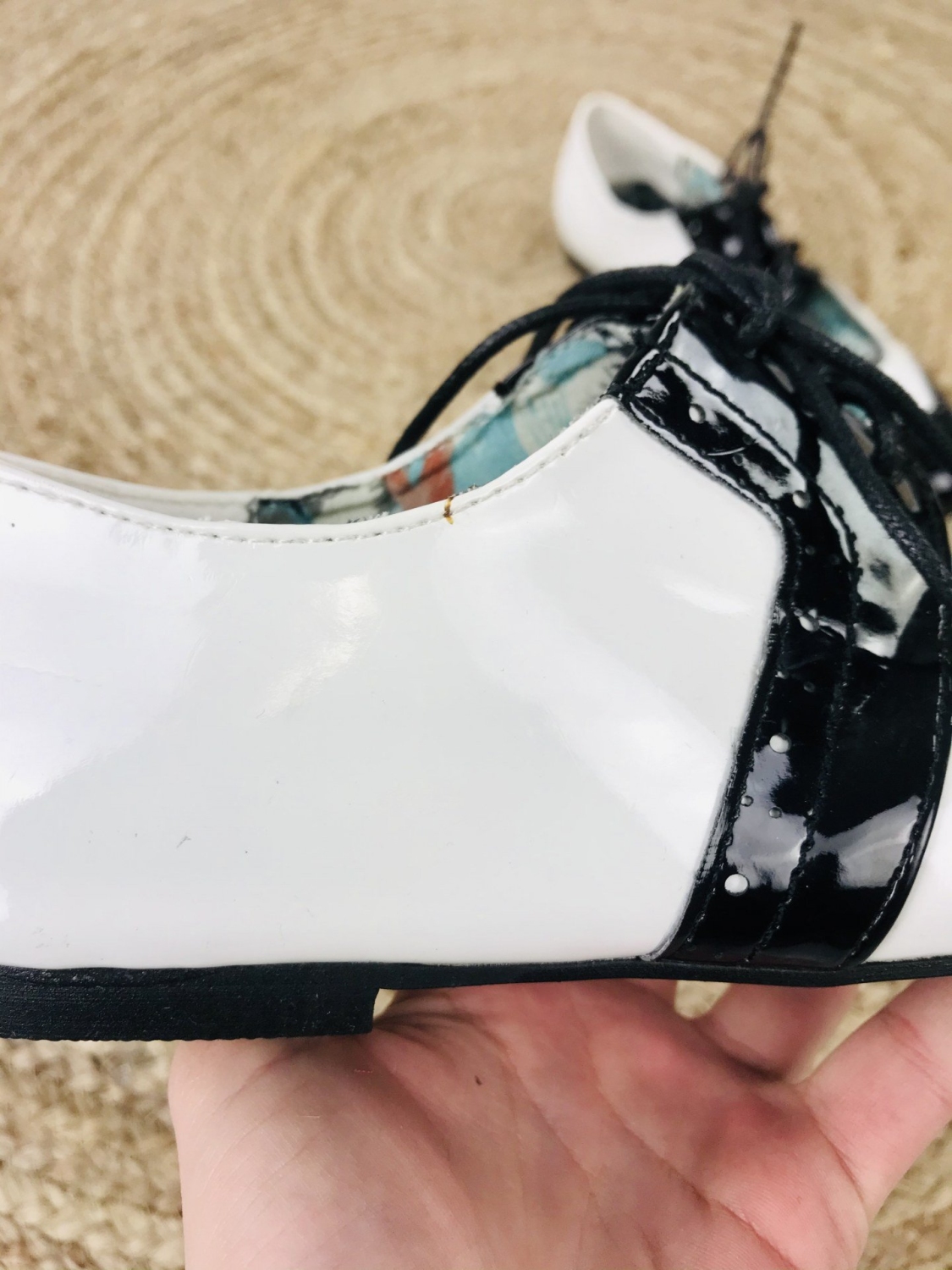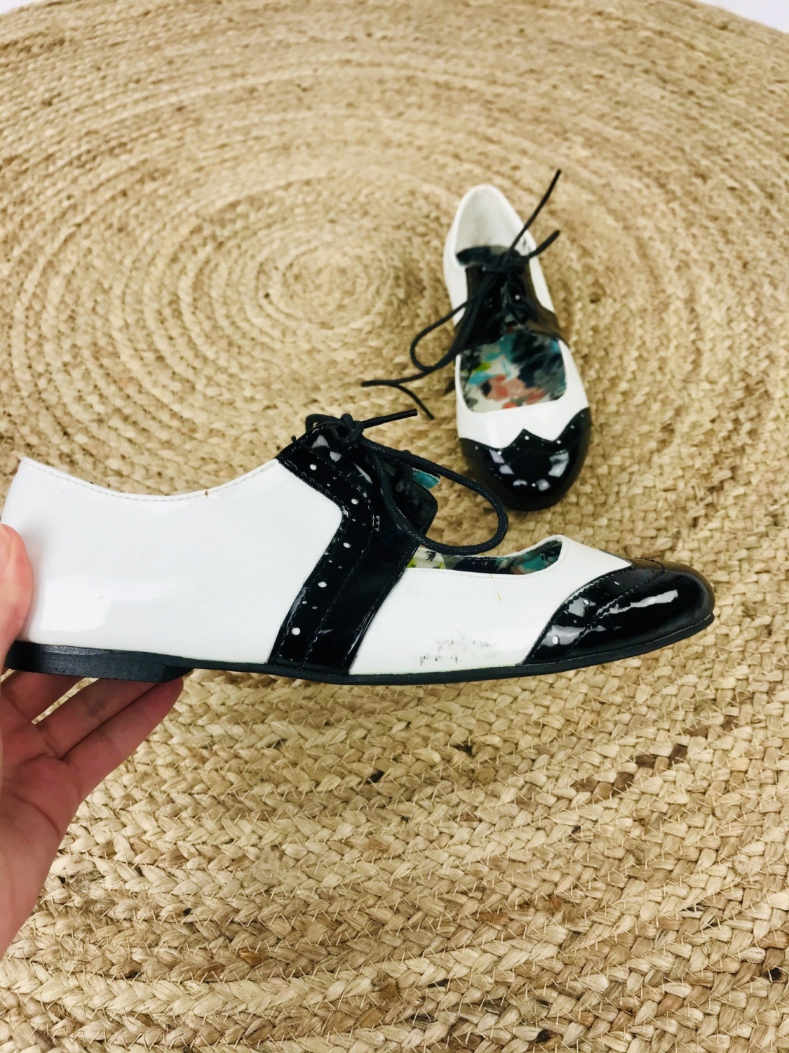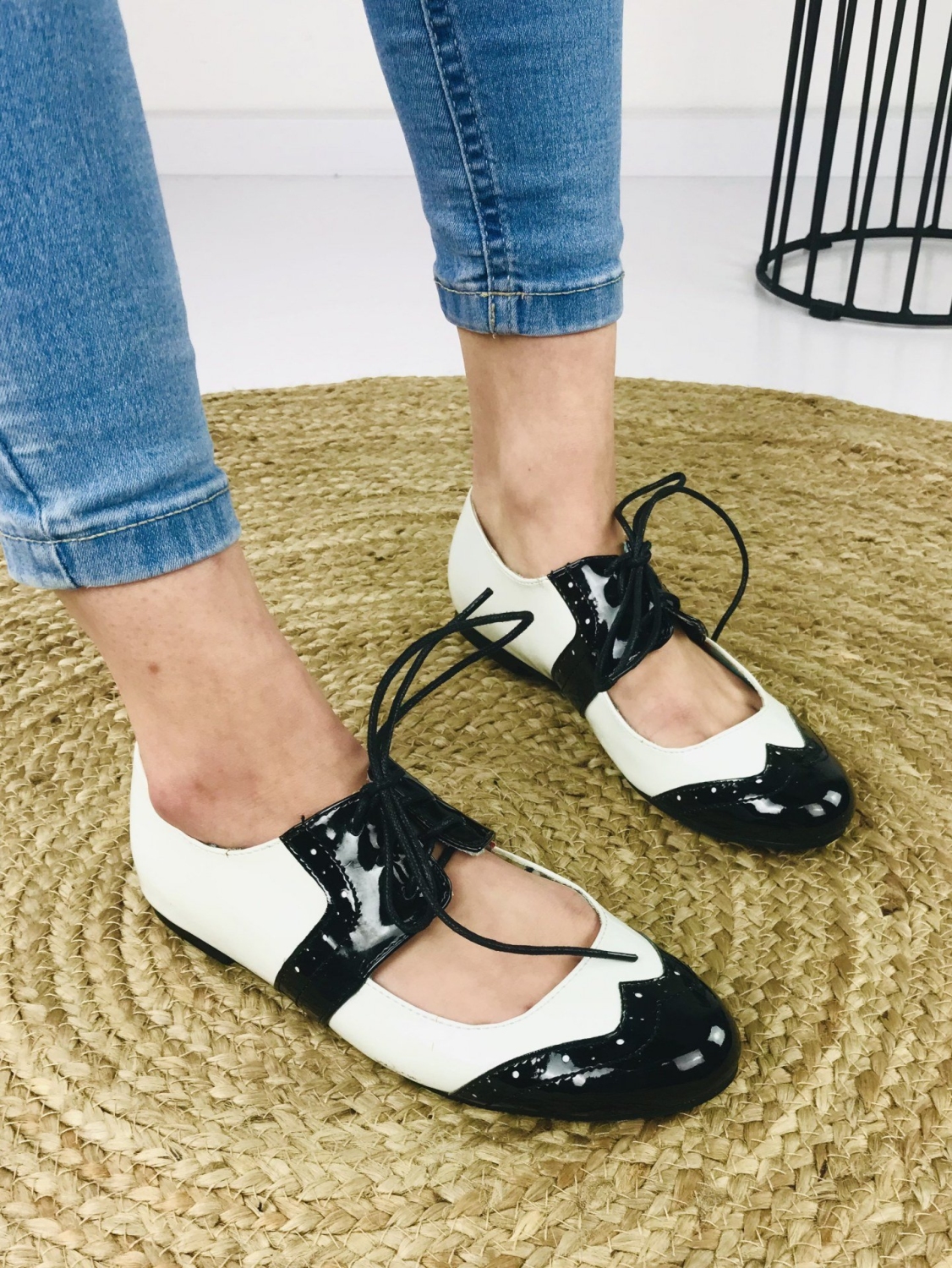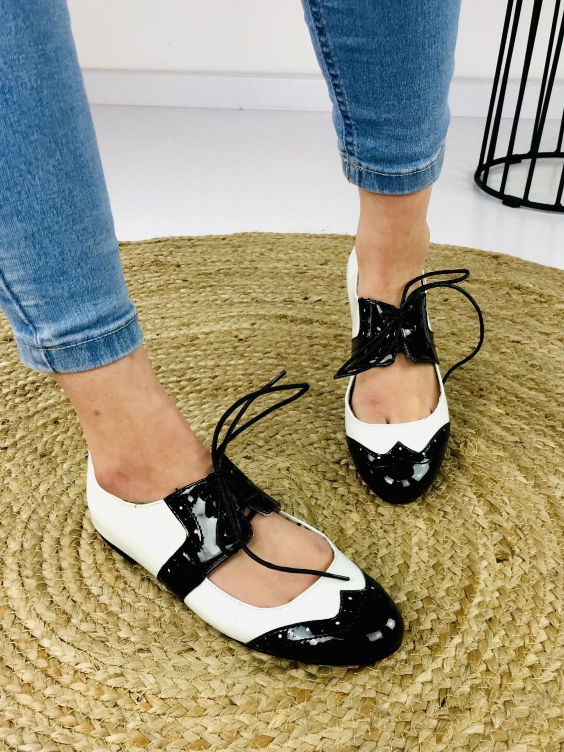 Dámske lakované mokasíny v čierno-bielej kombinácií. Vhodné na spoločenskú udalosť aj na bežné nosenie. Pohodlné vďaka šnúrkam, ktoré si stiahnete podľa potreby.
