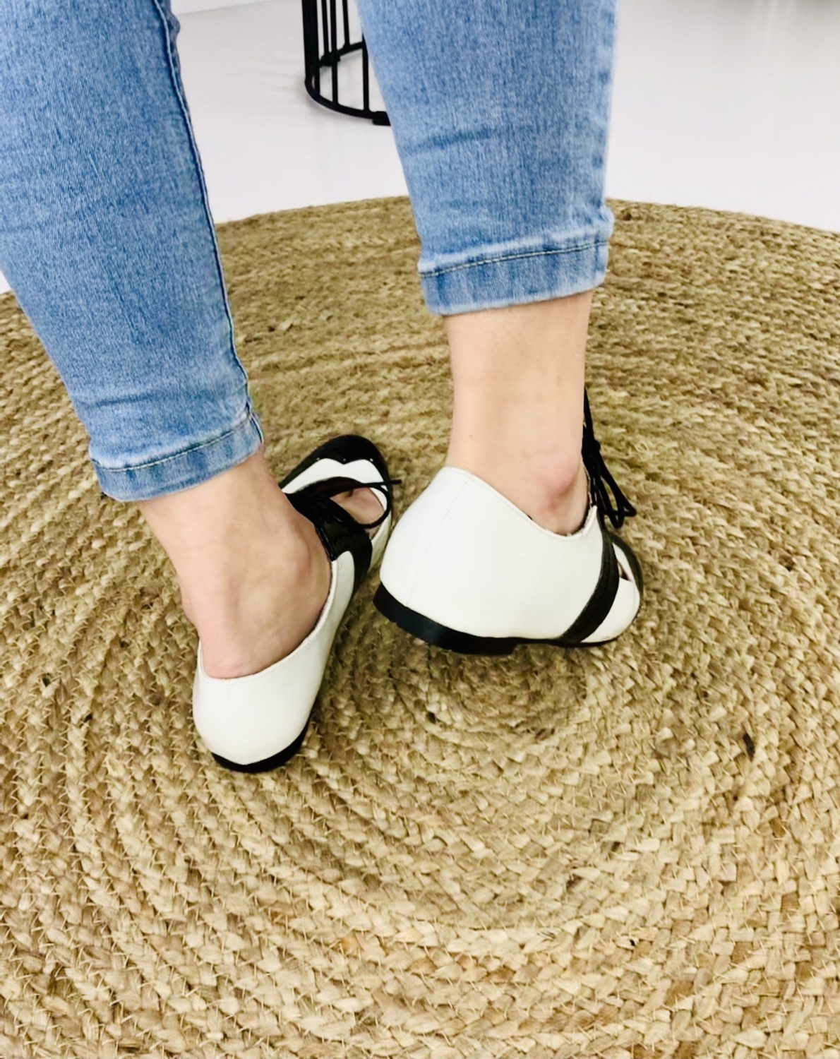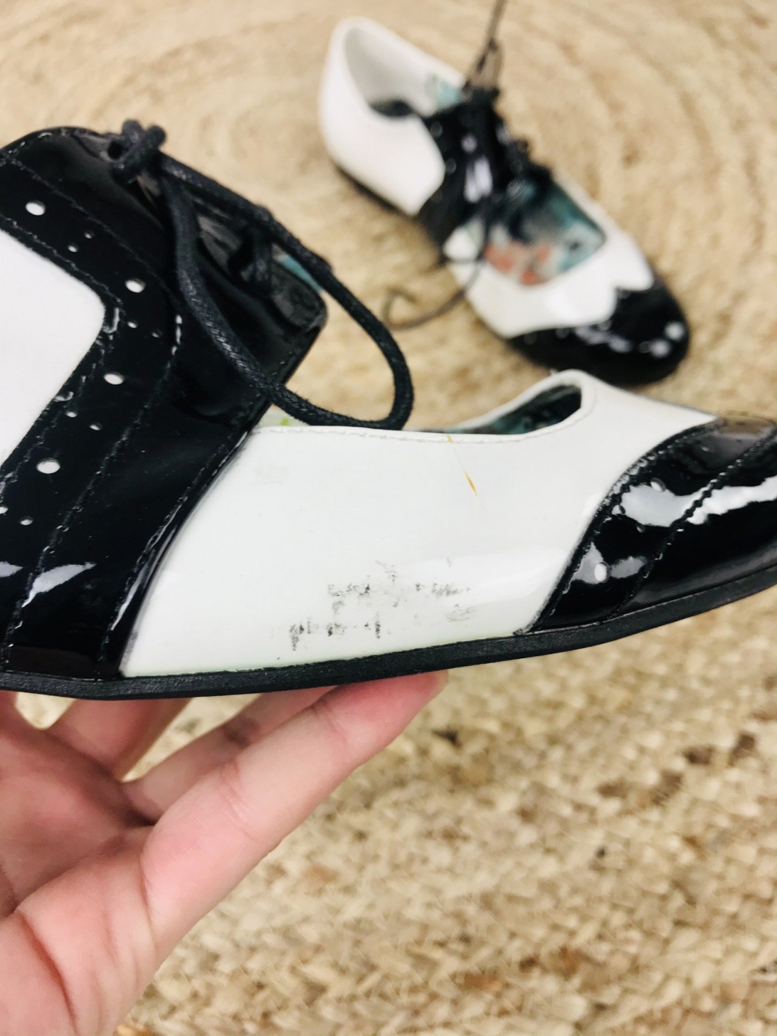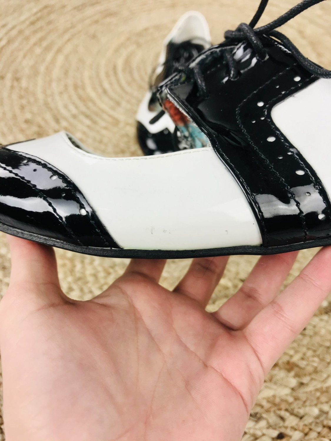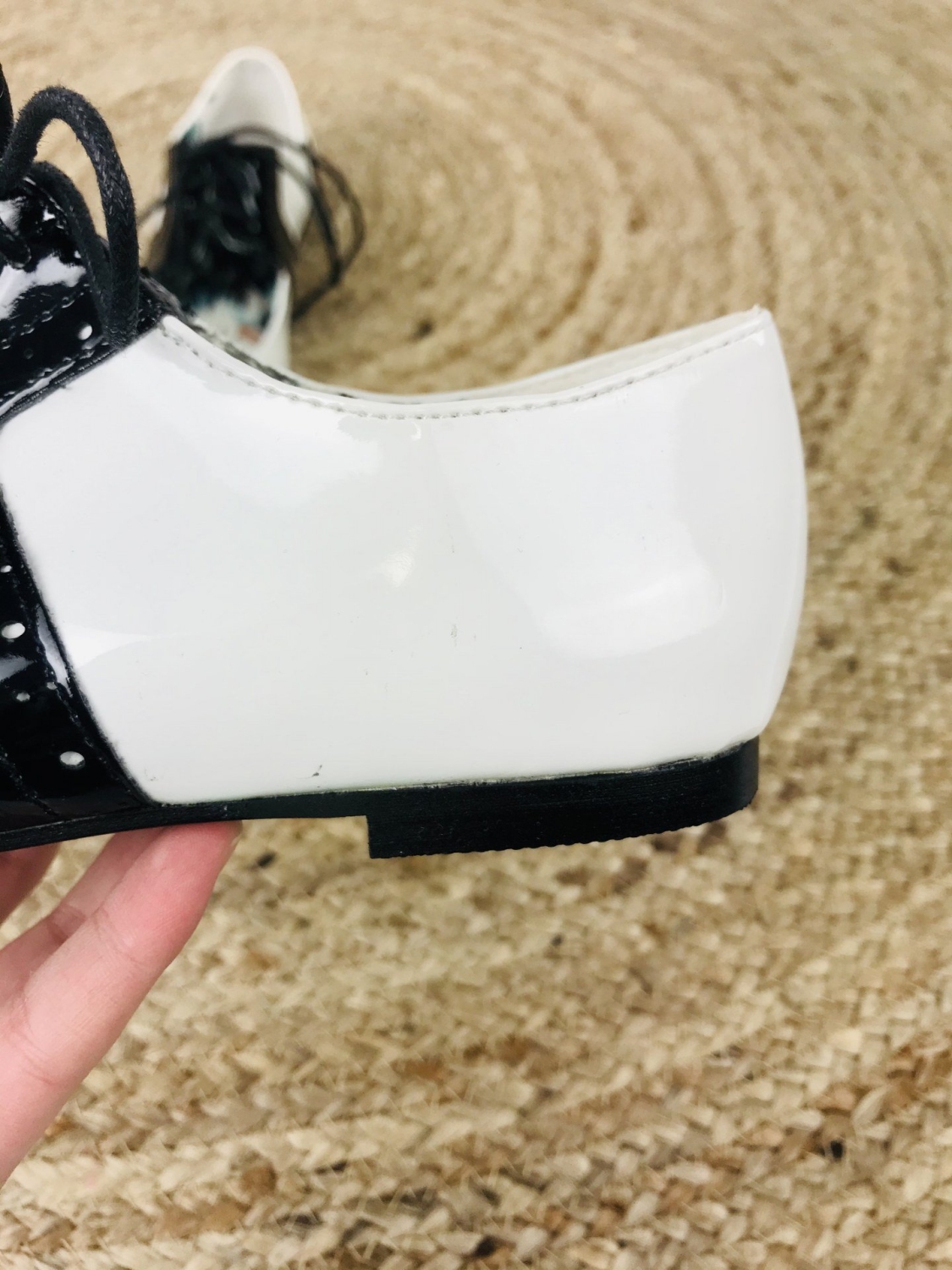 Dámske lakované mokasíny v čierno-bielej kombinácií. Vhodné na spoločenskú udalosť aj na bežné nosenie. Pohodlné vďaka šnúrkam, ktoré si stiahnete podľa potreby.