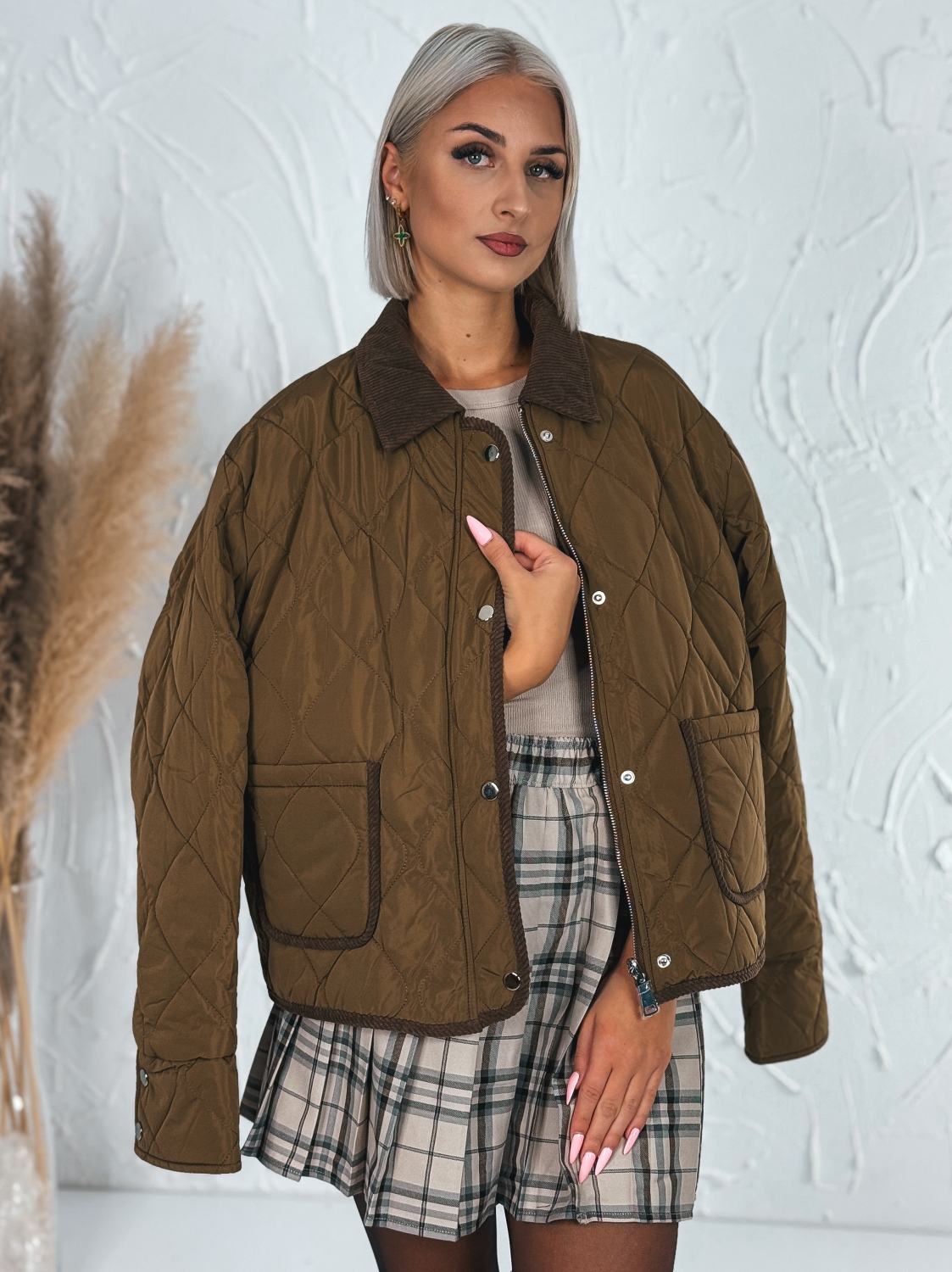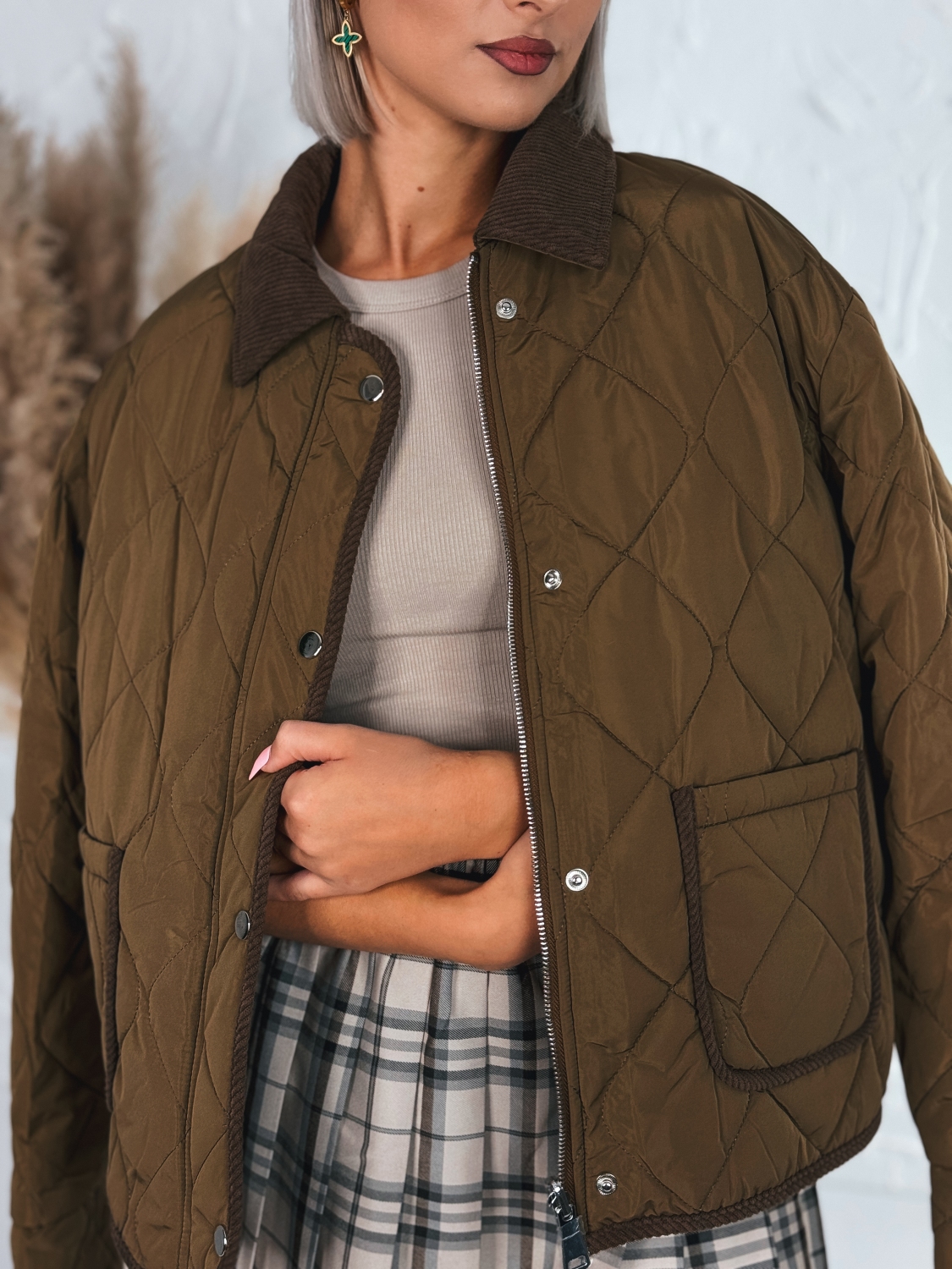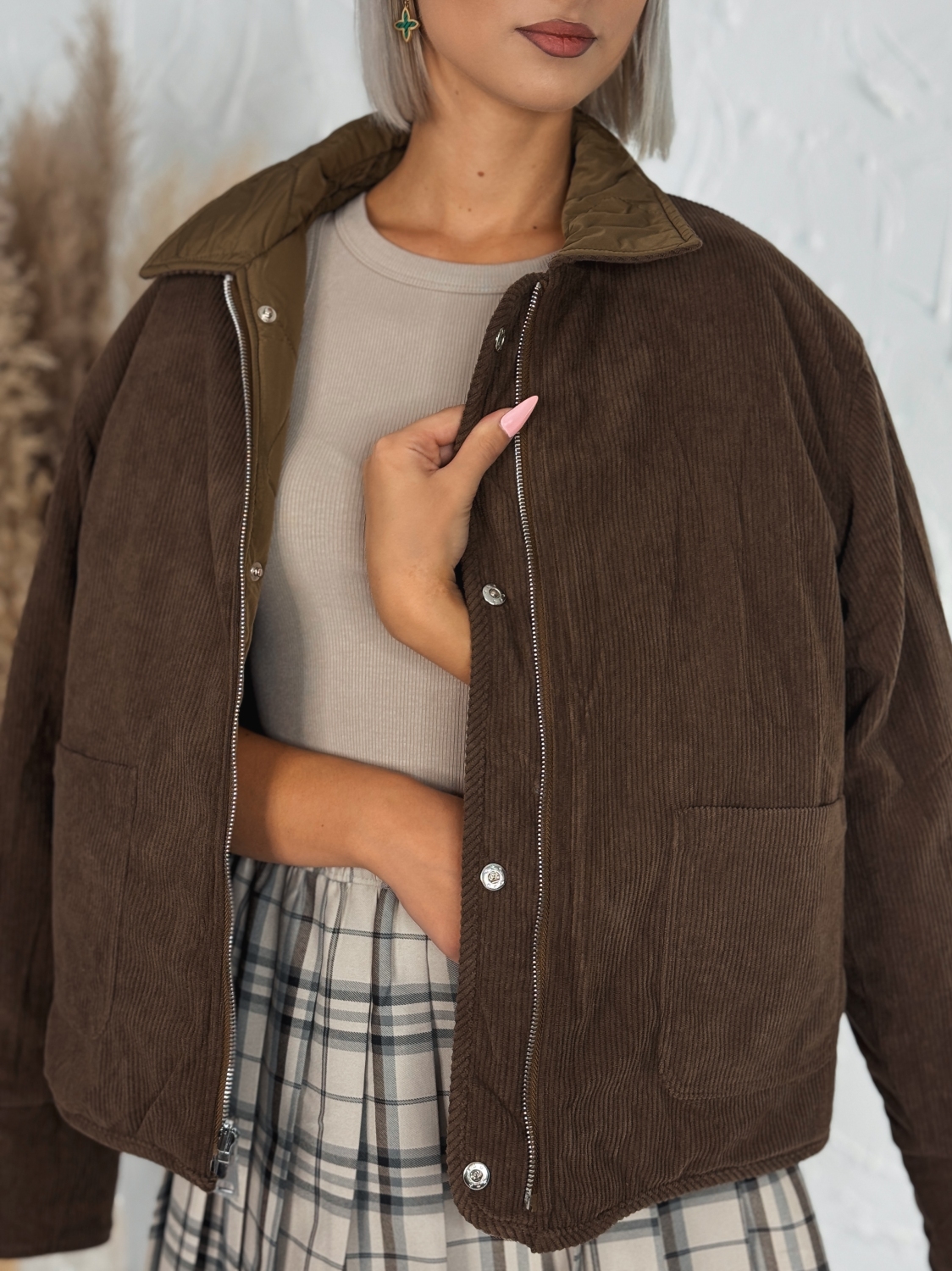 Predstavujeme dámsku obojstrannú bundu hnedej farby, ktorá v sebe spája dva štýly v jednom – z jednej strany pôsobí ako praktická vetrovka z hladkého, odolného materiálu, z druhej strany ako štýlová menčestrová bunda s jemnou textúrou. Vďaka tomuto originálnemu riešeniu si môžete prispôsobiť vzhľad podľa nálady či príležitosti – elegantný menčester na ležérny mestský look alebo športovo-voľnočasový vzhľad s vetrovkovou stranou. Bunda má vpredu dve praktické vrecká, do ktorých si pohodlne uložíte drobnosti, a zapína sa na zips, čo dodáva modelu funkčnosť a moderný charakter. Je ideálnou voľbou na prechodné obdobie, keď potrebujete štýlový, no zároveň praktický vrchný kúsok, ktorý vás ochráni pred chladom aj vetrom. Hnedá farba dodáva bunde nadčasový šmrnc a ľahko sa kombinuje s džínsami, legínami či sukňou. Tento originálny kúsok je skvelou voľbou pre ženy, ktoré ocenia variabilitu, komfort a štýl v jednom.