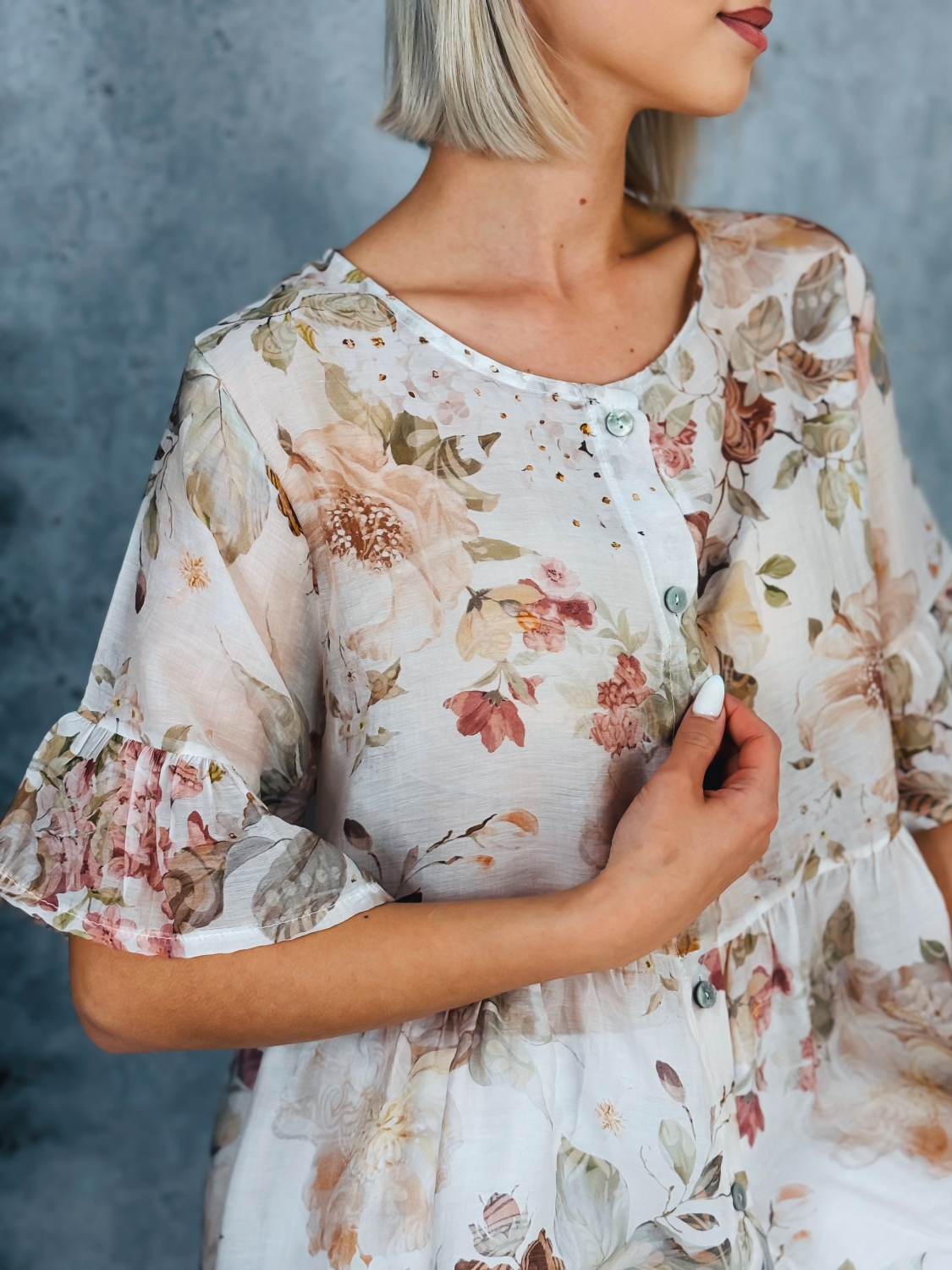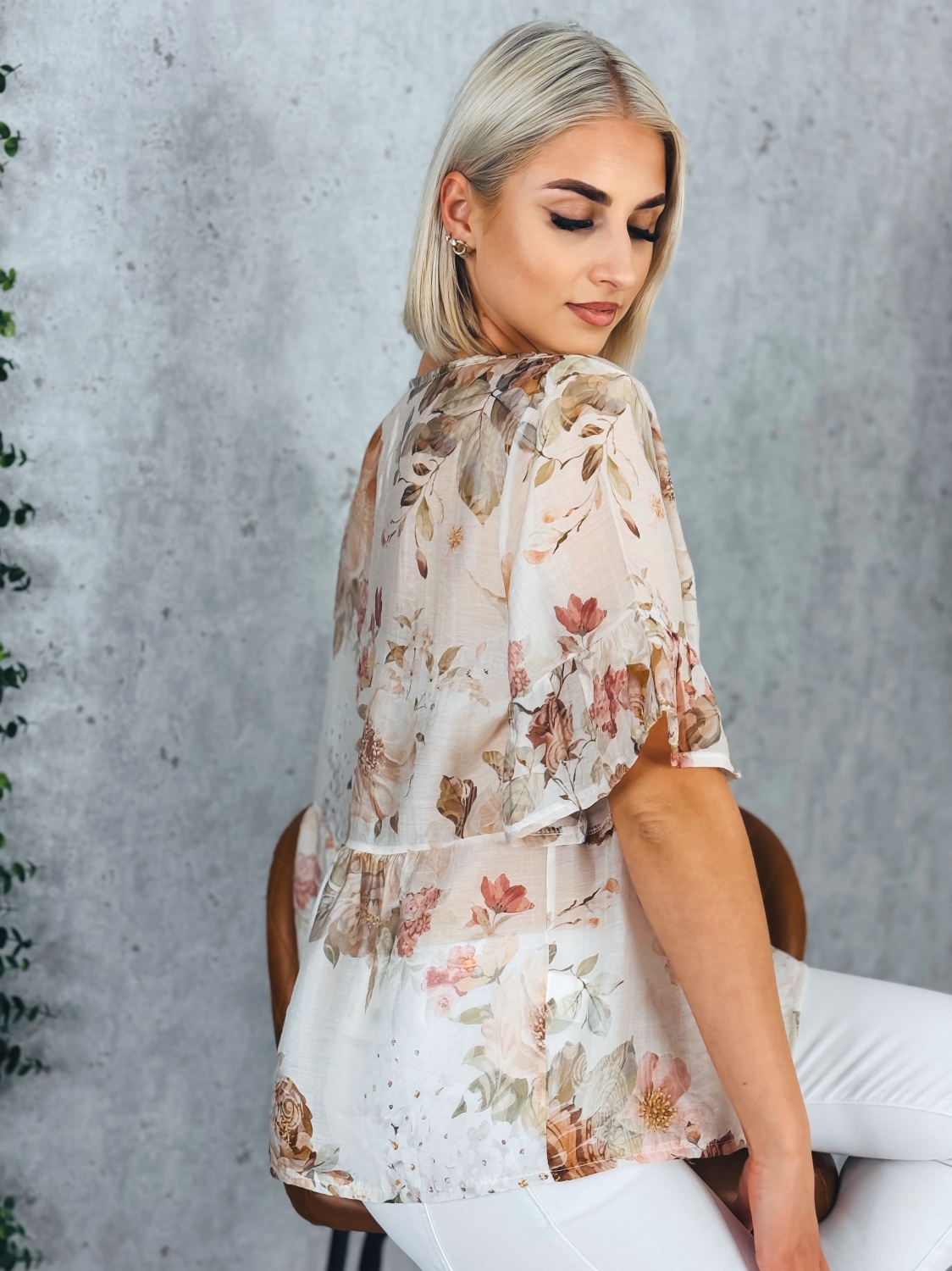 Dámska kvetovaná blúzka s gombíkmi a krátkym rukávom je ideálnym kúskom pre ženy, ktoré chcú spojiť eleganciu, pohodlie a svieži ženský štýl. Táto blúzka zaujme na prvý pohľad jemným kvetinovým vzorom, ktorý pôsobí romanticky a zároveň moderne. Vďaka svojej univerzálnosti je vhodná na každodenné nosenie do práce, na stretnutia s priateľmi, ale aj na rôzne spoločenské príležitosti. Blúzka je navrhnutá s dôrazom na detail. Predná časť je zdobená praktickým zapínaním na gombíky, ktoré nielenže uľahčuje obliekanie, ale zároveň dodáva celkovému vzhľadu jemne elegantný nádych. Krátke rukávy zabezpečujú pohodlie počas teplejších dní a umožňujú voľnosť pohybu, vďaka čomu sa budete cítiť príjemne po celý deň. Materiál blúzky je ľahký, priedušný a príjemný na dotyk, čo oceníte najmä počas jarných a letných mesiacov. Strih je navrhnutý tak, aby lichotil postave.