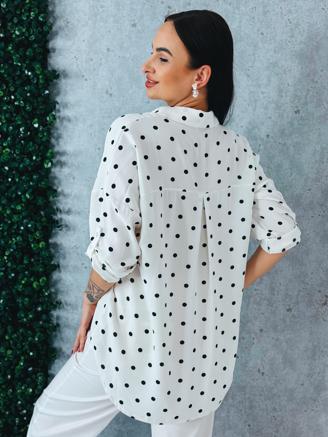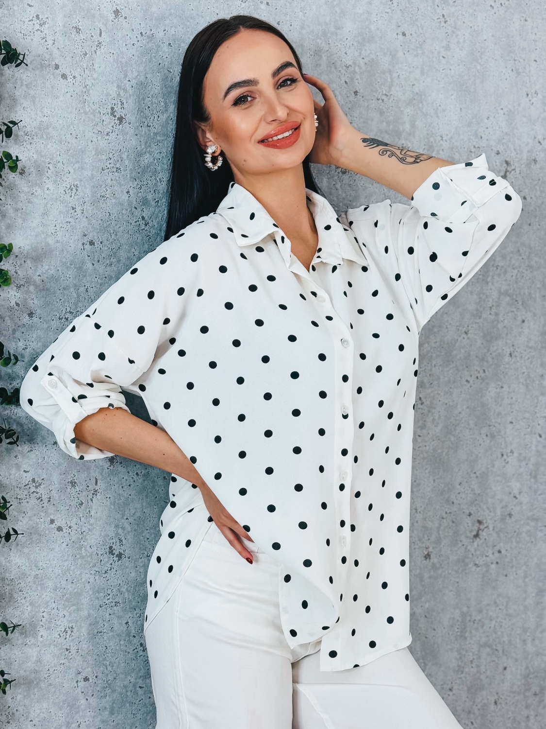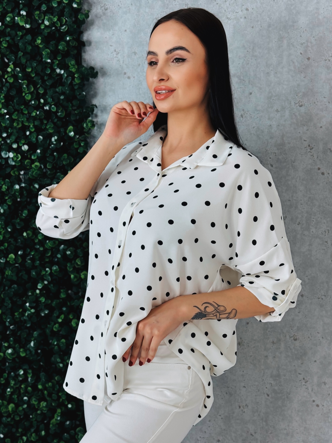 Doprajte si pohodlie a štýl v jednom s touto dámskou blúzkou v oversize strihu, ktorá je ideálnou voľbou pre ženy, ktoré milujú modernú eleganciu a voľnosť pohybu. Vďaka voľnému, vzdušnému strihu blúzka krásne padne na postave a zároveň poskytuje maximálne pohodlie počas celého dňa. Je skvelou voľbou na bežné nosenie, do práce, ale aj na stretnutia s priateľmi či neformálne spoločenské príležitosti. Blúzka je ozdobená jemným bodkovaným vzorom, ktorý dodáva celkovému vzhľadu hravosť a nadčasový šarm. Tento klasický vzor nikdy nevyjde z módy a jednoducho sa kombinuje s rôznymi kúskami vo vašom šatníku. Oversize strih zároveň pôsobí moderne a štýlovo, pričom lichotí rôznym typom postavy. Ľahký a príjemný materiál zabezpečuje komfort pri nosení a krásne splýva pri pohybe.