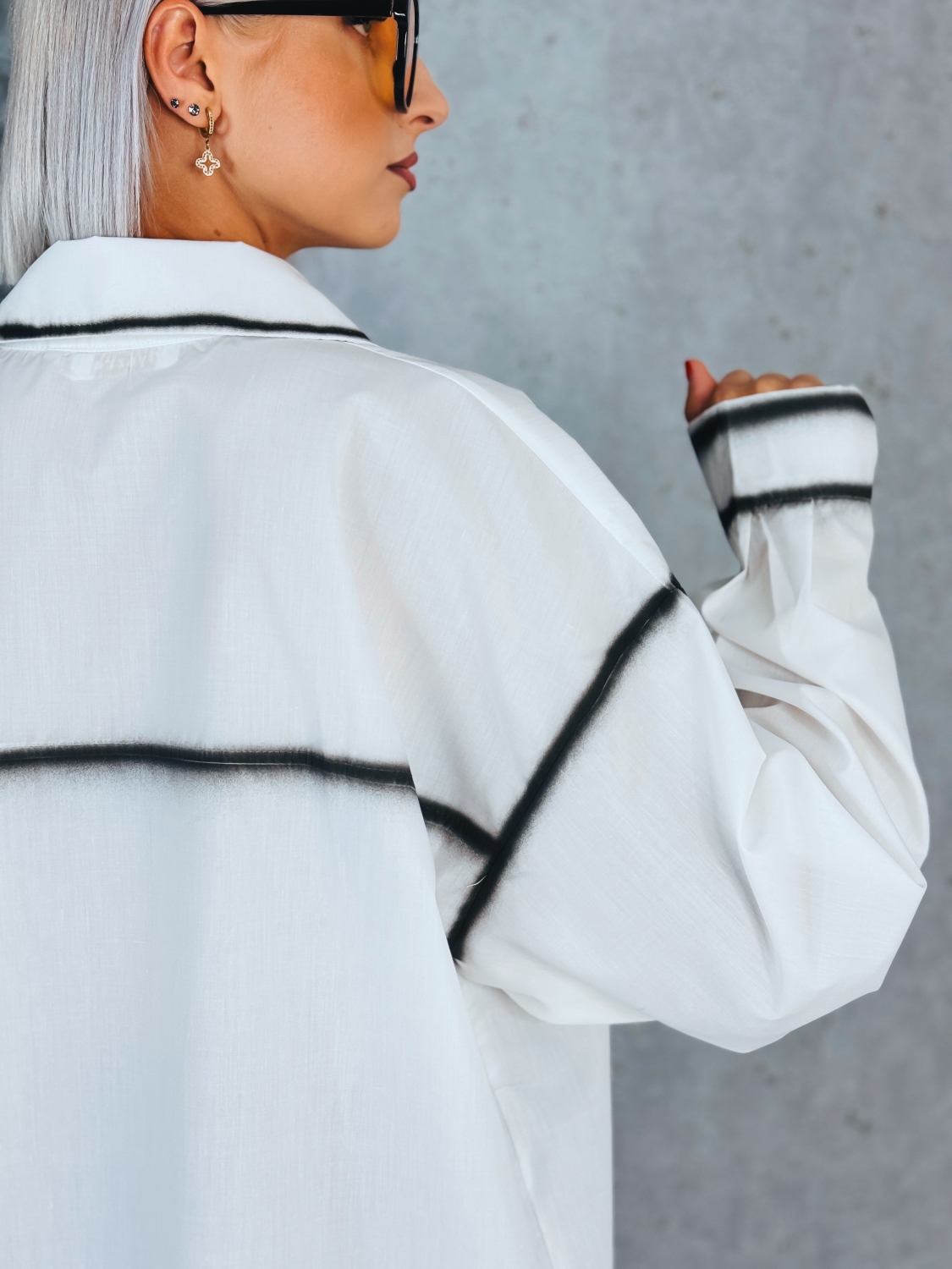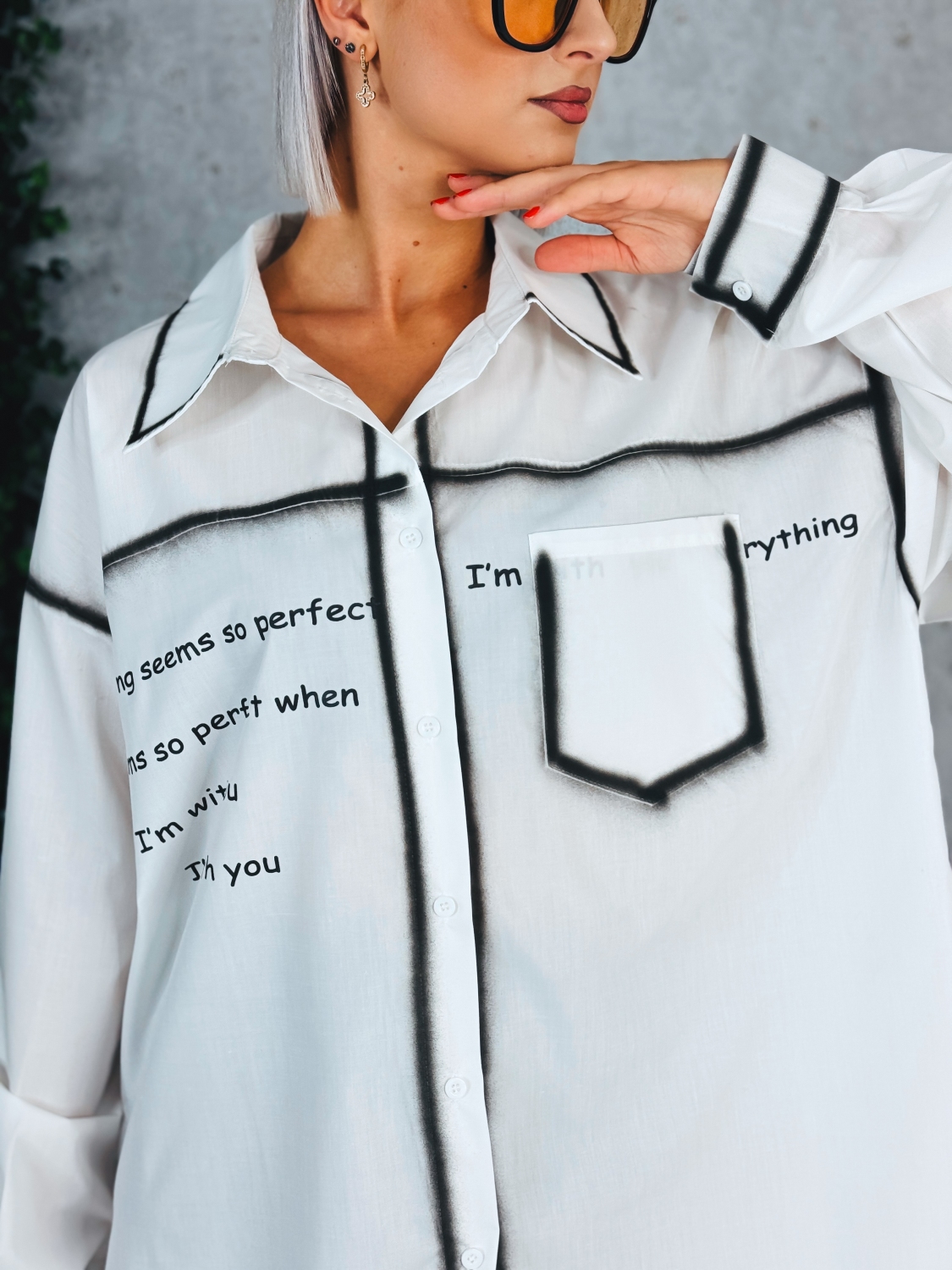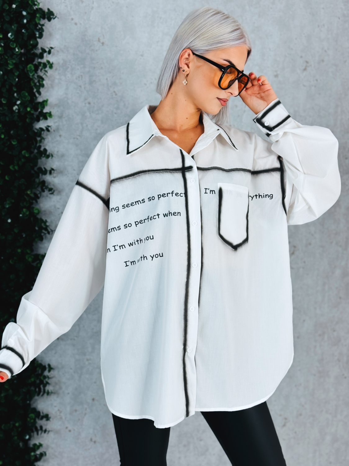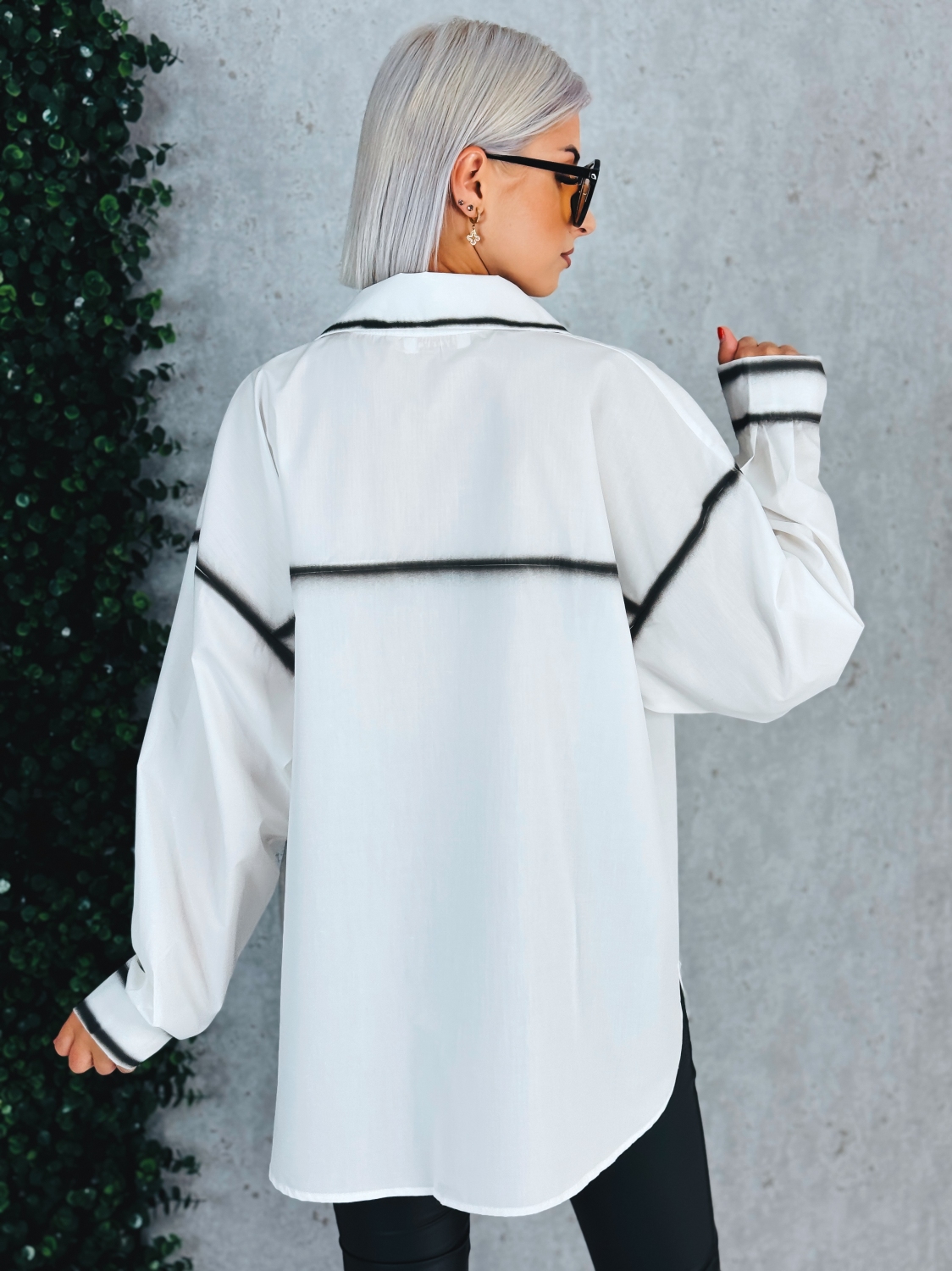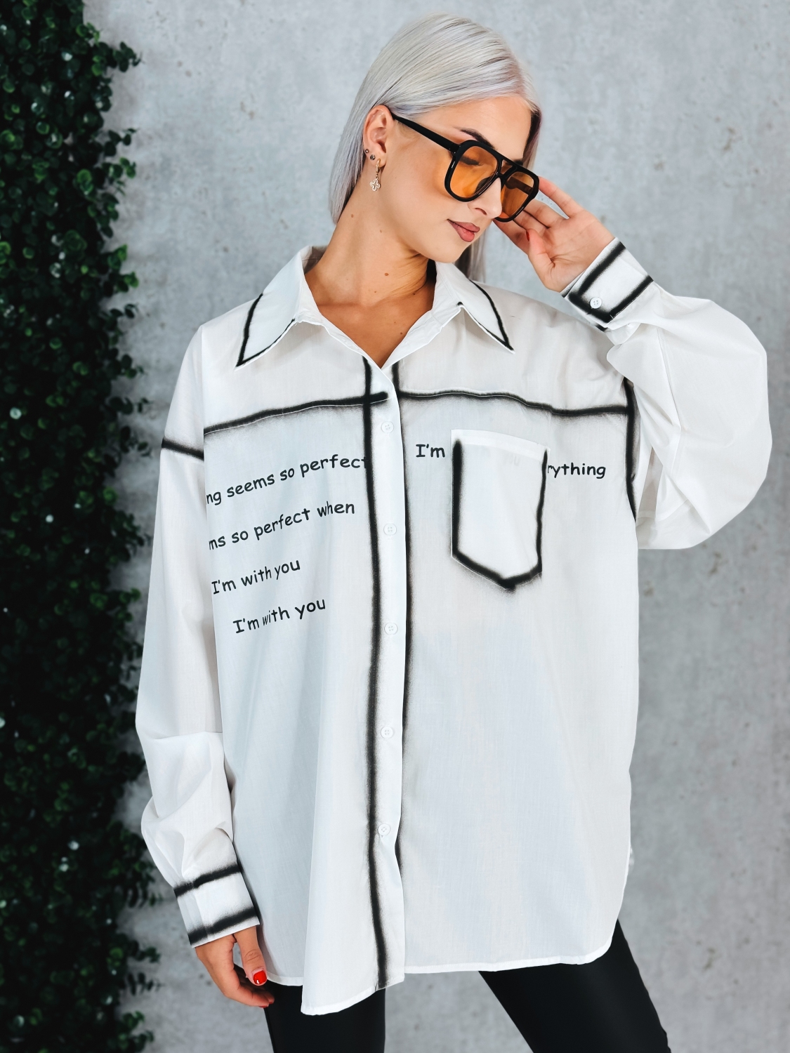 Dámska oversize košeľa s kontrastnými detailmi a nápisom. Táto trendy oversize košeľa je dokonalým spojením originality a pohodlia. Biela aj čierna farebná varianta prináša moderný look, ktorý sa hodí na každodenné nosenie. Výrazným prvkom sú kontrastné čierne lemy okolo goliera, gombíkovej légy, vrecka a rukávov, ktoré košeli dodávajú jedinečný charakter. Predná časť je ozdobená decentnými nápismi, ktoré pôsobia ako módny detail a podčiarkujú uvoľnený vibe. Zadná strana košele zostáva čistá, vďaka čomu pôsobí elegantne a ľahko kombinovateľne.Oversize strih je nielen pohodlný, ale aj veľmi univerzálny – košeľu môžeš nosiť k legínam, džínsom či elegantným nohaviciam.