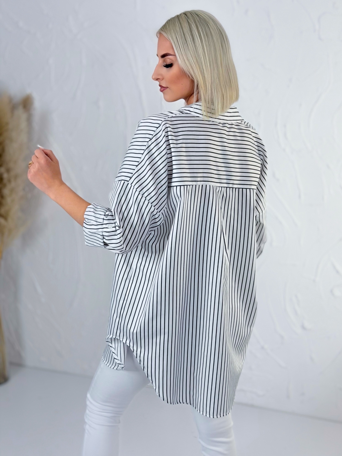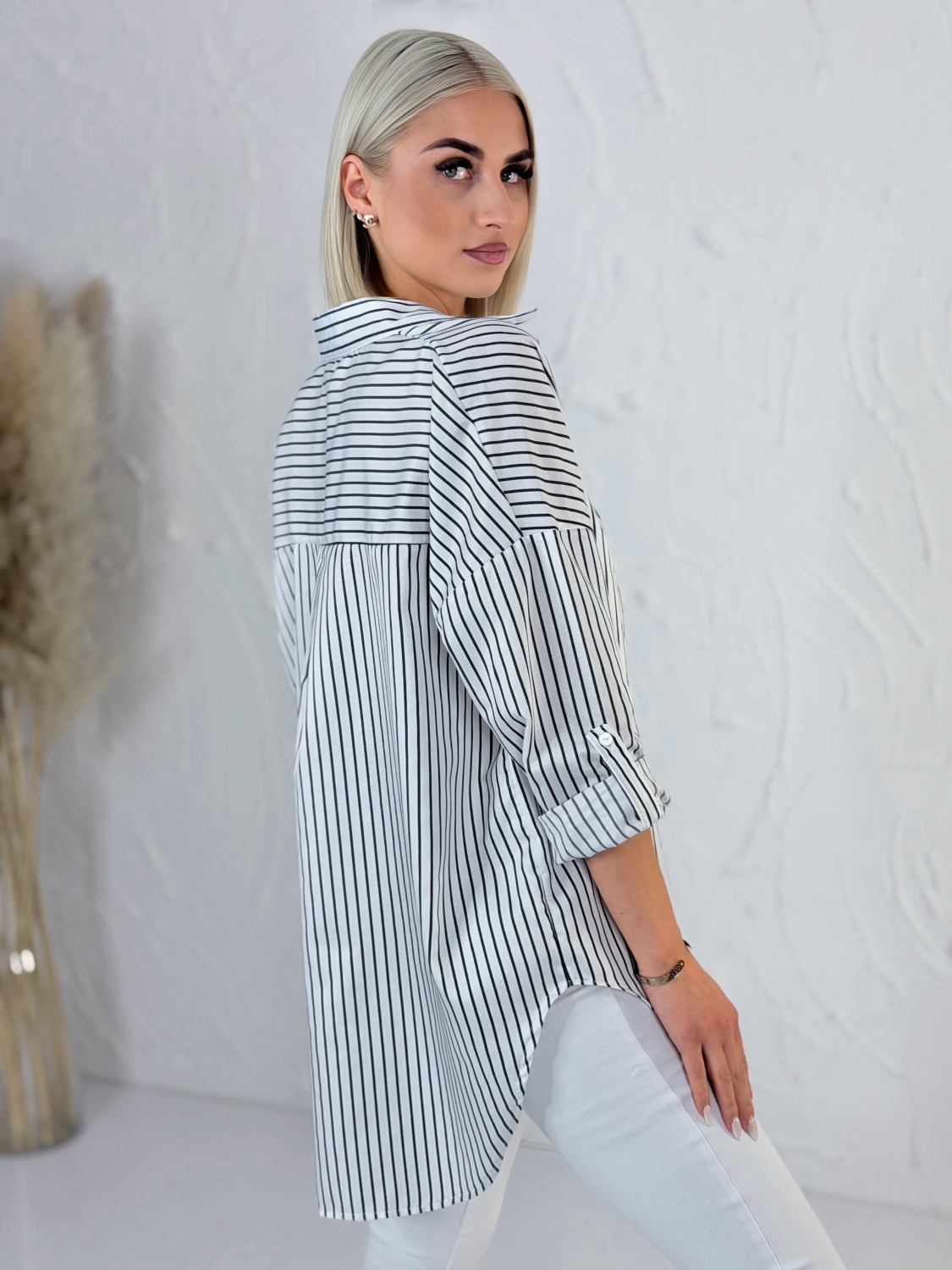 Táto štýlová pruhovaná košeľa s klasickým golierom je ideálnym kúskom pre každodenné nosenie aj ležérne elegantné kombinácie. Vyznačuje sa nadčasovým dizajnom s jemnými prúžkami, ktoré pôsobia sviežo a zároveň veľmi žensky. Vďaka oversize strihu krásne sadne každej postave, poskytuje maximálne pohodlie a voľnosť pohybu, pričom si zachováva moderný a upravený vzhľad. Košeľa má dlhé rukávy, ktoré si môžete podľa potreby vyhrnúť pre uvoľnenejší look alebo ich nechať spustené pre klasickejší štýl. Praktické predné vrecko dodáva košeli nielen štýlový detail, ale aj funkčnosť. Predĺžený strih je ideálny na nosenie k nohaviciam, legínam aj sukniam a ľahko sa kombinuje s rôznymi kúskami vo vašom šatníku. Materiál je príjemný na dotyk a vhodný na celodenné nosenie. Táto košeľa je skvelou voľbou pre ženy, ktoré hľadajú spojenie komfortu, štýlu a univerzálnosti v jednom kúsku.