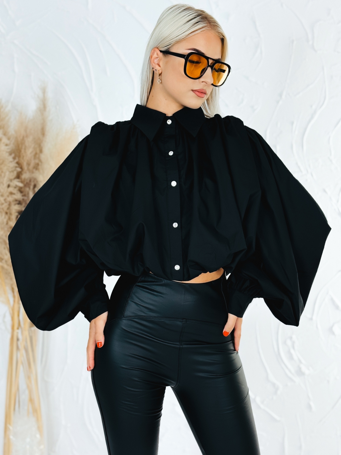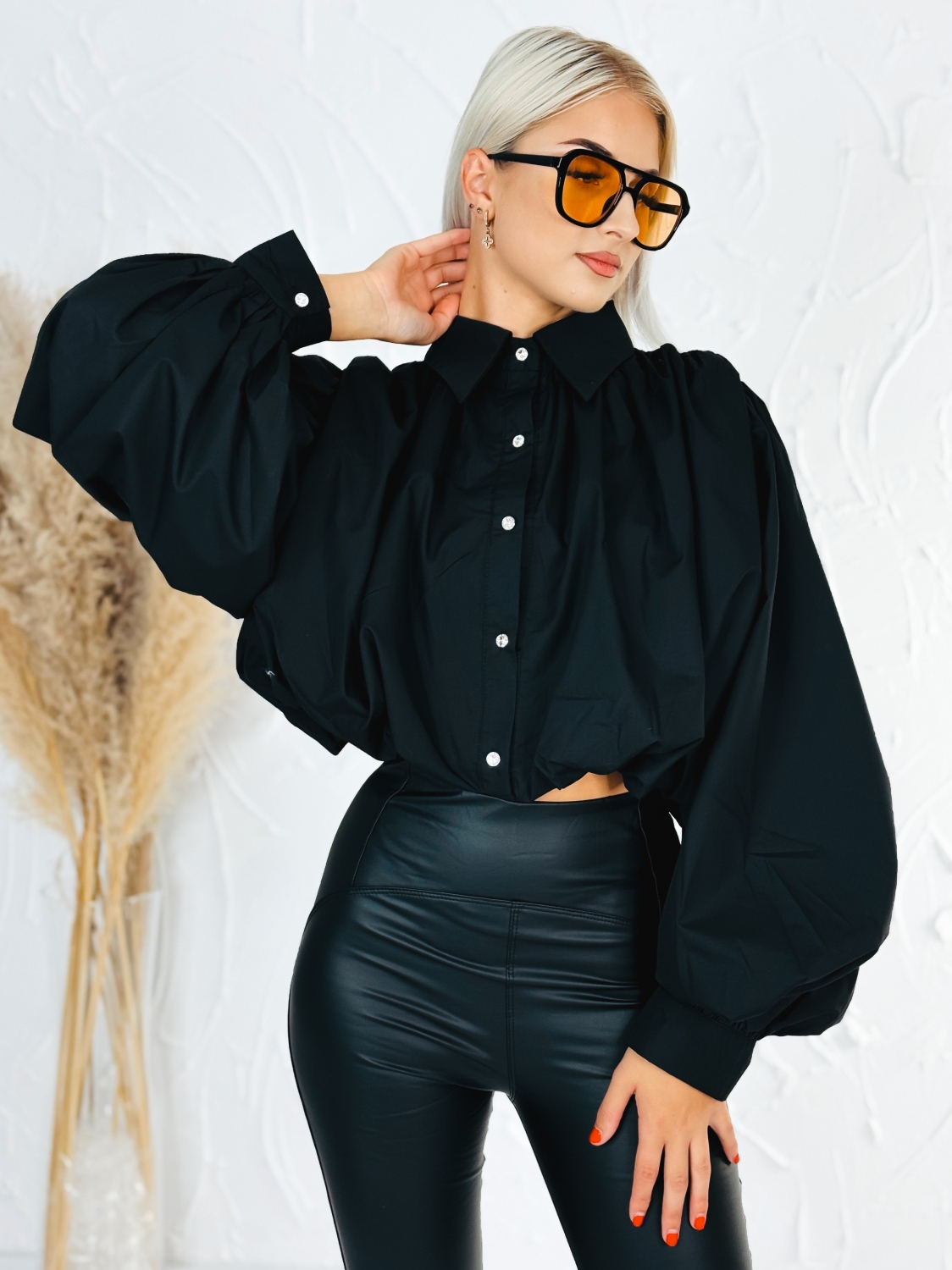 Elegantná dámska čierna crop-top košeľa s balónovými rukávmi je trendy kúskom, ktorý dodá vášmu outfitu šmrnc a ženský pôvab. Kratší strih zvýrazní pás, zatiaľ čo výrazné rukávy pôsobia štýlovo a originálne. Vďaka univerzálnej čiernej farbe ju ľahko skombinujete s džínsami, sukňou alebo elegantnými nohavicami. Ľahký a príjemný materiál zabezpečí pohodlie počas celého dňa. Tento nadčasový kúsok je ideálny na bežné nosenie, večerné posedenia aj špeciálne príležitosti. Crop-top košeľa s balónovými rukávmi je must-have pre každú modernú ženu, ktorá sa nebojí vyniknúť.