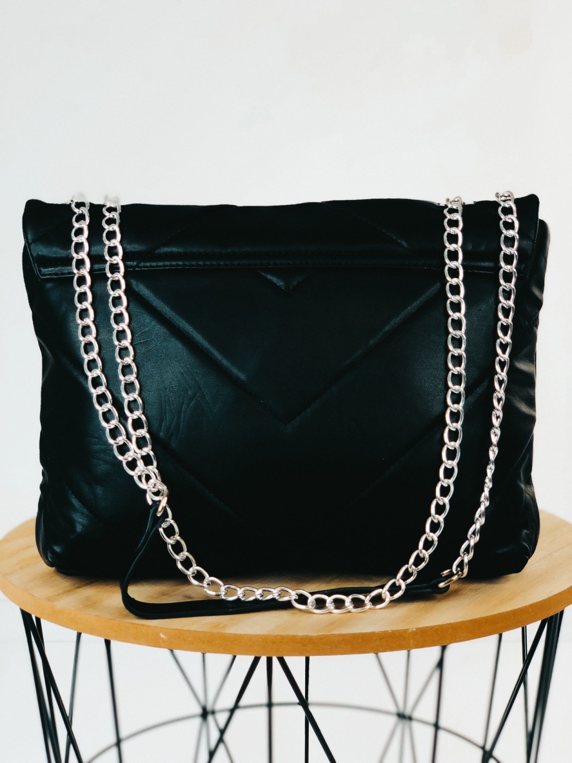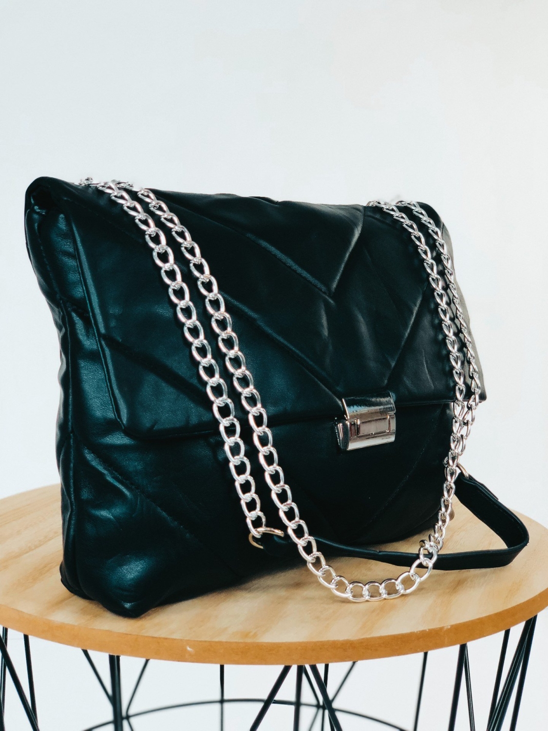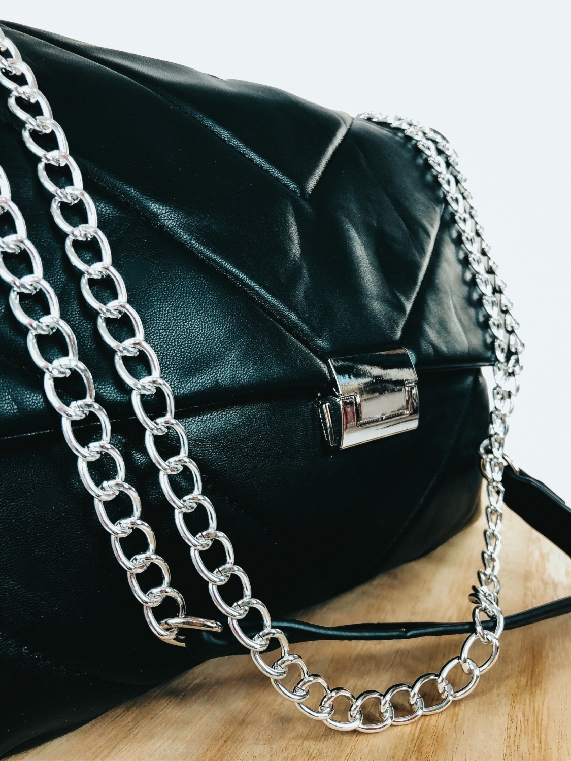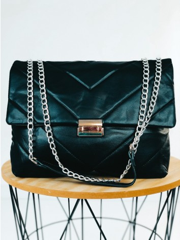 Dámska exkluzívna kabelka so striebornou reťazou, ktorú už nebudete chcieť odložiť. Stane sa Vaším najobľúbenejším kúskom. Je ideálnym doplnkom ku každému outfitu. Pevný, poddajný materiál a dostatočný priestor vo vnútri Vám zabezpečí dostatok priestoru na bežné veci, diár, kozmetiku a podobne. Túto kabelku s ozdobnou retiazkou môžete nosiť ako v bežný deň, tak aj na spoločenské udalosti, ako sú oslavy, večierky, či nočné párty. Zapínanie kabelky je na cvok, vnútro kabelky sa zapína na zips. Nosnosť kabelky 2 kg.
