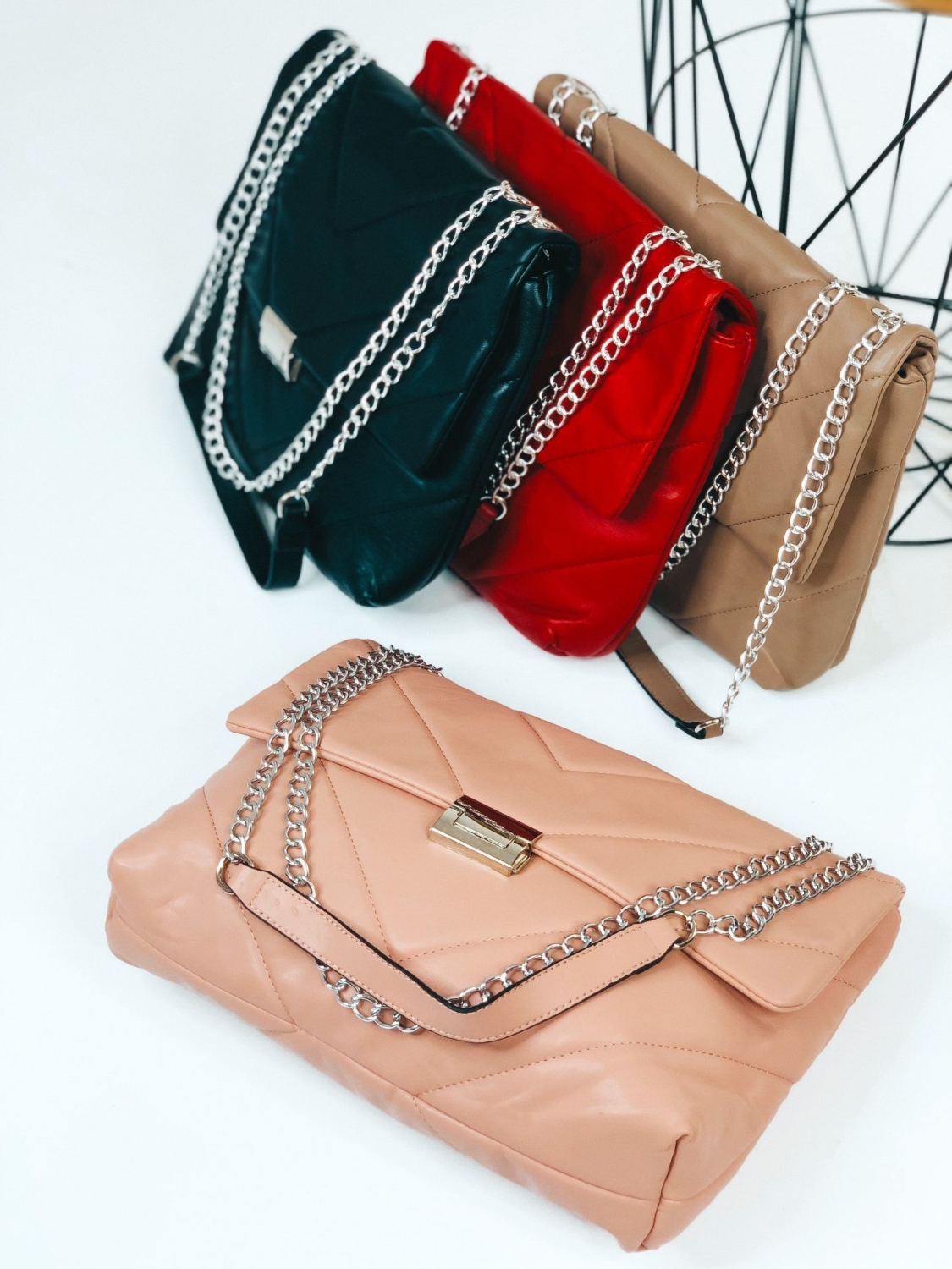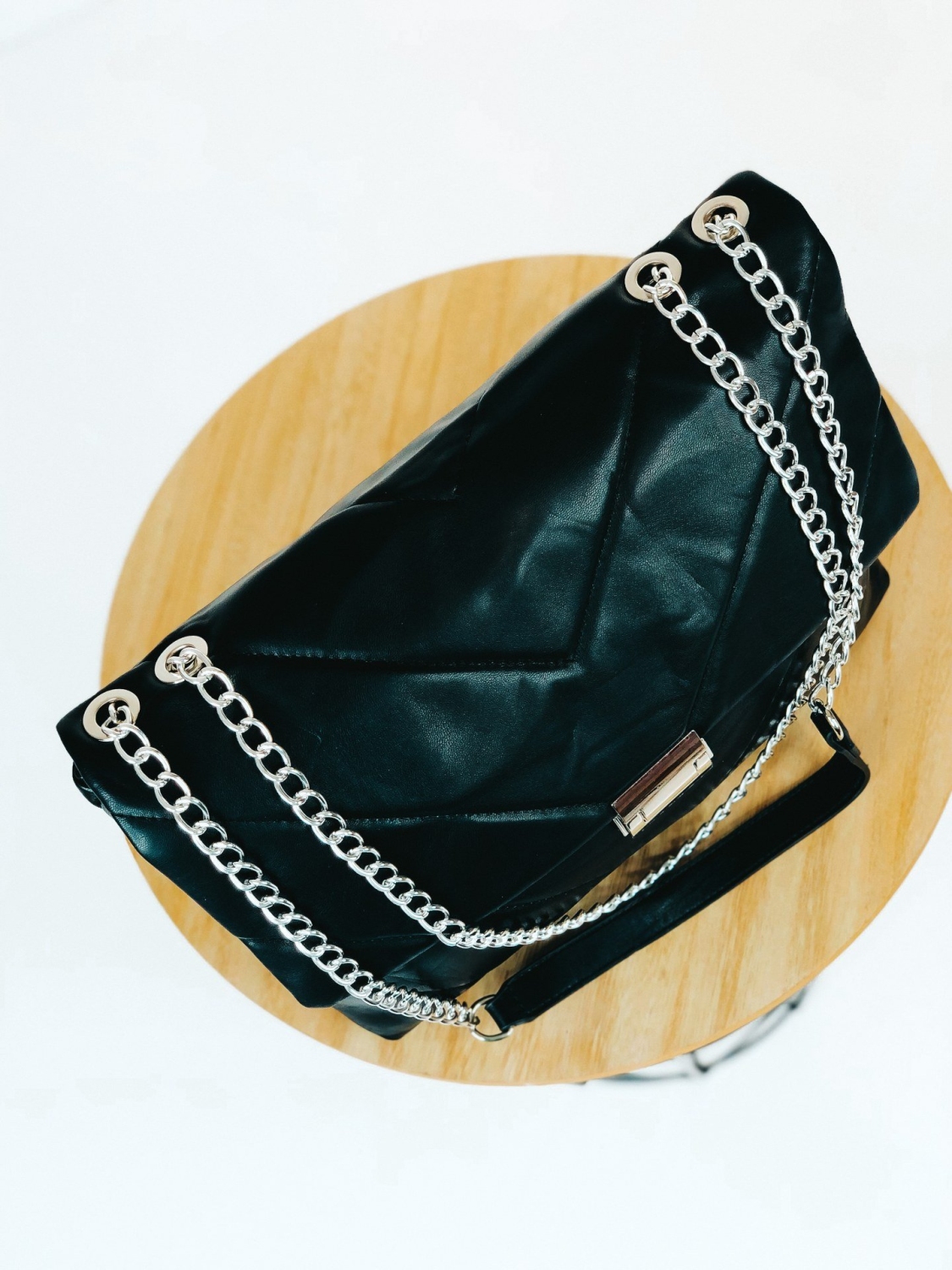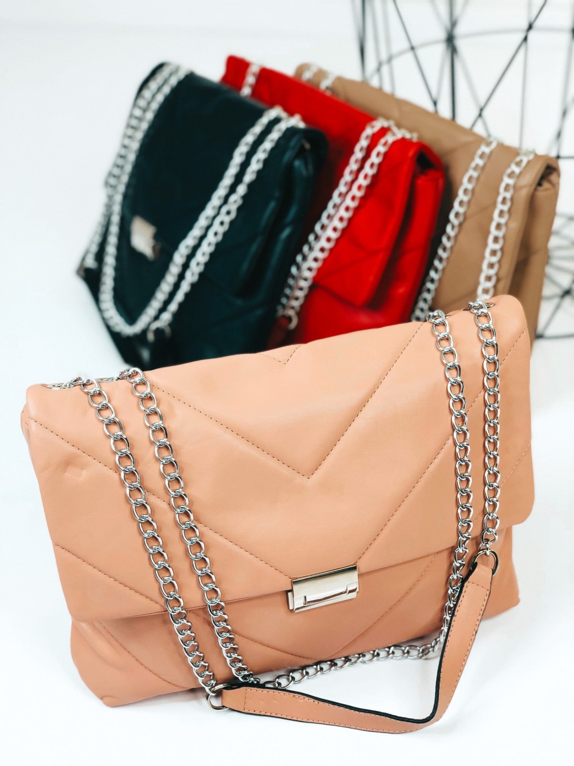 Dámska exkluzívna kabelka so striebornou reťazou, ktorú už nebudete chcieť odložiť. Stane sa Vaším najobľúbenejším kúskom. Je ideálnym doplnkom ku každému outfitu. Pevný, poddajný materiál a dostatočný priestor vo vnútri Vám zabezpečí dostatok priestoru na bežné veci, diár, kozmetiku a podobne. Túto kabelku s ozdobnou retiazkou môžete nosiť ako v bežný deň, tak aj na spoločenské udalosti, ako sú oslavy, večierky, či nočné párty. Zapínanie kabelky je na cvok, vnútro kabelky sa zapína na zips. Nosnosť kabelky 2 kg.