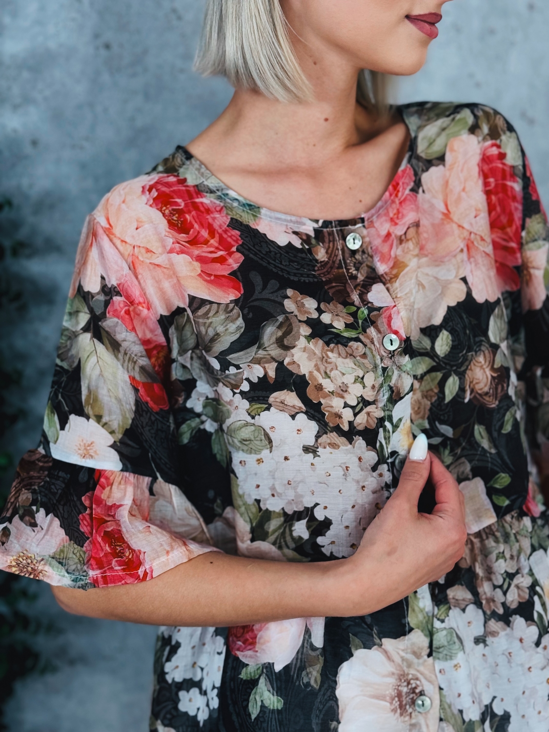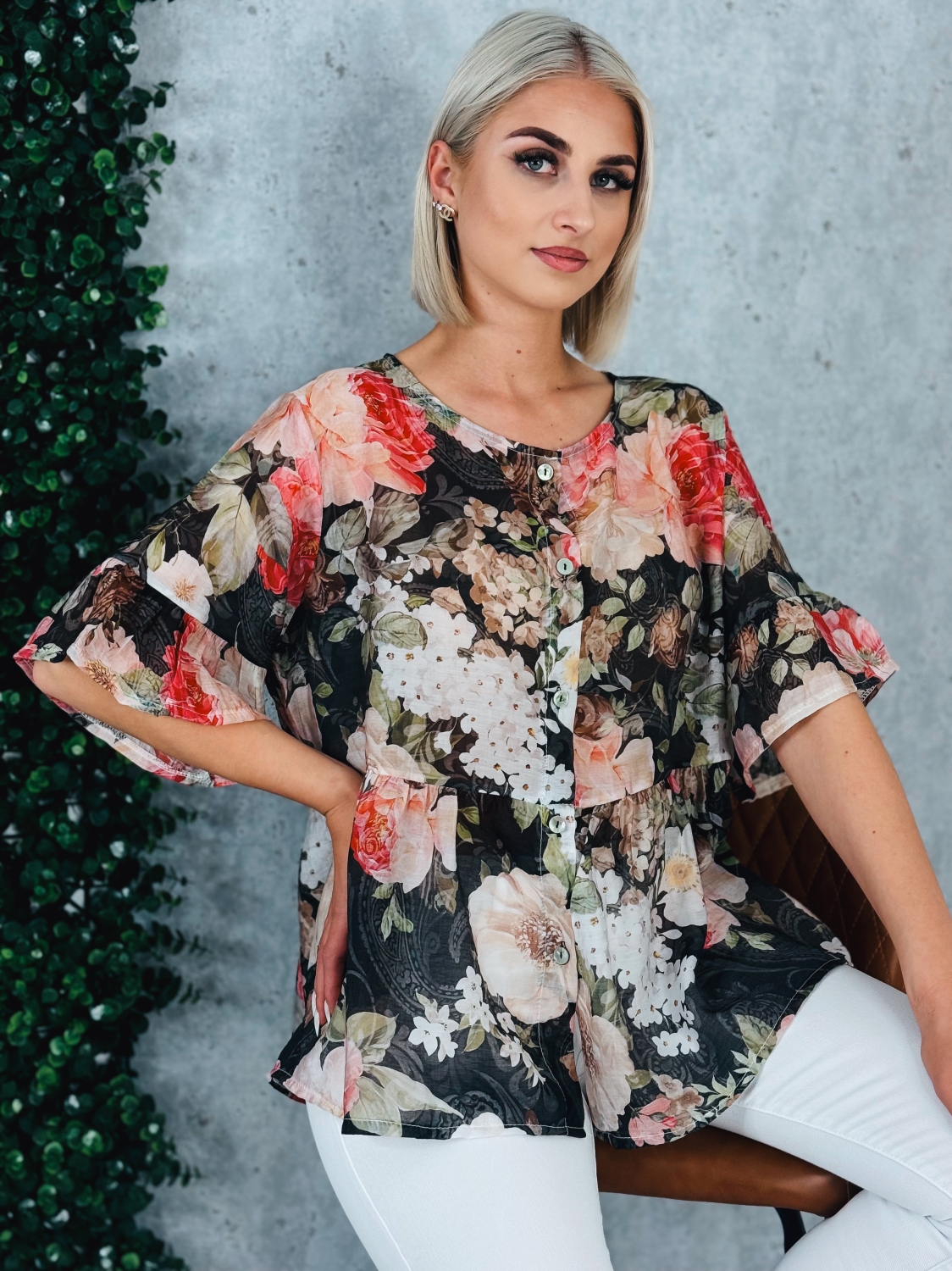Dámska kvetovaná blúzka s gombíkmi a krátkym rukávom je ideálnym kúskom pre ženy, ktoré chcú spojiť eleganciu, pohodlie a svieži ženský štýl. Táto blúzka zaujme na prvý pohľad jemným kvetinovým vzorom, ktorý pôsobí romanticky a zároveň moderne. Vďaka svojej univerzálnosti je vhodná na každodenné nosenie do práce, na stretnutia s priateľmi, ale aj na rôzne spoločenské príležitosti. Blúzka je navrhnutá s dôrazom na detail. Predná časť je zdobená praktickým zapínaním na gombíky, ktoré nielenže uľahčuje obliekanie, ale zároveň dodáva celkovému vzhľadu jemne elegantný nádych. Krátke rukávy zabezpečujú pohodlie počas teplejších dní a umožňujú voľnosť pohybu, vďaka čomu sa budete cítiť príjemne po celý deň. Materiál blúzky je ľahký, priedušný a príjemný na dotyk, čo oceníte najmä počas jarných a letných mesiacov. Strih je navrhnutý tak, aby lichotil postave.