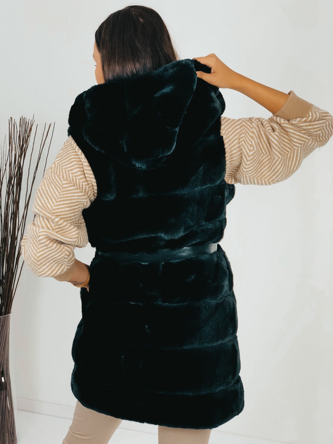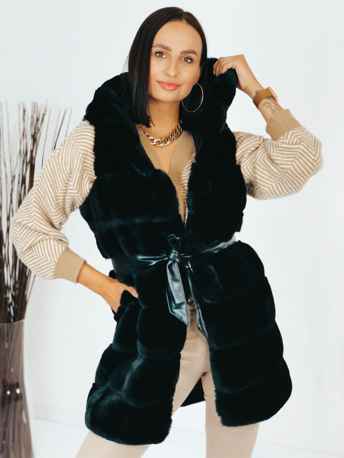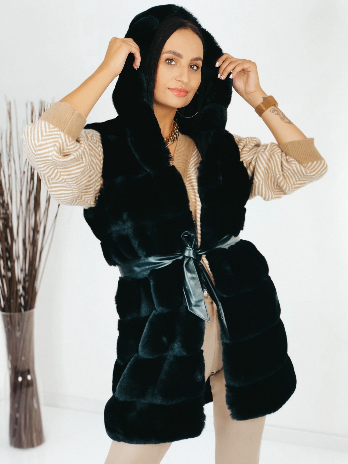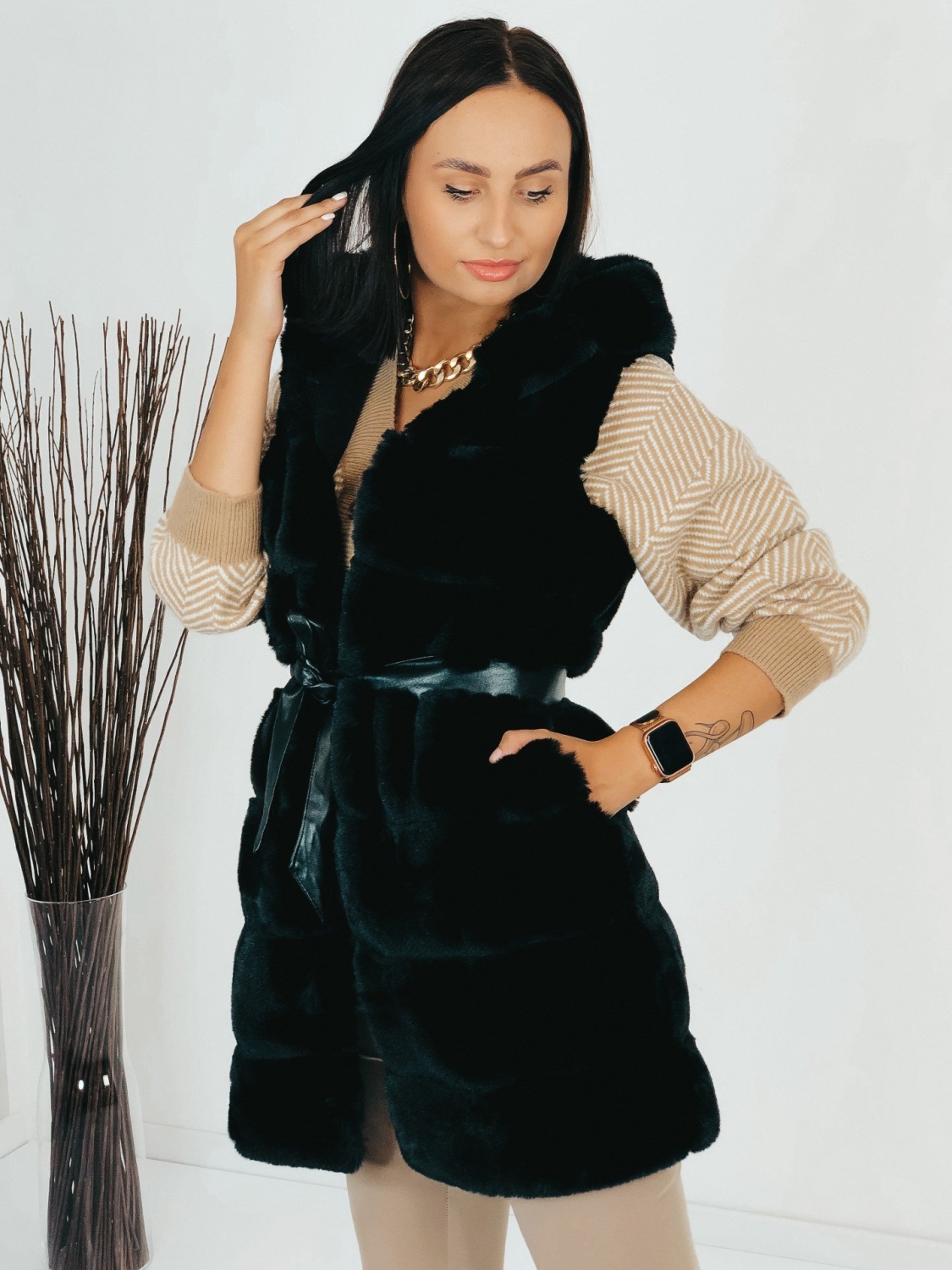 Dámska exkluzívna dlhá kožušinová vesta s kapucňou v čiernej farbe, ktorá je doplnená čiernym opaskom. Vesta, ktorá vám nesmie chýbať v šatníku. Kožušinová vestička má na oboch stranách vrecká. Zapínanie na háčiky v prednej časti. V chladnejšom počasí Vás zahreje. Krásne doplní akýkoľvek outfit, či si ju zvolíte k bežnému oblečeniu, na koženku alebo aj ku koktailovým šatám, siahnete po skvelej voľbe. Modelka meria 175 cm a má oblečenú veľkosť S/M.