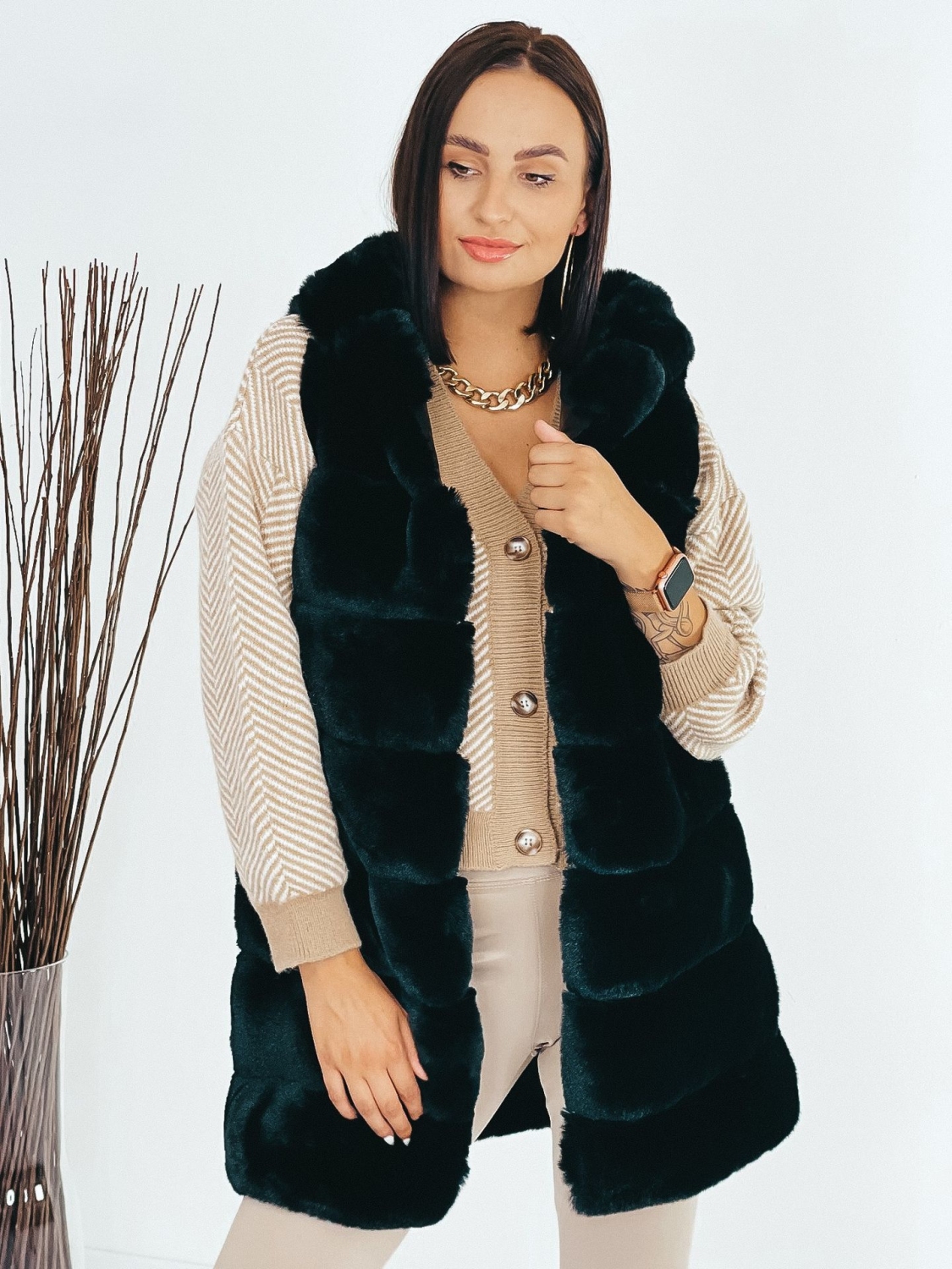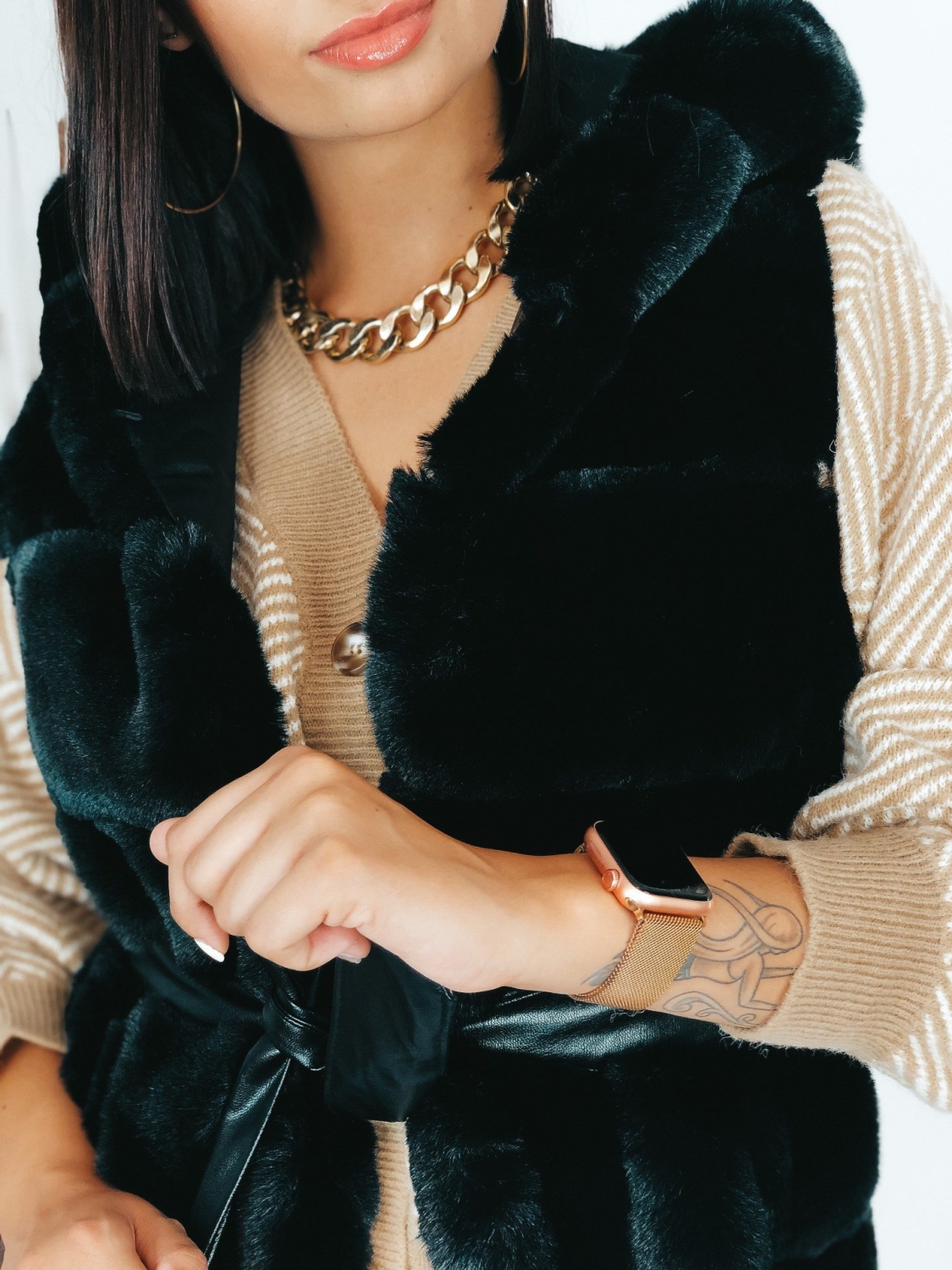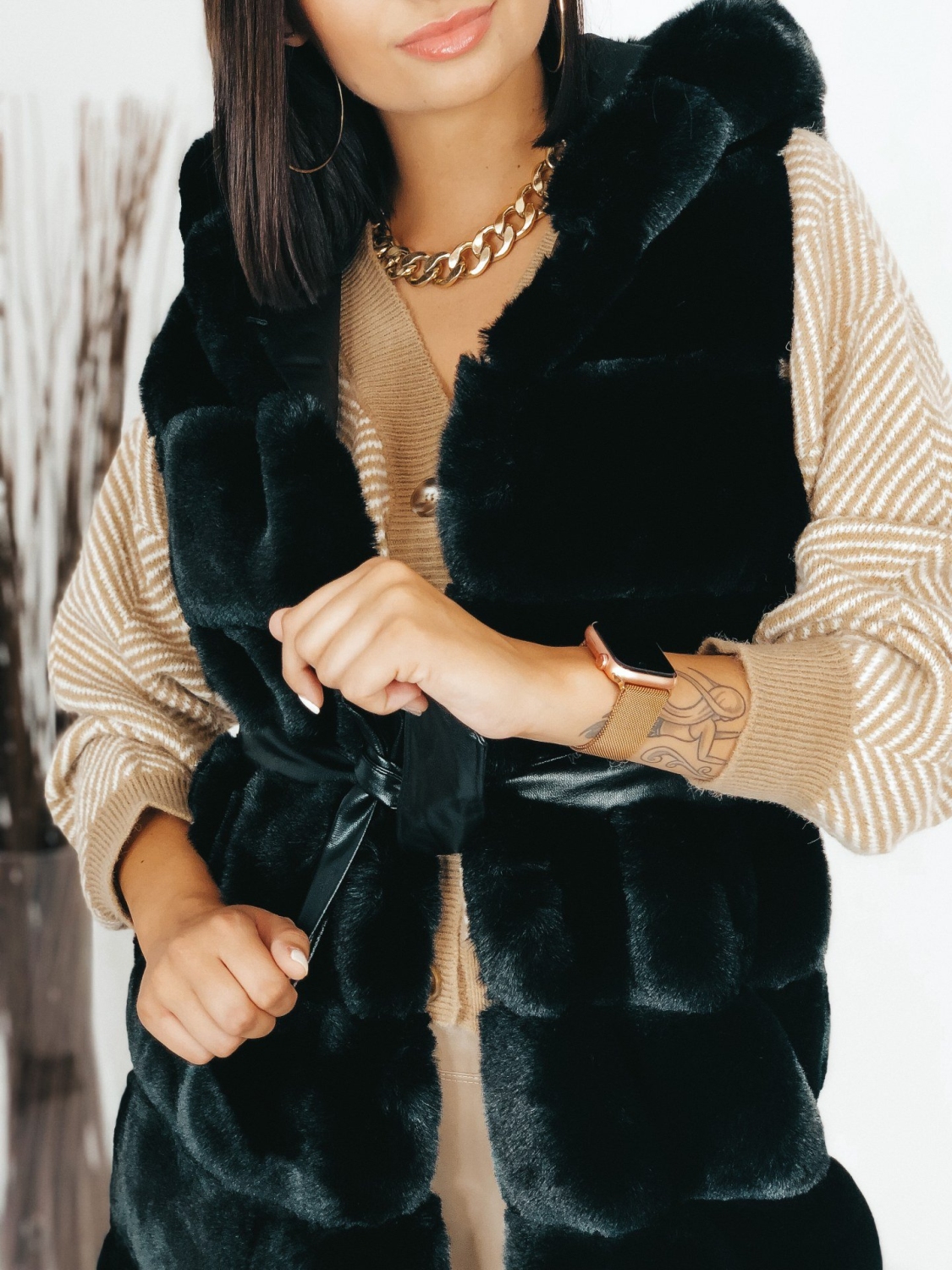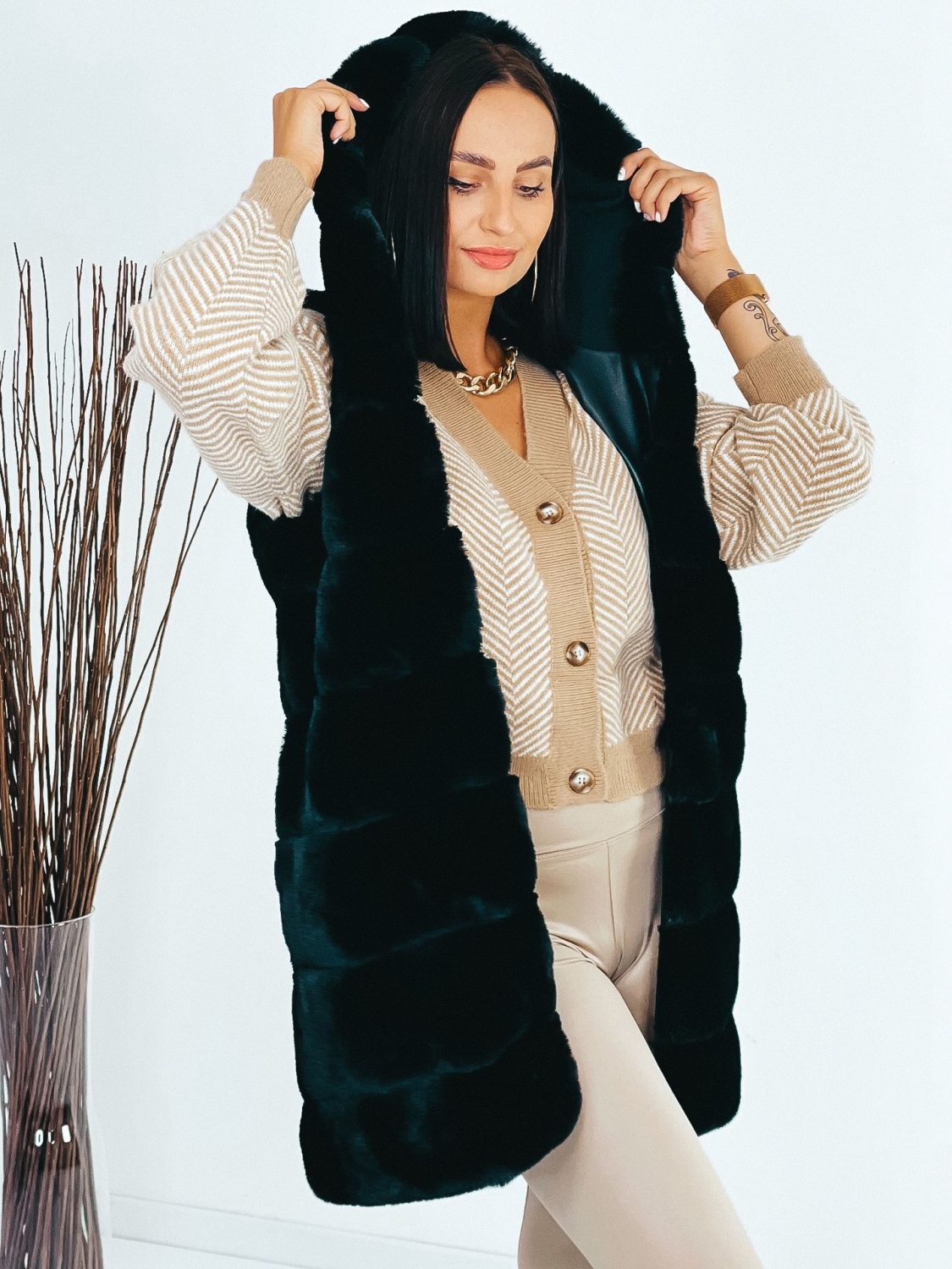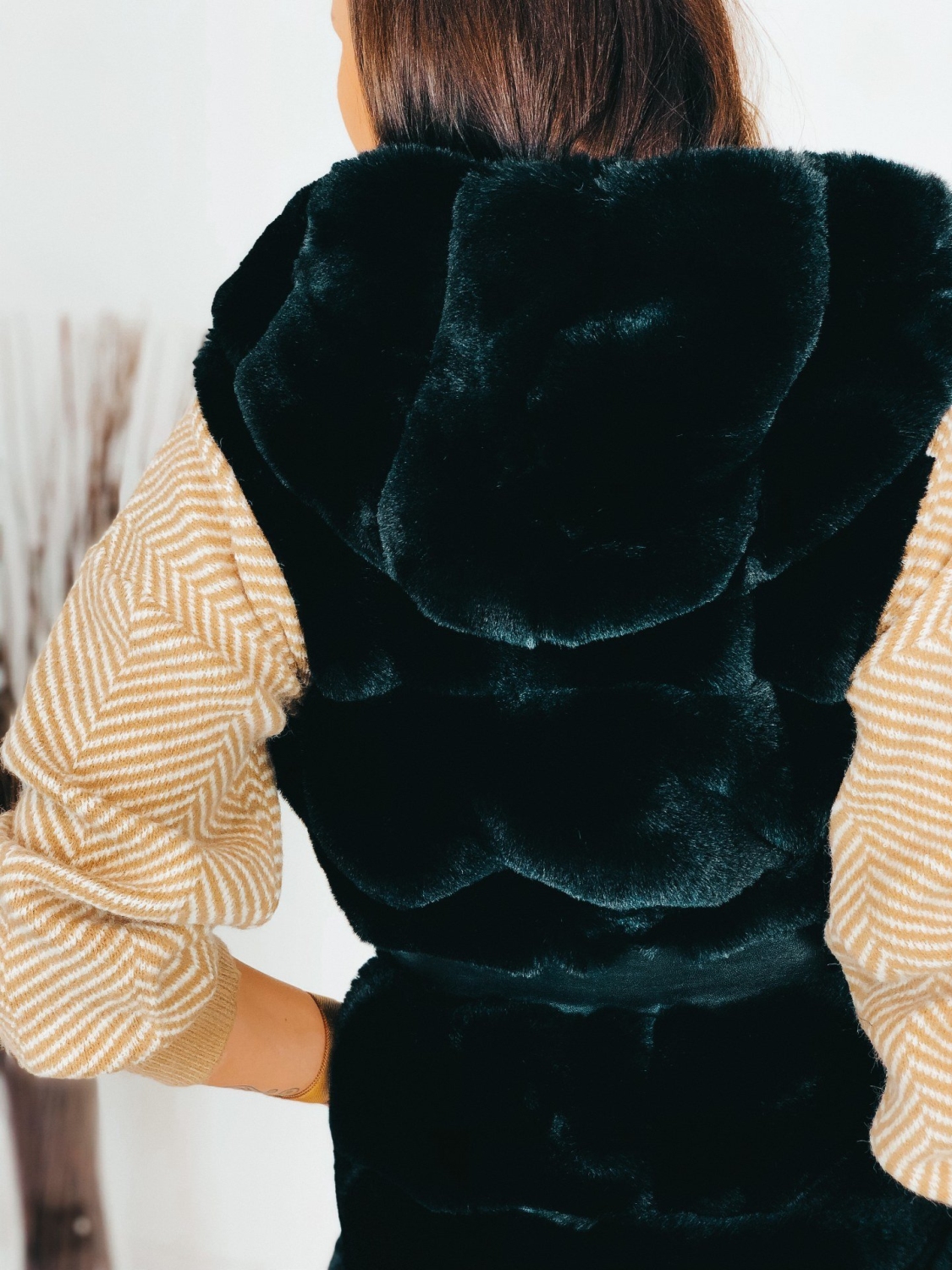 Dámska exkluzívna dlhá kožušinová vesta s kapucňou v čiernej farbe, ktorá je doplnená čiernym opaskom. Vesta, ktorá vám nesmie chýbať v šatníku. Kožušinová vestička má na oboch stranách vrecká. Zapínanie na háčiky v prednej časti. V chladnejšom počasí Vás zahreje. Krásne doplní akýkoľvek outfit, či si ju zvolíte k bežnému oblečeniu, na koženku alebo aj ku koktailovým šatám, siahnete po skvelej voľbe. Modelka meria 175 cm a má oblečenú veľkosť S/M.