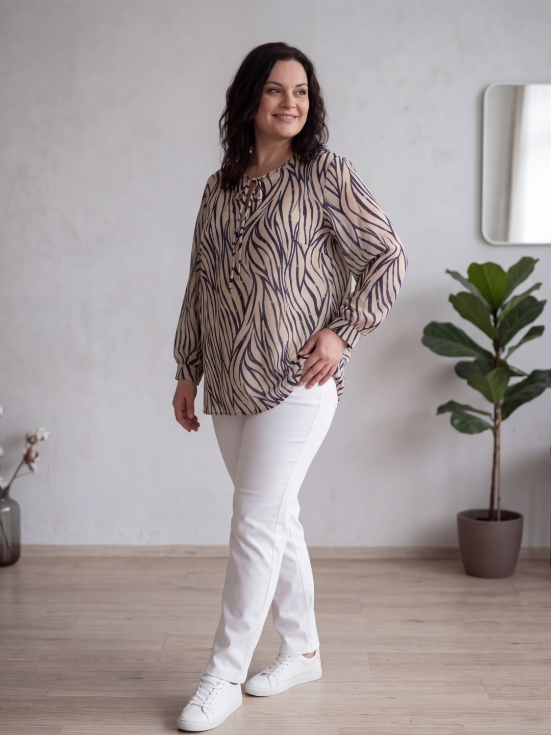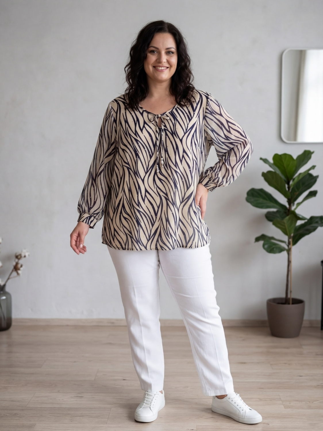 Hľadáte kúsok, ktorý dodá vášmu šatníku iskru a zároveň vám poskytne maximálne pohodlie? Táto vzdušná dámska blúzka s nadčasovým grafickým vzorom je navrhnutá tak, aby lichotila ženskej postave a podčiarkla vašu prirodzenú eleganciu.
