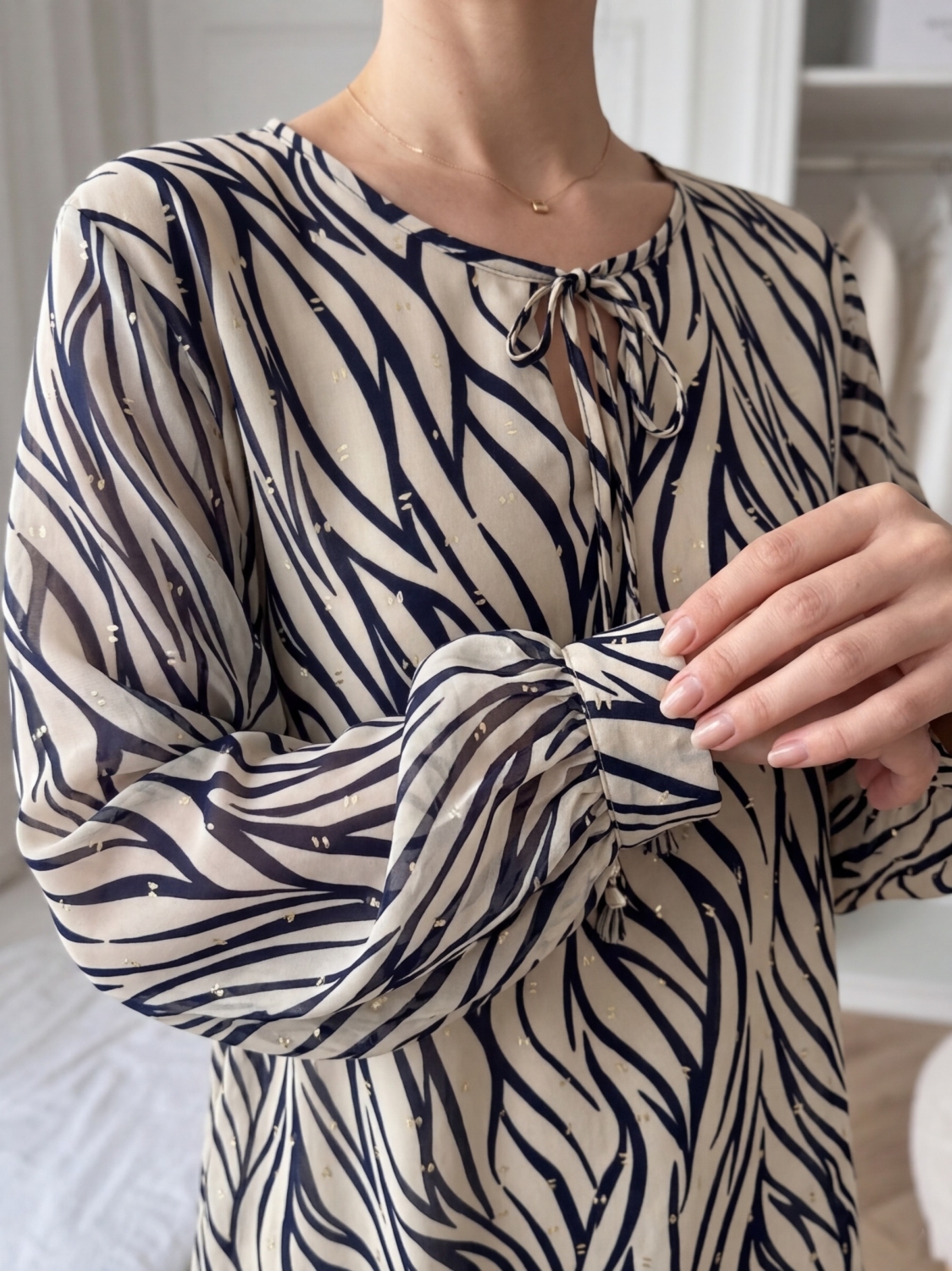 Luxusné detaily: Podklad v krémovej farbe s modrým vlnitým vzorom je jemne doplnený o drobné zlaté odlesky, ktoré blúzke dodávajú luxusný šmrnc. Ideálna voľba, ak chcete zažiariť v práci aj na spoločenskej udalosti.