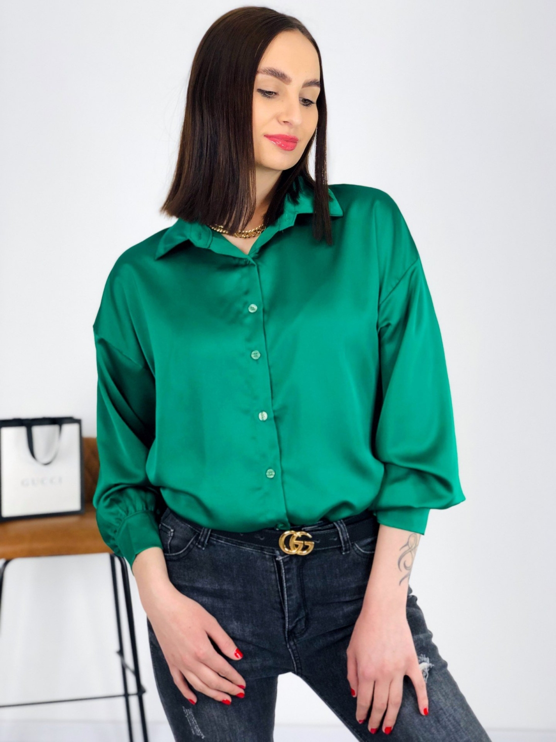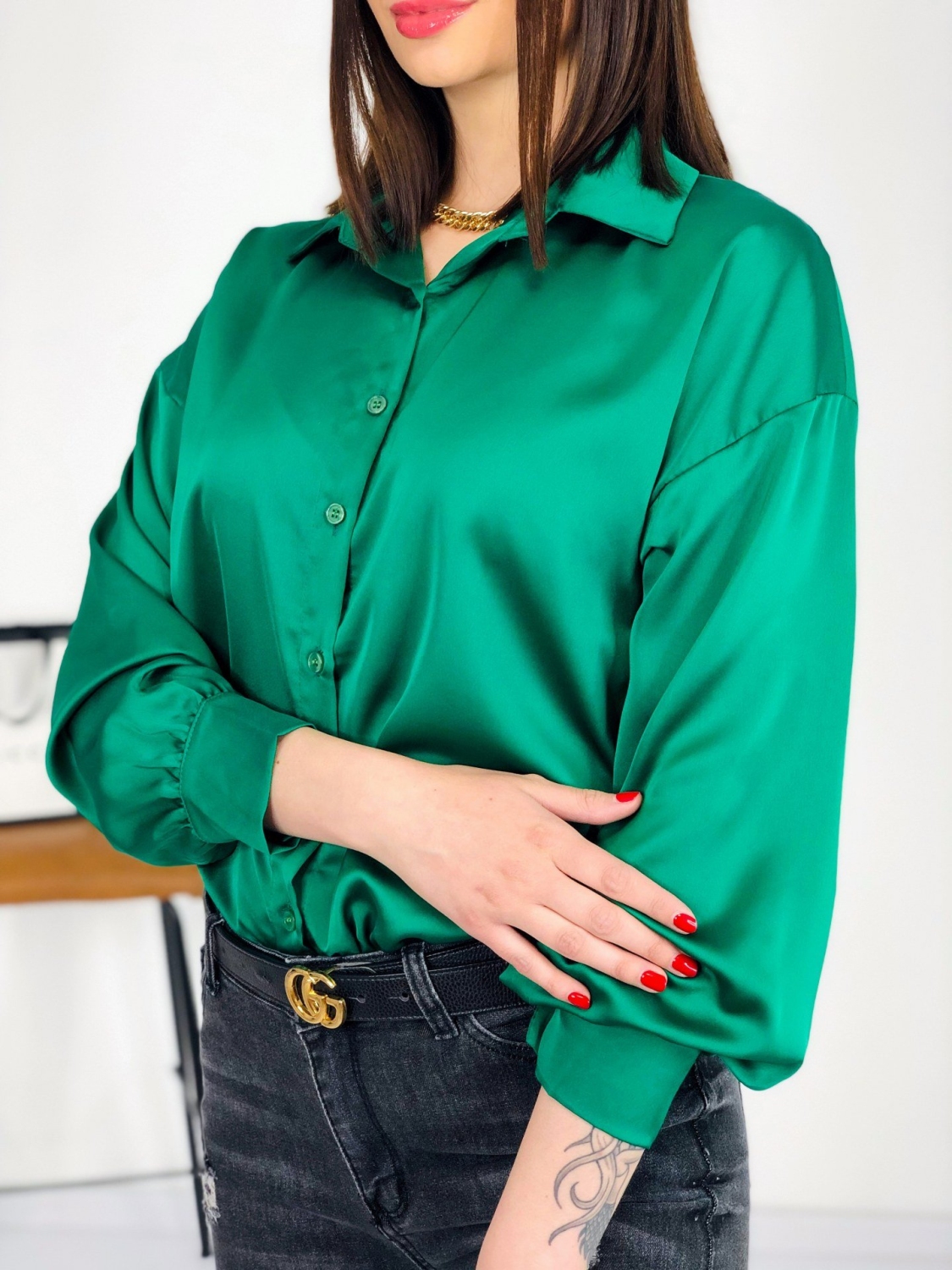 Dámska elegantná saténová blúzka v zelenej farbe s dlhým rukávom, ktorá sa zapína na gombíky. Je ideálnou voľbou pre každý outfit. Sadne takmer každému. Budete sa v nej cítiť pohodlne a príjemne. Vhodná na bežné dni aj na slávnostnejšiu príležitosť.