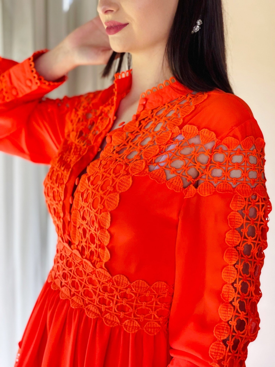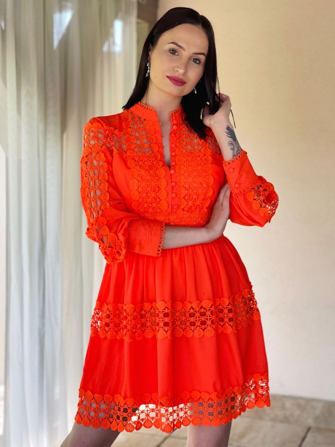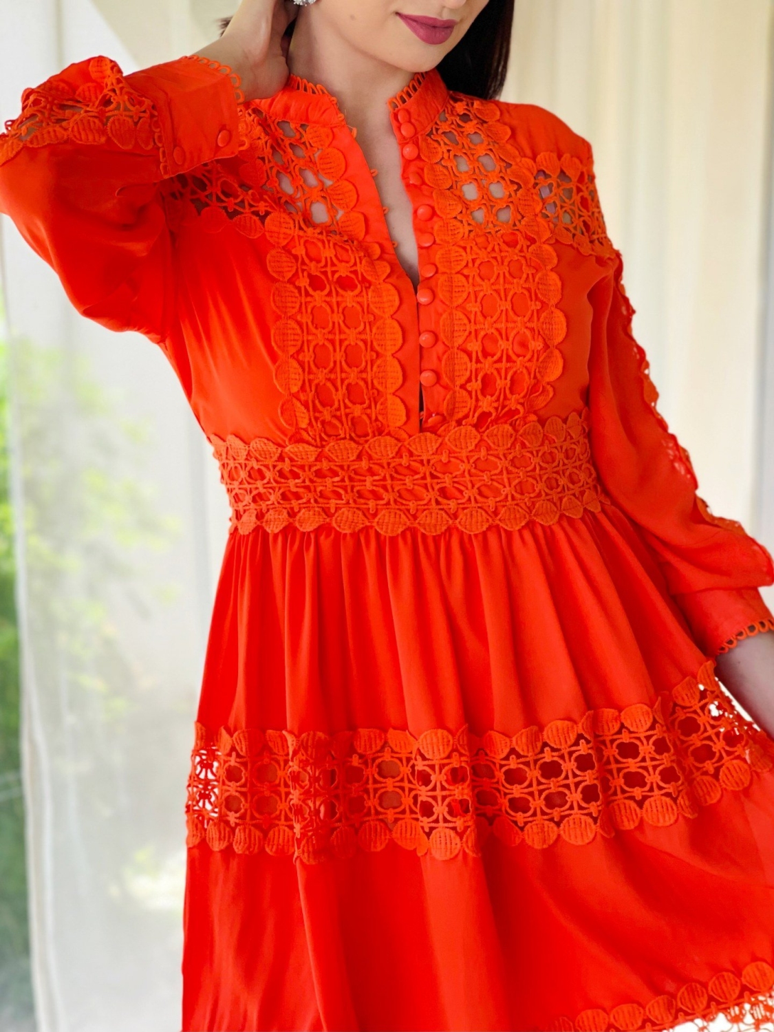 Dámske trendy čipkované šaty so zapínaním na gombíky v prednej časti. Dlhý rukáv so zapínaním taktiež na gobmíky. Jemna čipka Vás krásne rozžiari. Šaty zvýraznia tvoje silné stránky a čipka ti dodá dievčenský šarm! Kvalitný a príjemný materiál. Vďaka zaujímavému strihu budete vynikať a určite neostanete bez povšimnutia. Šaty ľahko skombinujete podľa vlastného vkusu. Pohodlné a praktické s možnosťou nosenia na spoločenské udalosti.