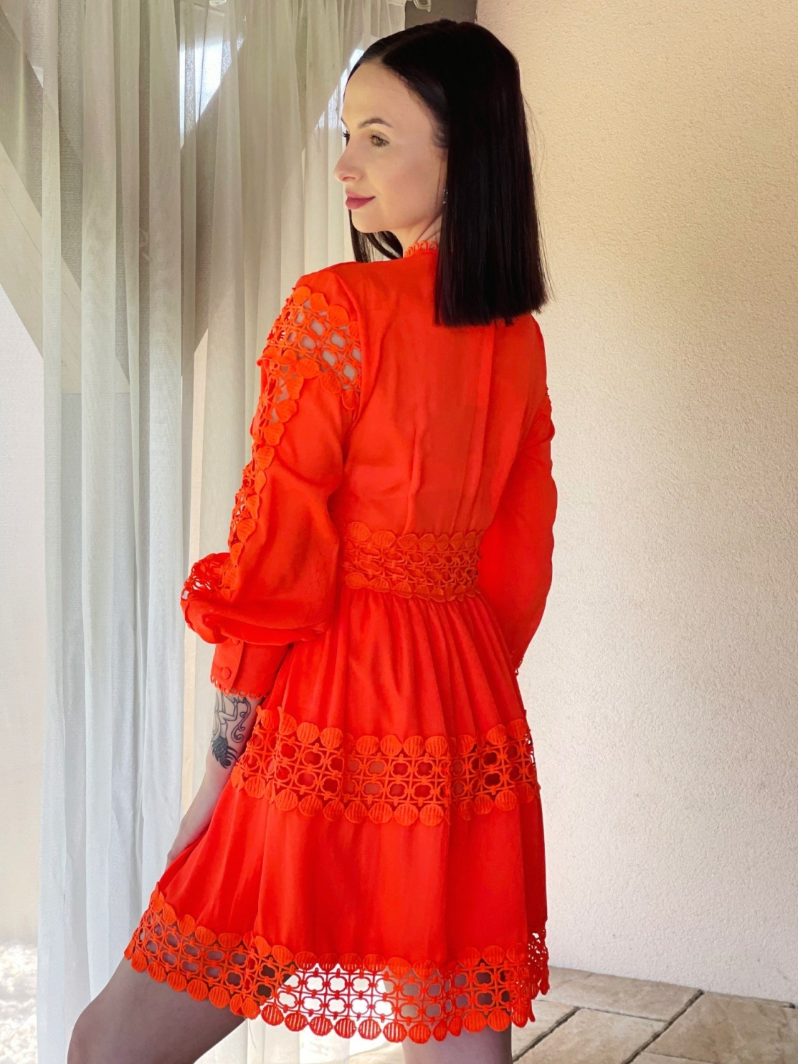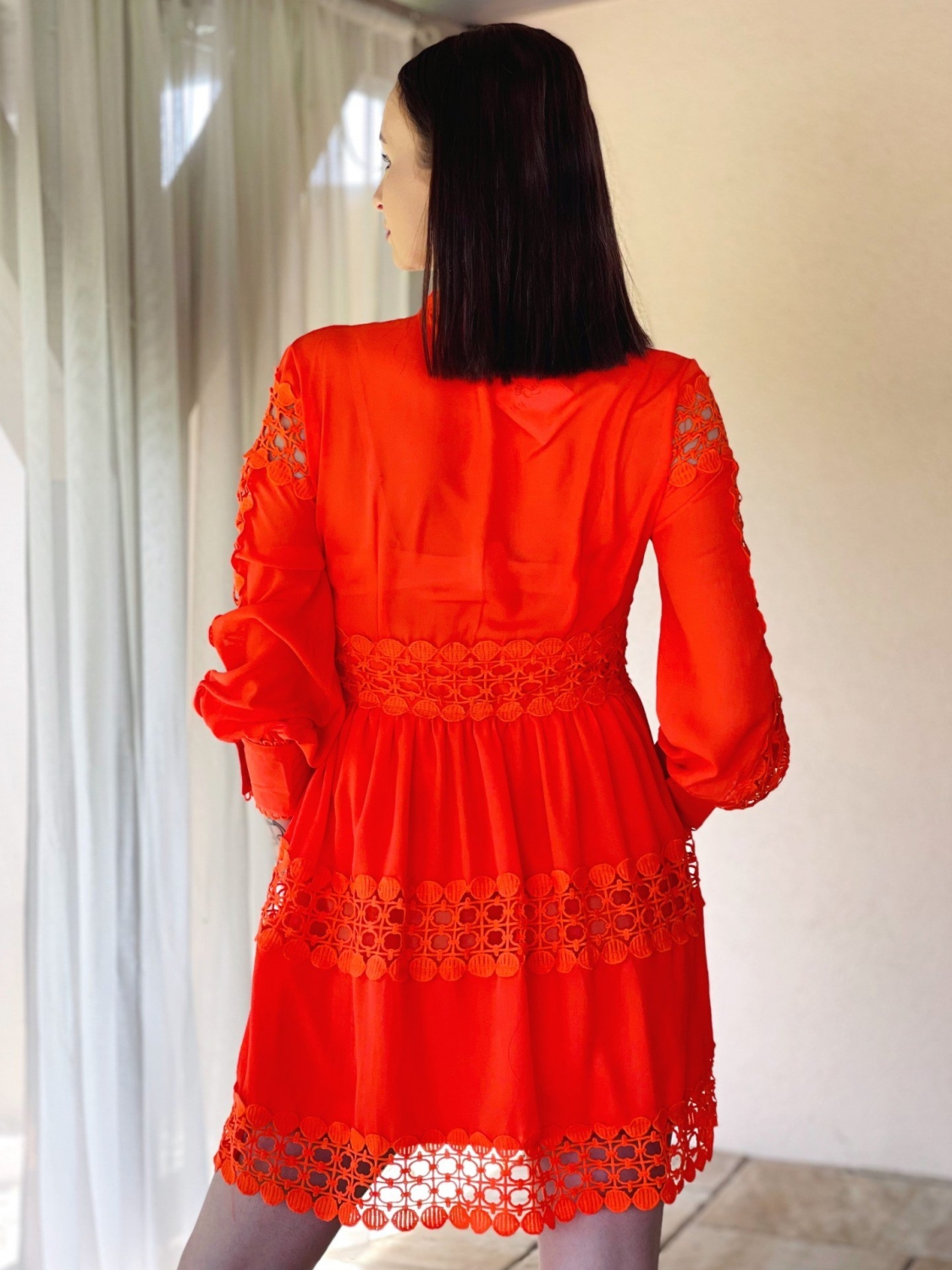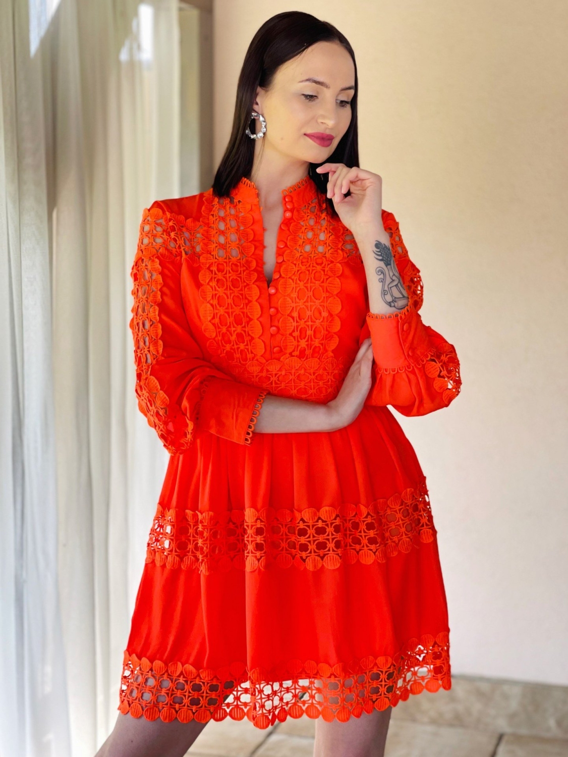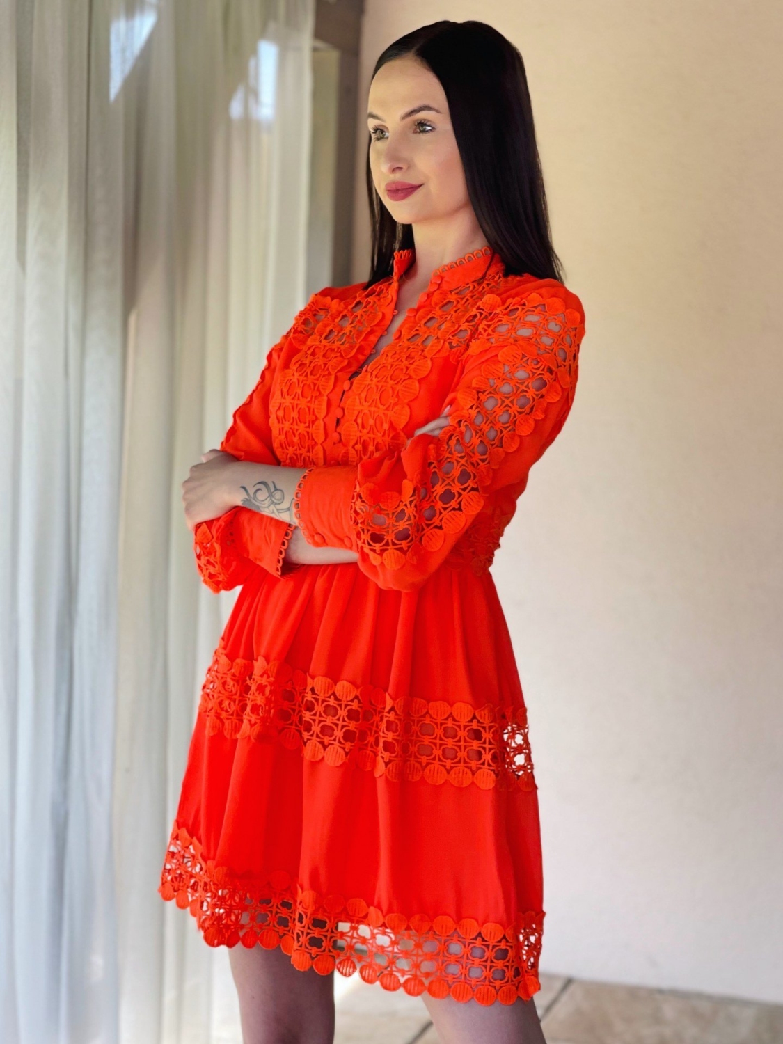 Dámske trendy čipkované šaty so zapínaním na gombíky v prednej časti. Dlhý rukáv so zapínaním taktiež na gobmíky. Jemna čipka Vás krásne rozžiari. Šaty zvýraznia tvoje silné stránky a čipka ti dodá dievčenský šarm! Kvalitný a príjemný materiál. Vďaka zaujímavému strihu budete vynikať a určite neostanete bez povšimnutia. Šaty ľahko skombinujete podľa vlastného vkusu. Pohodlné a praktické s možnosťou nosenia na spoločenské udalosti.