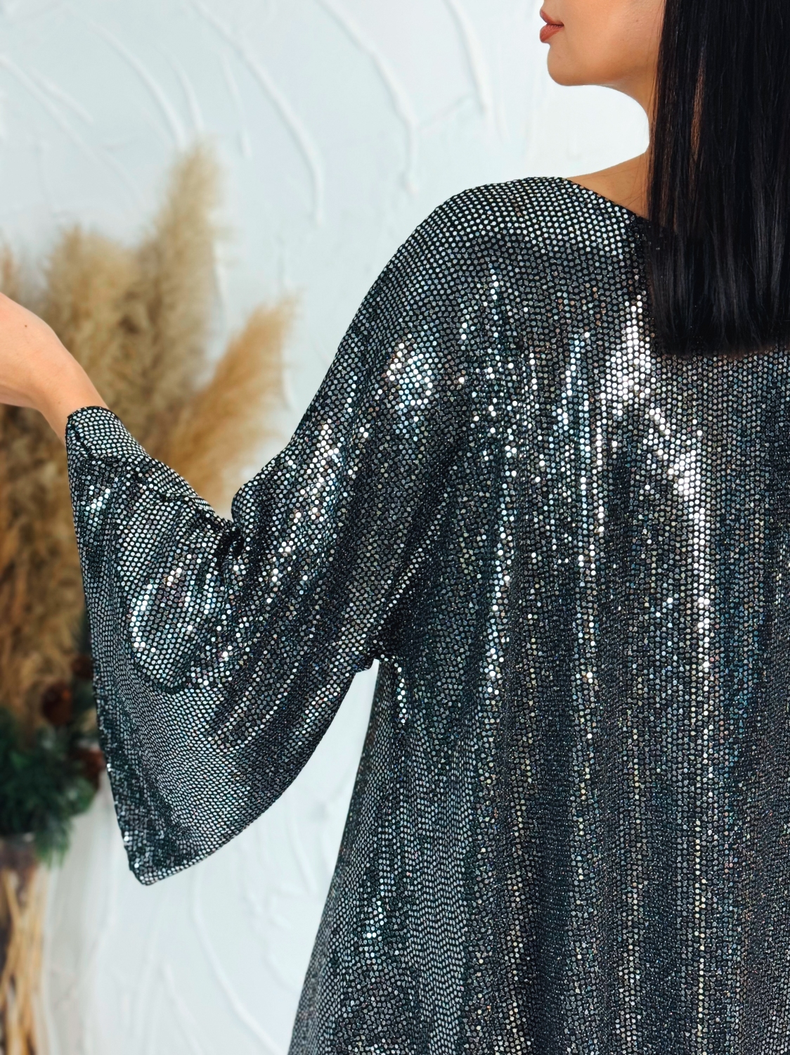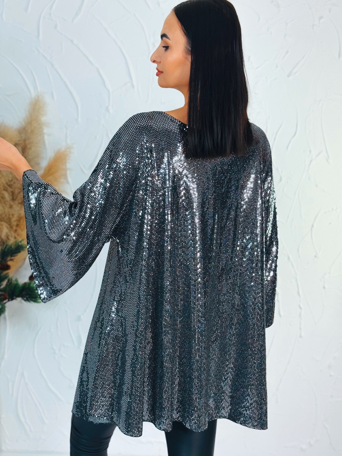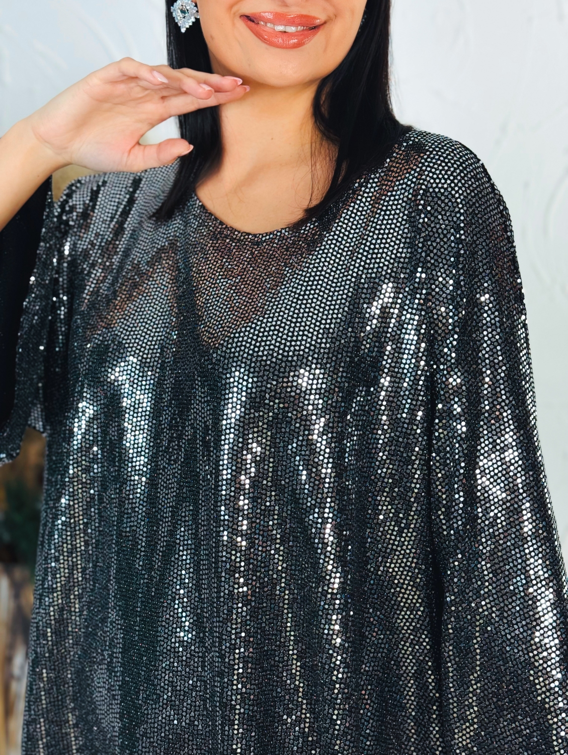 Táto dámska trblietavá tunika je ideálnou voľbou pre každú ženu, ktorá chce zažiariť pri špeciálnych príležitostiach. Elegantný strih a jemne lesklý materiál dodávajú outfitu sviatočný nádych a garantujú, že zaujmete už na prvý pohľad. Tunika je pohodlná, ľahká a štýlová — skvele sa hodí na vianočný večierok, silvestrovskú párty či inú spoločenskú udalosť.