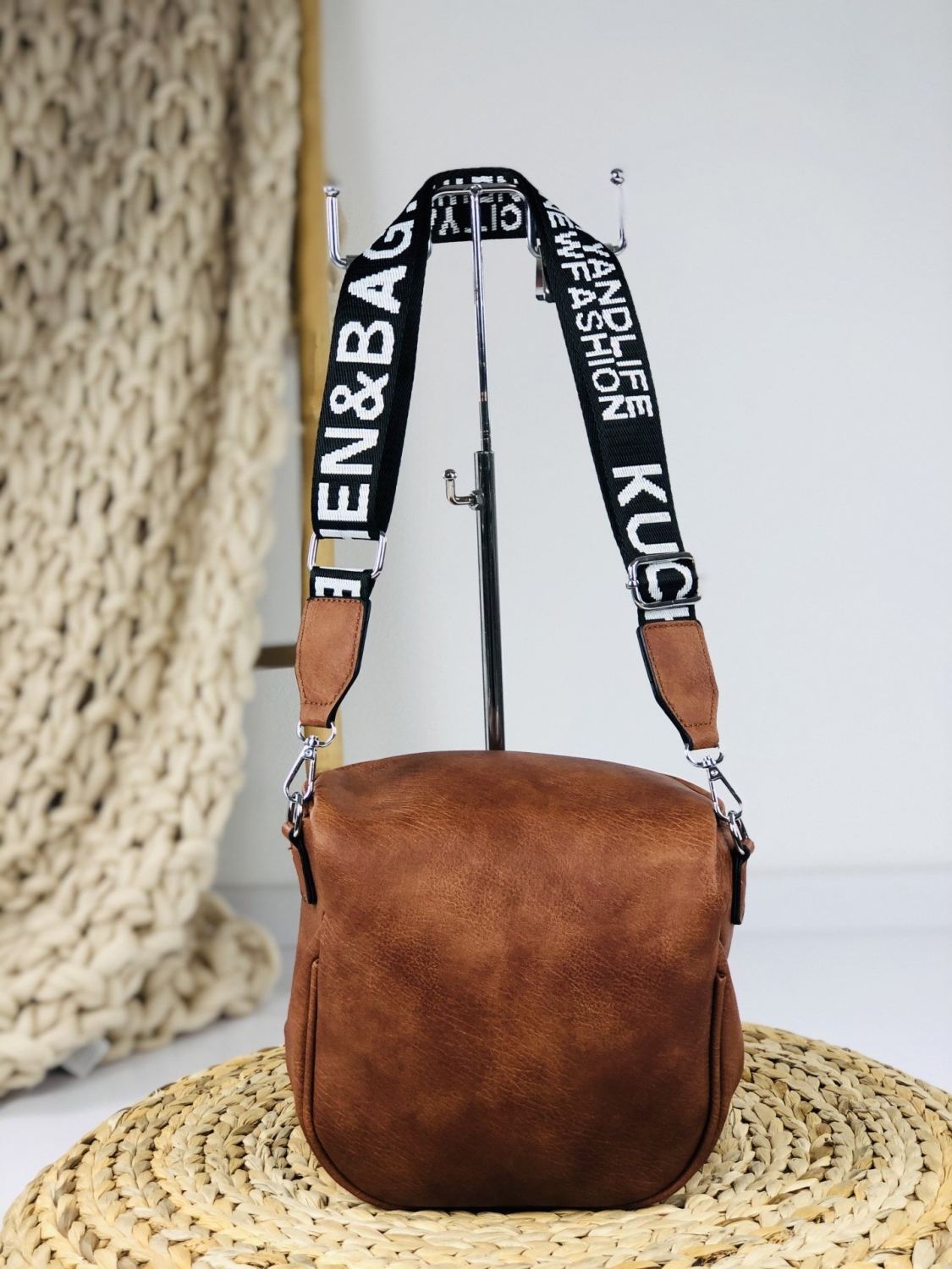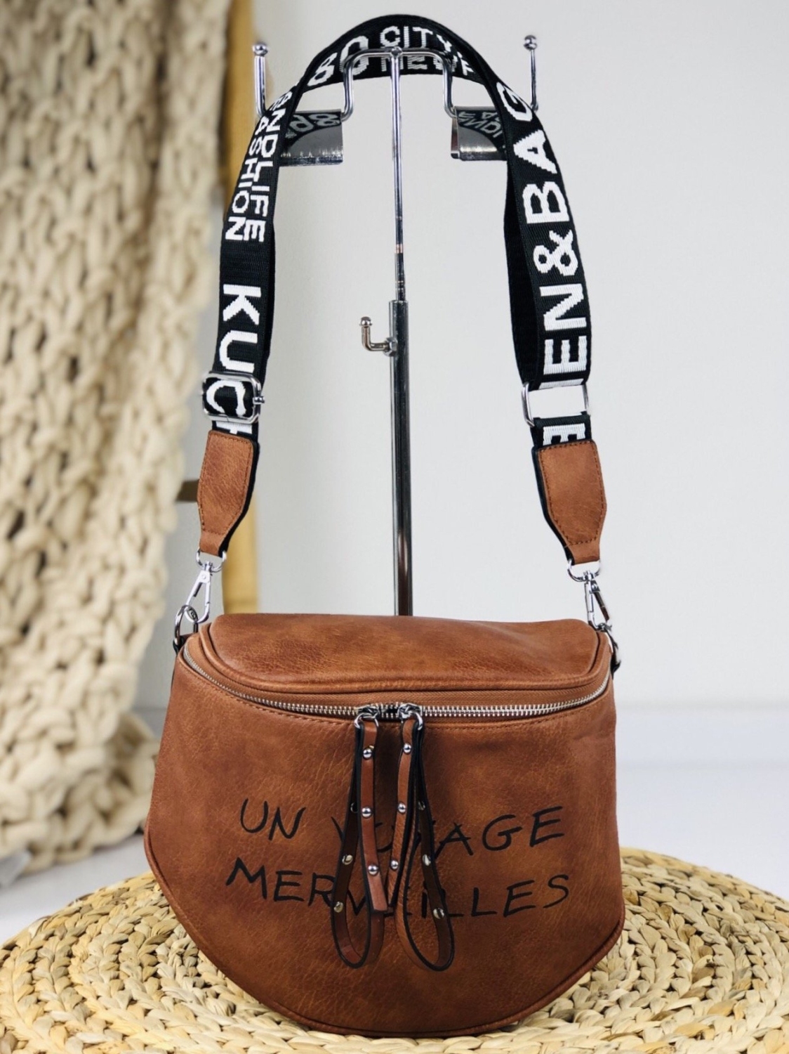 Dámska štýlová kabelka v hnedej farbe s nápismi. Pevný materiál, s dostatočným priestorom vo vnútri. Kabelka je nevyhnutným doplnkom každého originálneho outfitu. Zapínanie kabelky na zips.