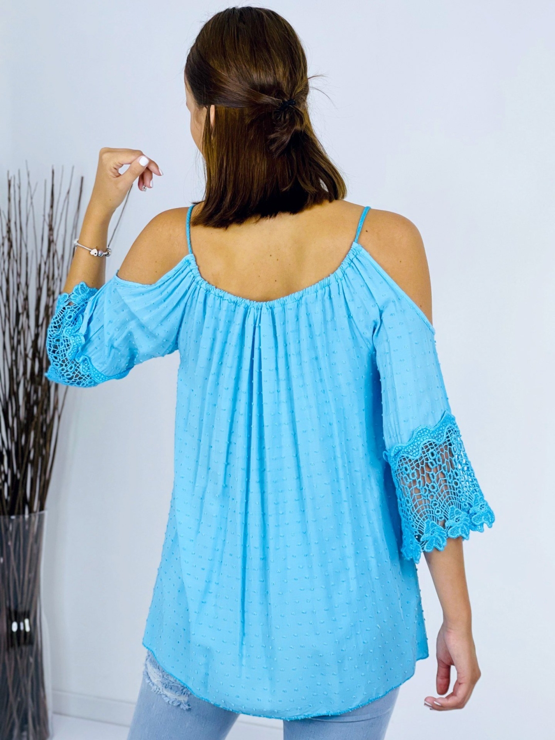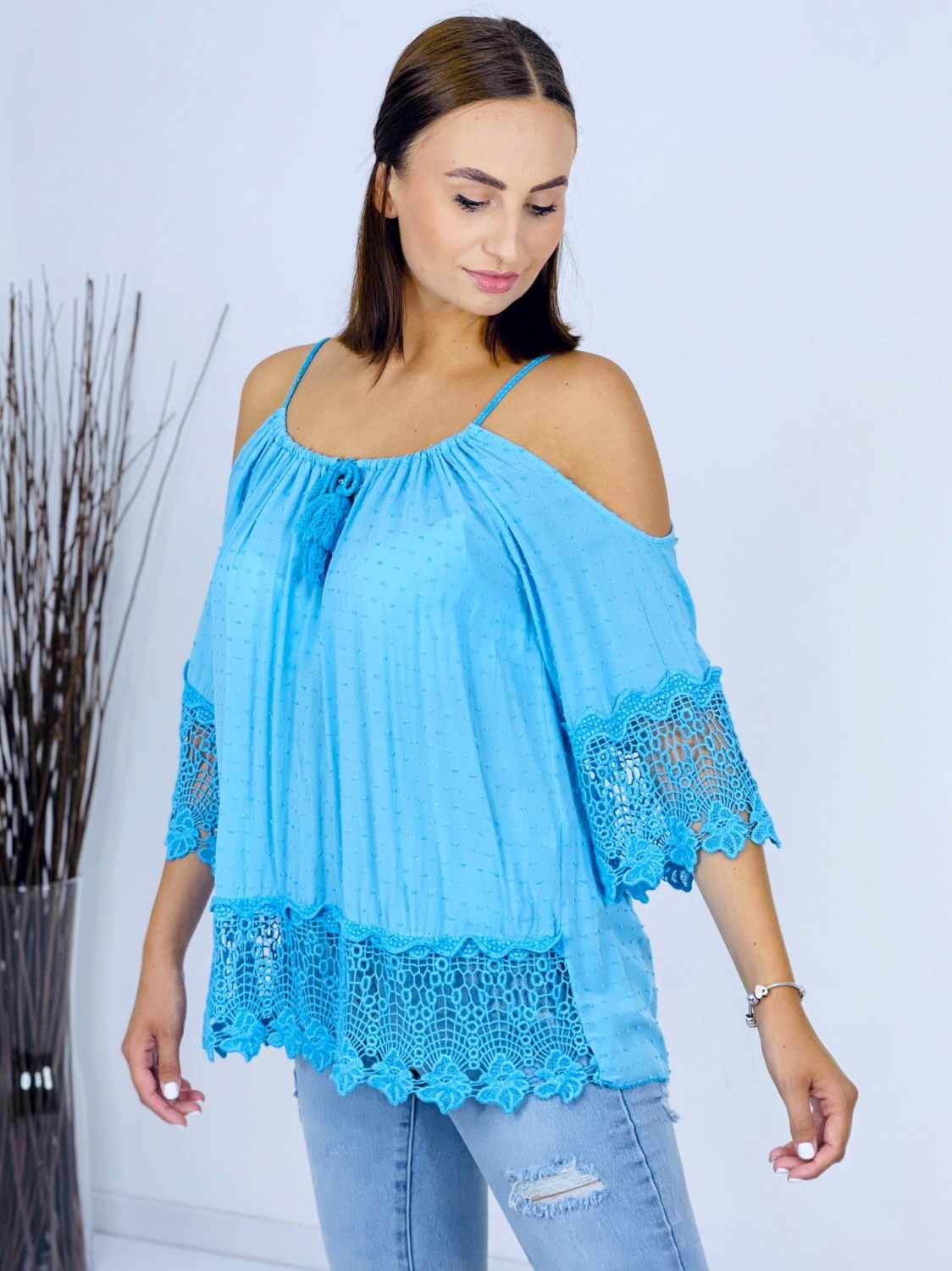 Dámska modrá blúzka na ramienka, ktorá je doplnená gumičkou madeirou vo svojej spodnej časti. Blúzka je v zaujímavom a trendy prevedení. Príjemný a vzdušný materiál. Bez zapínania. Sadne takmer každému. Búdete sa v nej cítiť pohodlne a príjemne. Vhodná na bežné dni aj na slávnostnejšiu príležitosť. Modelka je vysoká 175 cm a oblečenú má veľkosť UNI.
