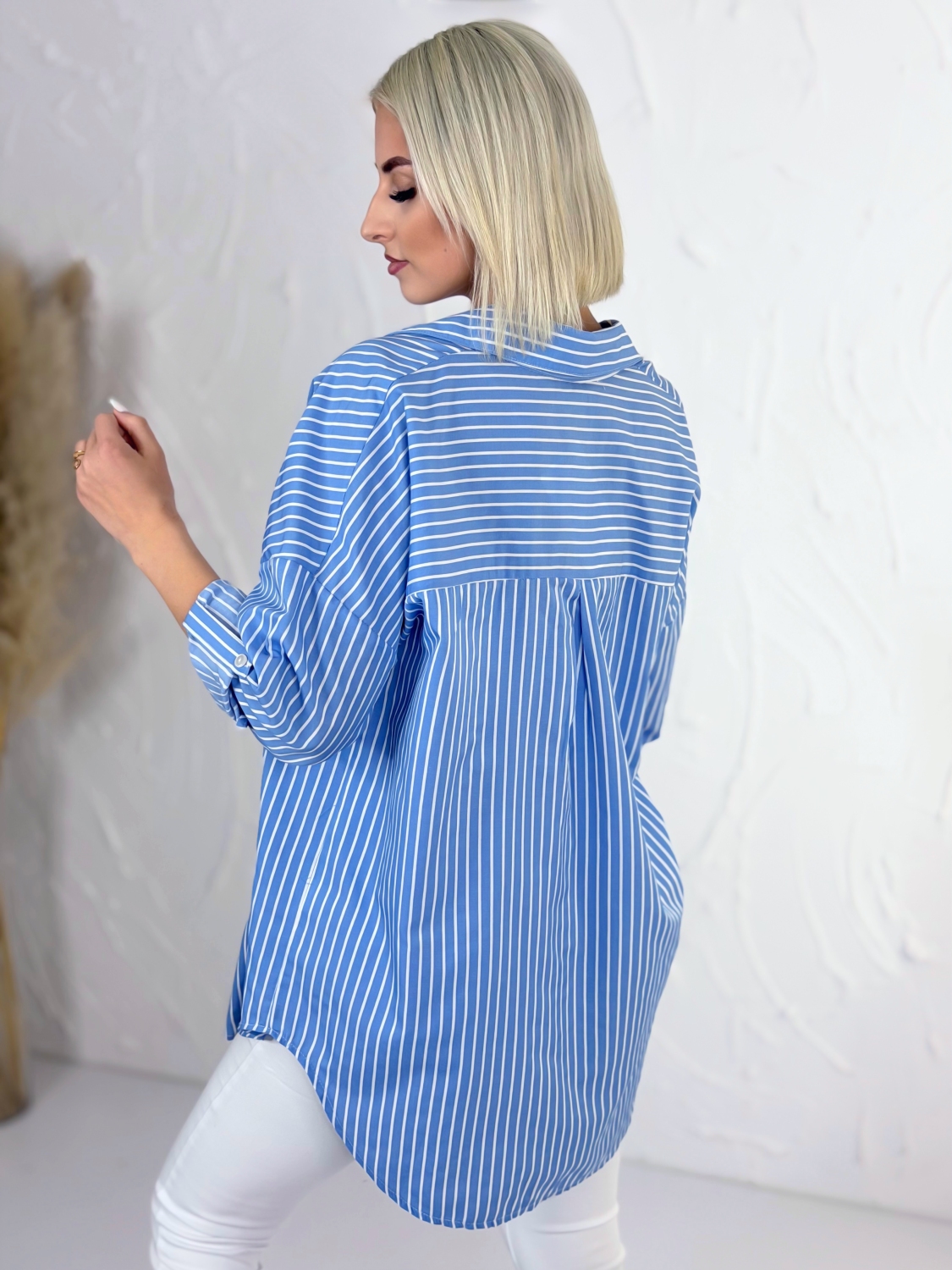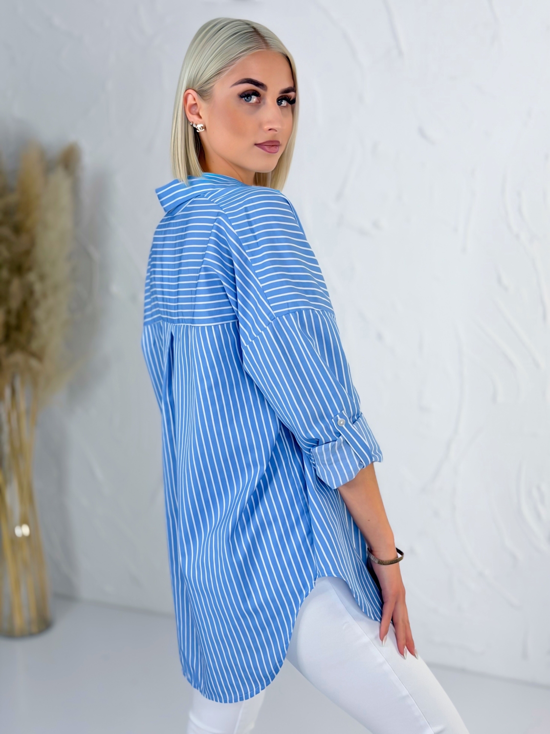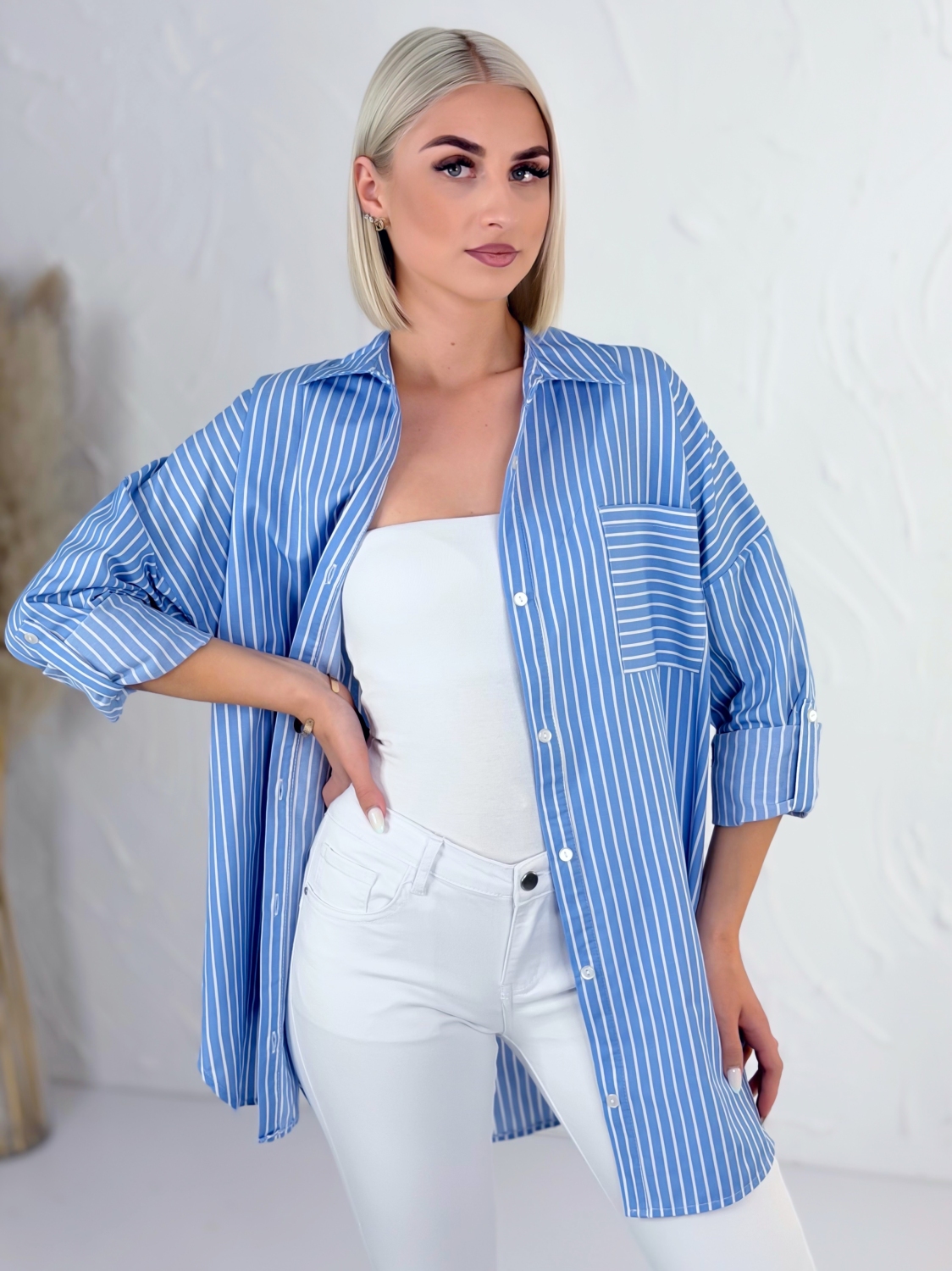 Táto štýlová pruhovaná košeľa s klasickým golierom je ideálnym kúskom pre každodenné nosenie aj ležérne elegantné kombinácie. Vyznačuje sa nadčasovým dizajnom s jemnými prúžkami, ktoré pôsobia sviežo a zároveň veľmi žensky. Vďaka oversize strihu krásne sadne každej postave, poskytuje maximálne pohodlie a voľnosť pohybu, pričom si zachováva moderný a upravený vzhľad. Košeľa má dlhé rukávy, ktoré si môžete podľa potreby vyhrnúť pre uvoľnenejší look alebo ich nechať spustené pre klasickejší štýl. Praktické predné vrecko dodáva košeli nielen štýlový detail, ale aj funkčnosť. Predĺžený strih je ideálny na nosenie k nohaviciam, legínam aj sukniam a ľahko sa kombinuje s rôznymi kúskami vo vašom šatníku. Materiál je príjemný na dotyk a vhodný na celodenné nosenie. Táto košeľa je skvelou voľbou pre ženy, ktoré hľadajú spojenie komfortu, štýlu a univerzálnosti v jednom kúsku.