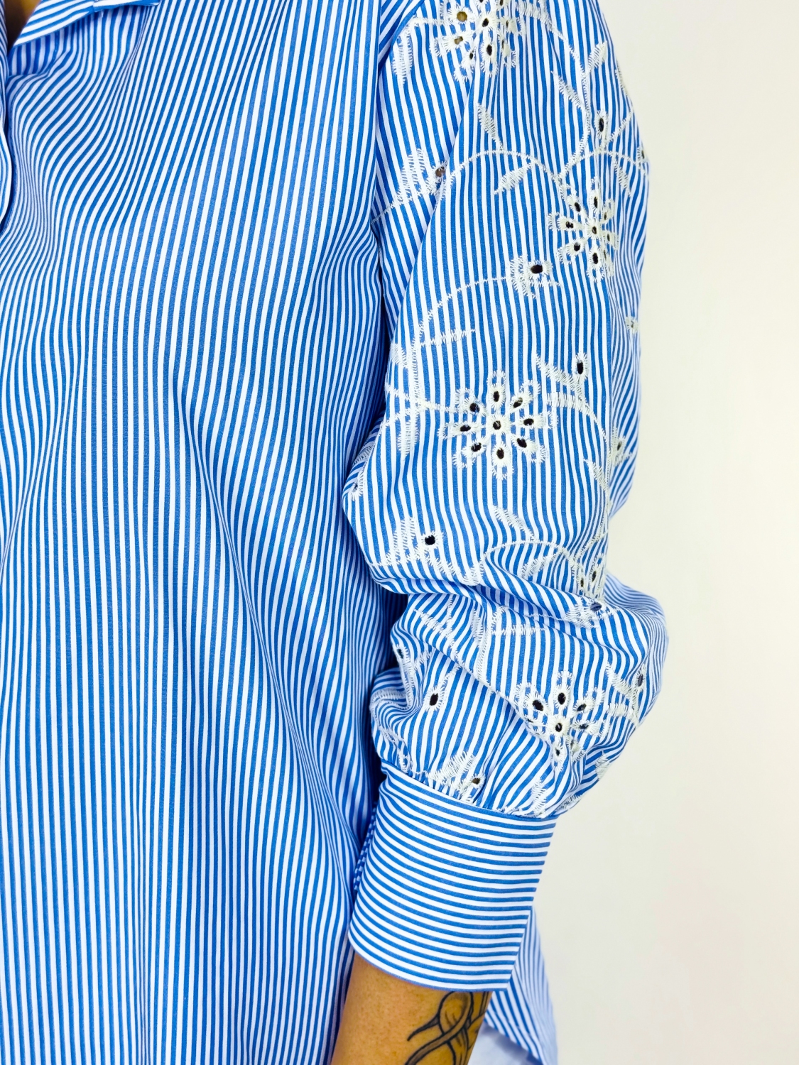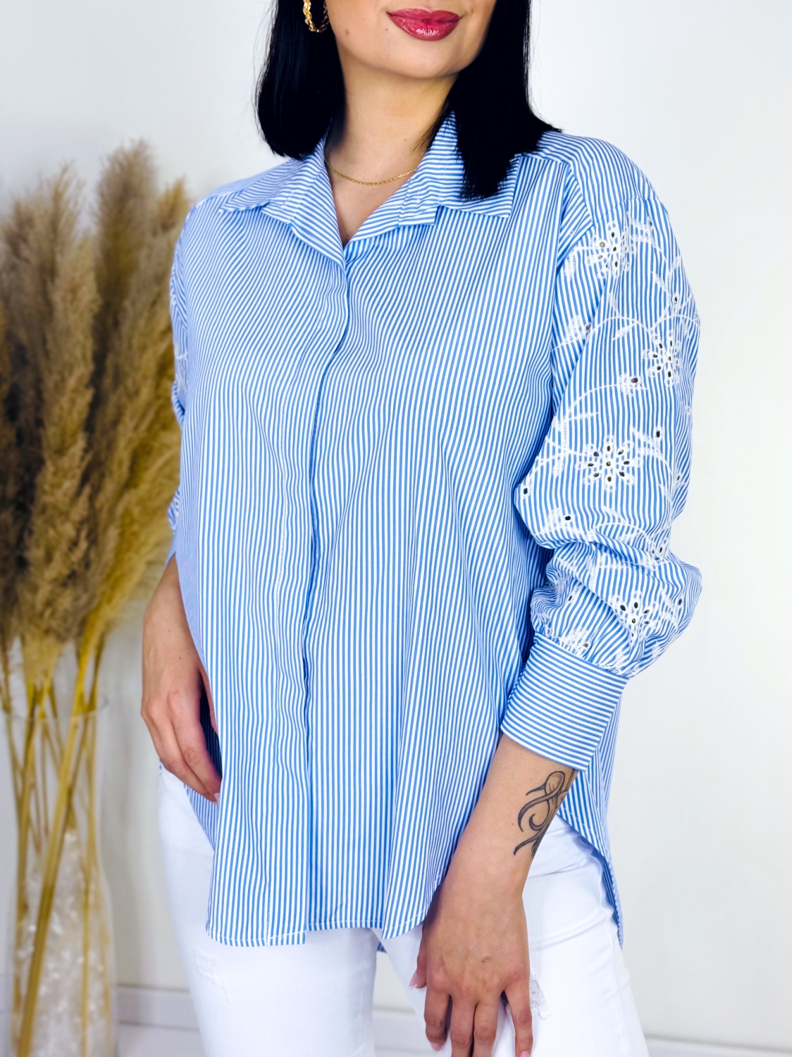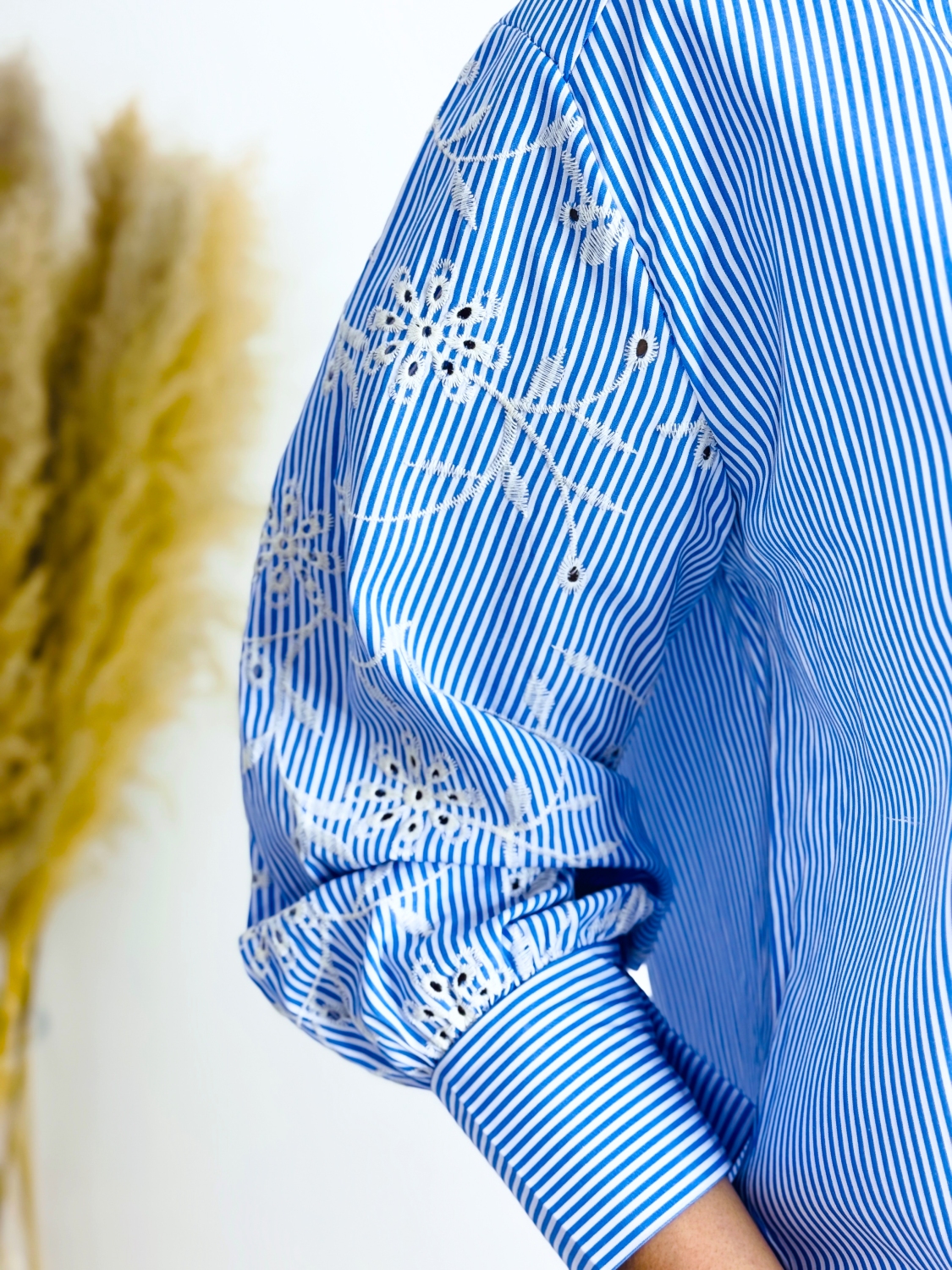 Dámska pásikavá oversize košeľa s čipkou na rukávoch je štýlový a elegantný kúsok, ktorý skvele doplní váš šatník.