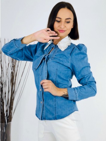 Dámska košeľa v modrej farbe s viazním pri krku, ktorá sa zapína vpredu na gombíky a je doplnená čipkou s perličkami, ktorá je odopínateľná. Košeľa má dlhé rukávy, ktoré je možnosť si vyhrnúť. Je ideálnou voľbou pre väčšinu postáv. Sadne takmer každému. Doplnená trendovými vypchávkami na ramenách. Búdete sa v nej cítiť pohodlne a príjemne. Táto košeľa si získa srdcia milovníčok čistej klasiky, ale aj milovníčok moderného a hlavne pohodlného štýlu. Modelka je vysoká 175 cm a oblečenú má veľkosť M/L.