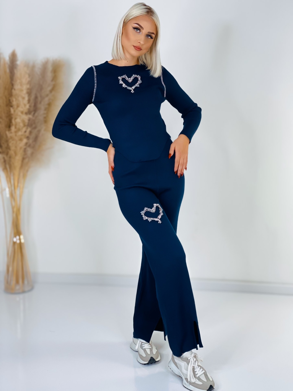 Dámska elegantná úpletová súprava s kamienkovým zdobením. Má široké nohavice s gumičkou v páse a malými rázporkami vpredu. Pulóver je v obtiahnutom kratšom asymetrickom prevedení. Vhodná na jeseň/zimu. Inšpirovaná svetoznámou značkou. Súprava je vyrobená z vysoko kvalitného a pohodlného materiálu. Vhodná na voľný čas, ale aj na bežné nosenie. Súpravy sú v súčasnosti veľmi populárne, a preto už dávno neplatí, že sú brané len ako športový kúsok oblečenia. S touto dámskou úpletovou súpravou zaujmete svoje okolie. Pohodlnosť, trendovosť a modernosť! Tieto všetky kritéria spĺňa táto dámska súprava. Kombo, ktoré môžete nosiť aj oddelene. Voľba je na Vás. Kúsok, ktorý Vám oživí Vás šatník. Modelka je vysoká 170 cm a oblečenú veľkosť UNI.