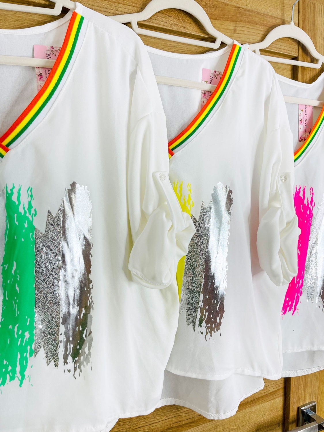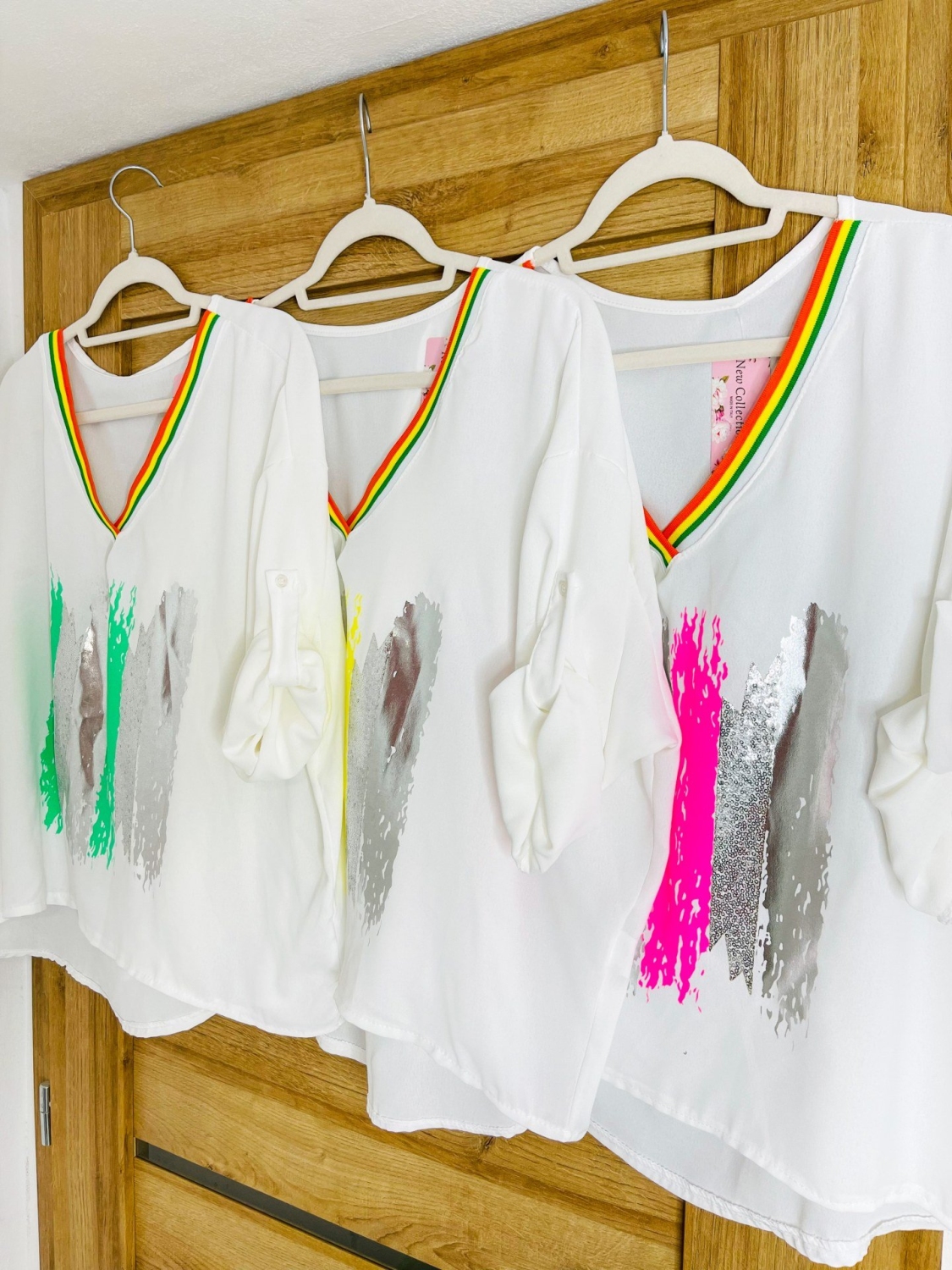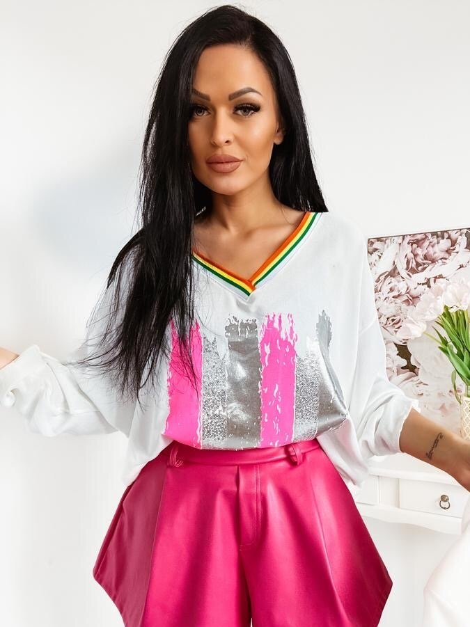 Dámska oversize blúzka s trojštvrťovými rukávmi, ktoré sú s možnosťou nosenia aj ako dlhé. Véčkový výstrih v dúhových farbách. Blúzka perfektne sadne na akúkoľvek postavu. Ľahko kombinovateľná s možnosťou nosenia aj na slávnostejšiu príležitosť. Taktiež aj na bežné nosenie, ako je do práce či na rande. Kúsok, ktorý Vás nikdy neomrzí. Štýlovo doplníte svoj outfit. Univerzálny a trendy kúsok. Bez zapínania. Perfektný vzdušný material. Modelka je vysoká 170 cm a oblečenú má veľkosť UNI. Blúzka sadne na veľkosť XS,S,M,L,XL,XXL.