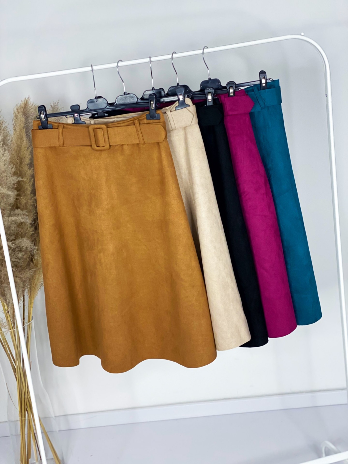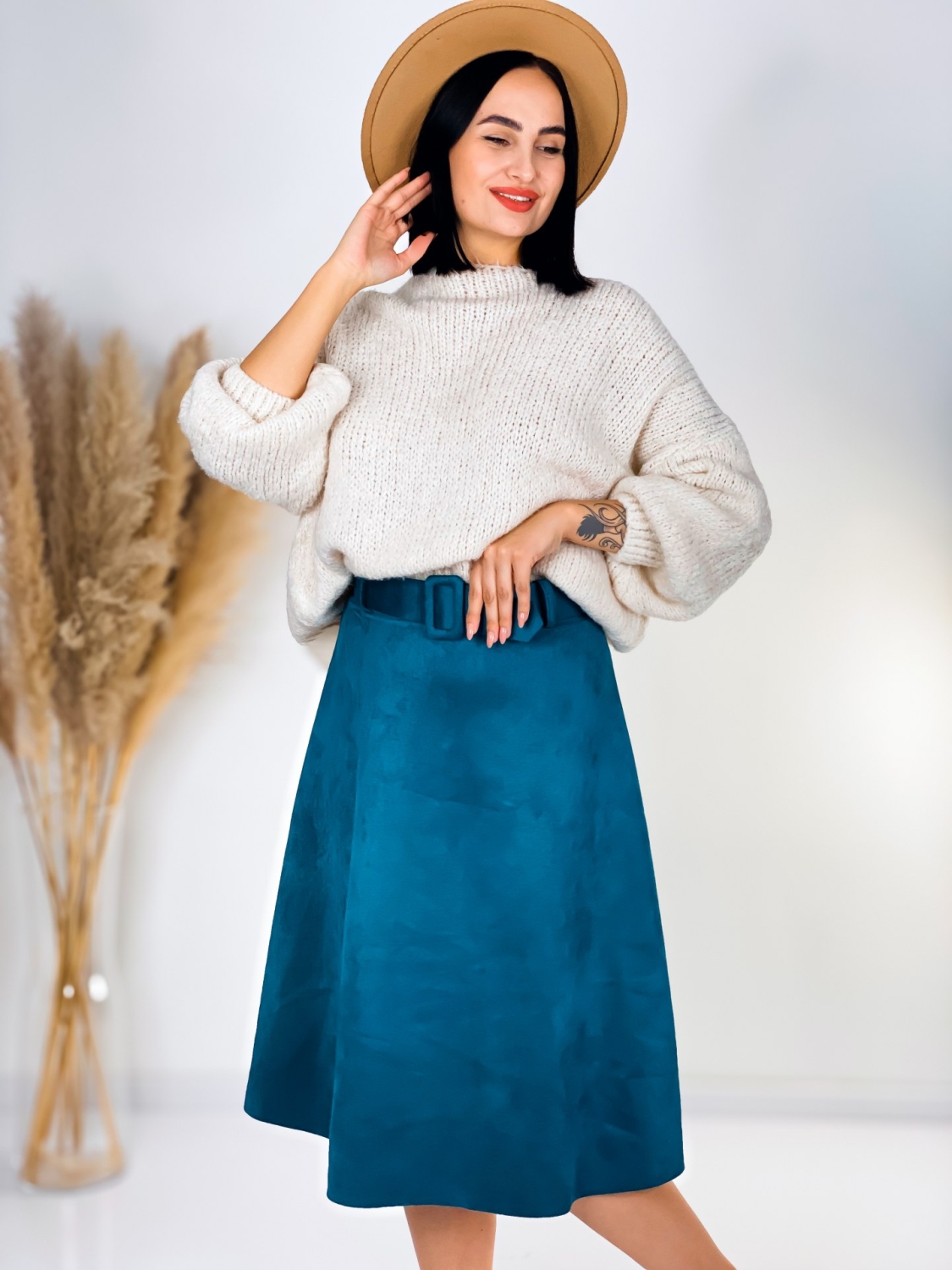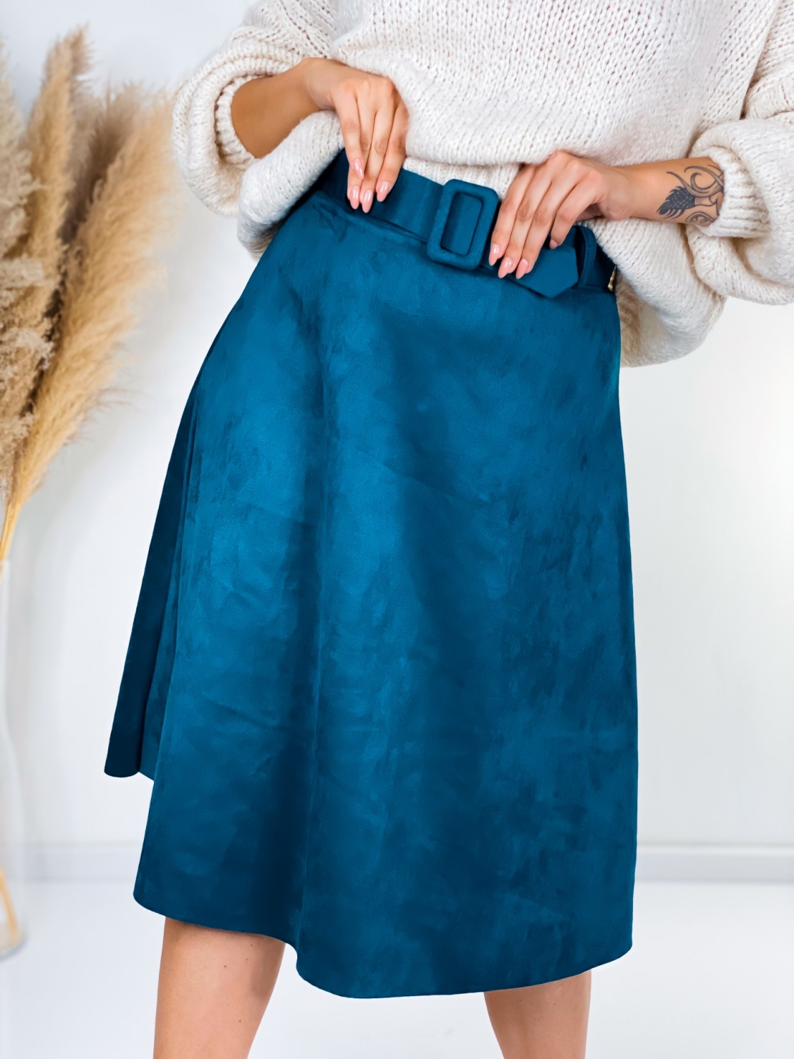 Dámska kvalitne spracovaná semišová sukňa s opaskom, ktorá je must have kúsok tejto sezóny. Sukňa je vyrobená z príjemného pružného materiálu a pekne drží svoj tvar. Je doplnená opaskom z rovnakého materiálu a v rovnakej farbe. Sukňa má pružný pás - na gumu a vďaka tomu pekne sedí na viacero veľkostí. Odporúčame od S po XL. Sukňa je bez zapínania. Jednoducho si ju natiahnete a vyrážate. Vhodné pre každú z Vás, ktorá má rada trendy kúsky klasického áčkového strihu. Skombinujte túto sukňu s vysokými alebo členkovými čižmami a vytvorte dokonalý jesenný outfit. Modelka je vysoká 175 cm a oblečenú má veľkosť UNI.