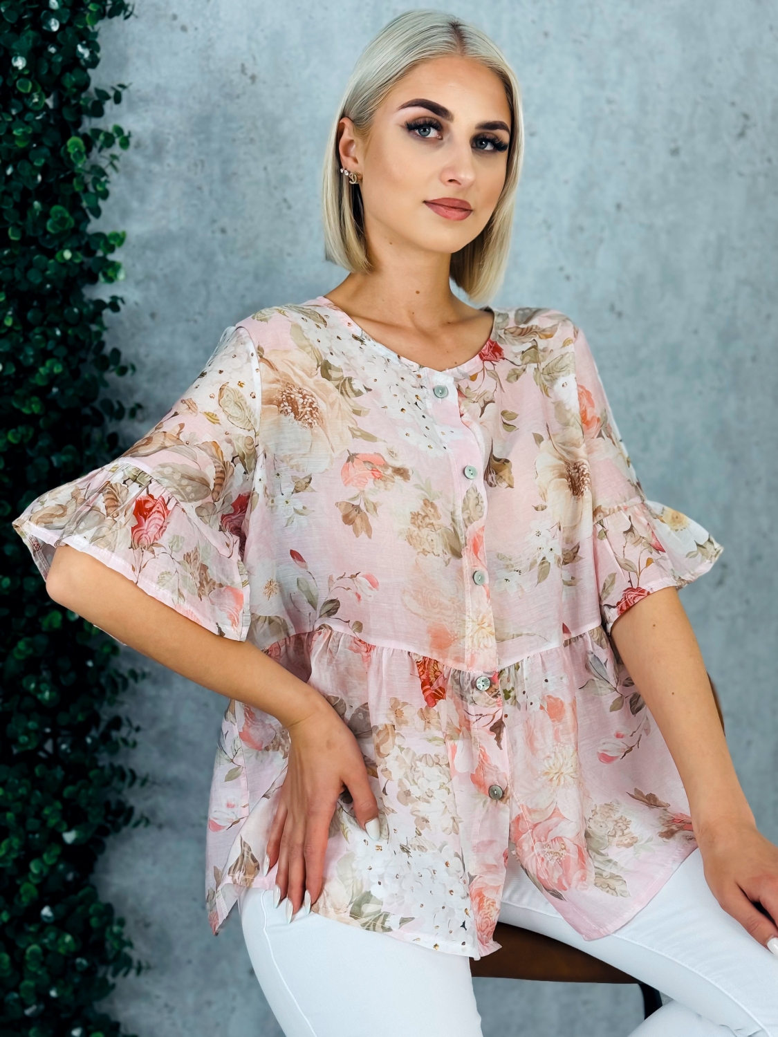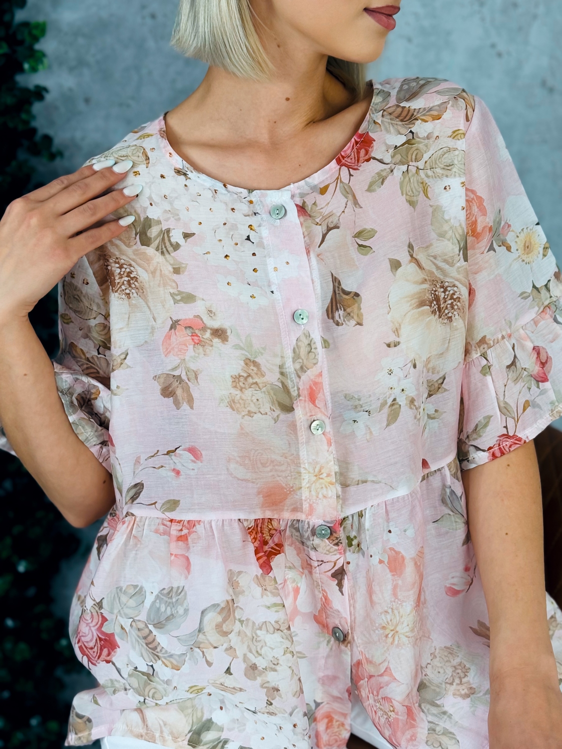 Dámska kvetovaná blúzka s gombíkmi a krátkym rukávom je ideálnym kúskom pre ženy, ktoré chcú spojiť eleganciu, pohodlie a svieži ženský štýl. Táto blúzka zaujme na prvý pohľad jemným kvetinovým vzorom, ktorý pôsobí romanticky a zároveň moderne. Vďaka svojej univerzálnosti je vhodná na každodenné nosenie do práce, na stretnutia s priateľmi, ale aj na rôzne spoločenské príležitosti. Blúzka je navrhnutá s dôrazom na detail. Predná časť je zdobená praktickým zapínaním na gombíky, ktoré nielenže uľahčuje obliekanie, ale zároveň dodáva celkovému vzhľadu jemne elegantný nádych. Krátke rukávy zabezpečujú pohodlie počas teplejších dní a umožňujú voľnosť pohybu, vďaka čomu sa budete cítiť príjemne po celý deň. Materiál blúzky je ľahký, priedušný a príjemný na dotyk, čo oceníte najmä počas jarných a letných mesiacov. Strih je navrhnutý tak, aby lichotil postave.