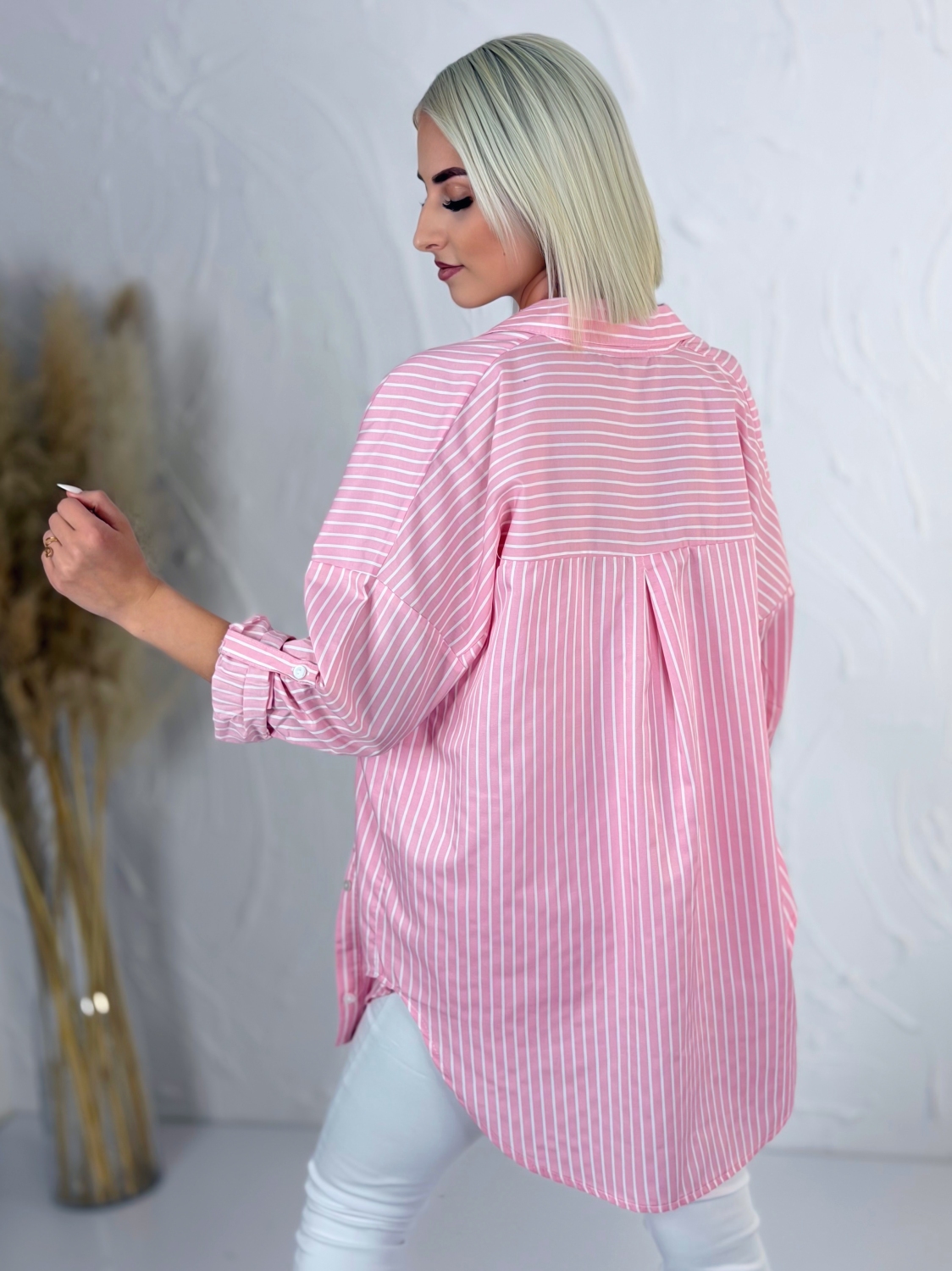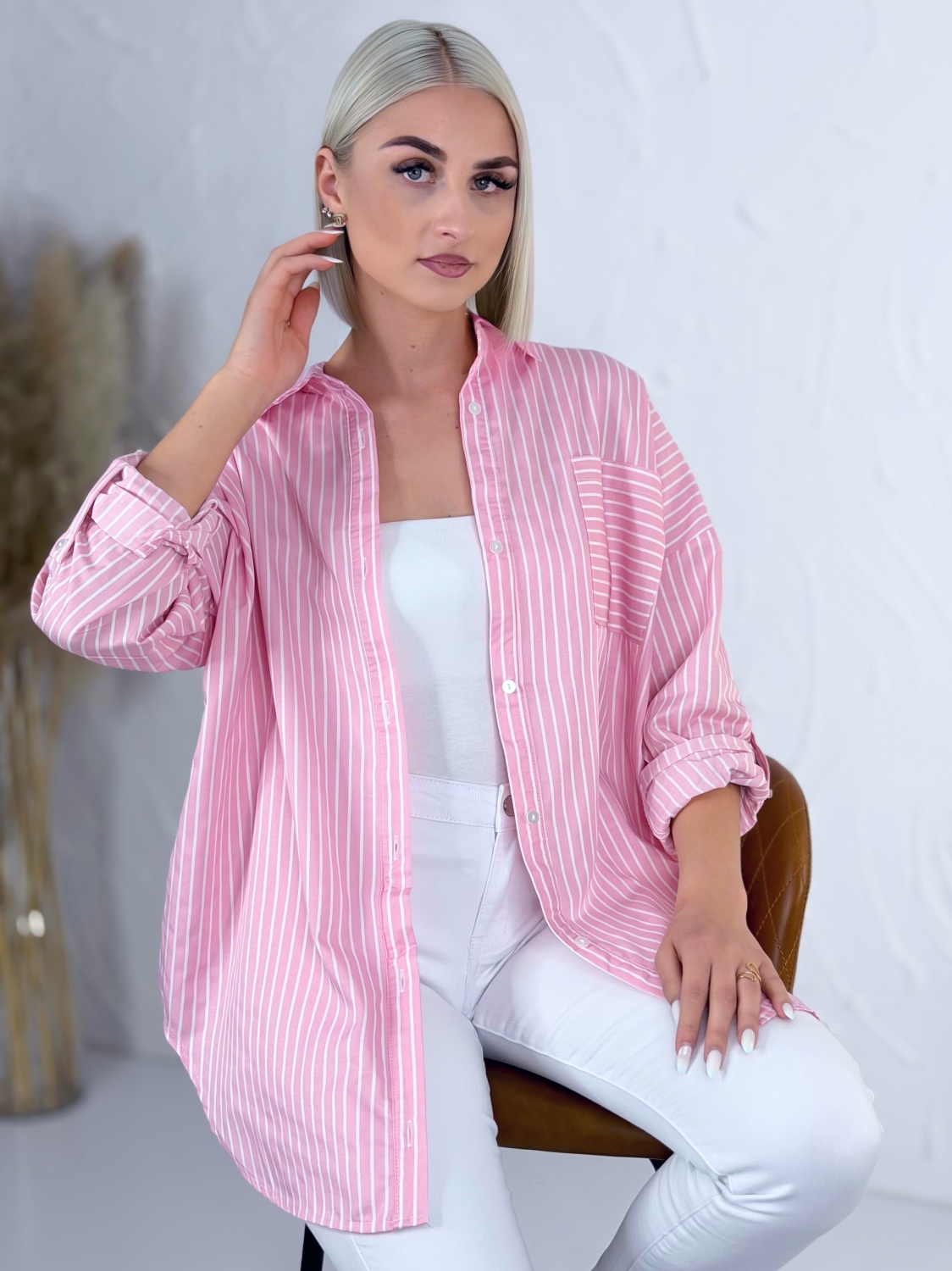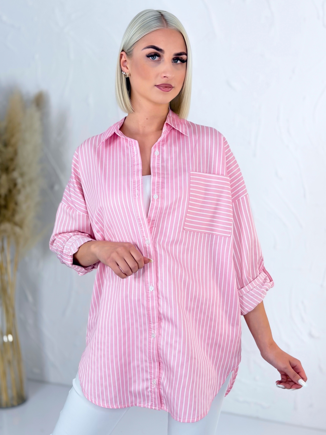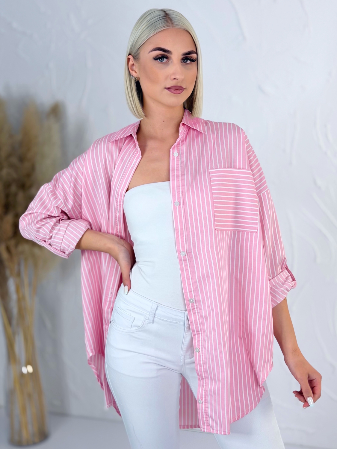 Táto štýlová pruhovaná košeľa s klasickým golierom je ideálnym kúskom pre každodenné nosenie aj ležérne elegantné kombinácie. Vyznačuje sa nadčasovým dizajnom s jemnými prúžkami, ktoré pôsobia sviežo a zároveň veľmi žensky. Vďaka oversize strihu krásne sadne každej postave, poskytuje maximálne pohodlie a voľnosť pohybu, pričom si zachováva moderný a upravený vzhľad. Košeľa má dlhé rukávy, ktoré si môžete podľa potreby vyhrnúť pre uvoľnenejší look alebo ich nechať spustené pre klasickejší štýl. Praktické predné vrecko dodáva košeli nielen štýlový detail, ale aj funkčnosť. Predĺžený strih je ideálny na nosenie k nohaviciam, legínam aj sukniam a ľahko sa kombinuje s rôznymi kúskami vo vašom šatníku. Materiál je príjemný na dotyk a vhodný na celodenné nosenie. Táto košeľa je skvelou voľbou pre ženy, ktoré hľadajú spojenie komfortu, štýlu a univerzálnosti v jednom kúsku.