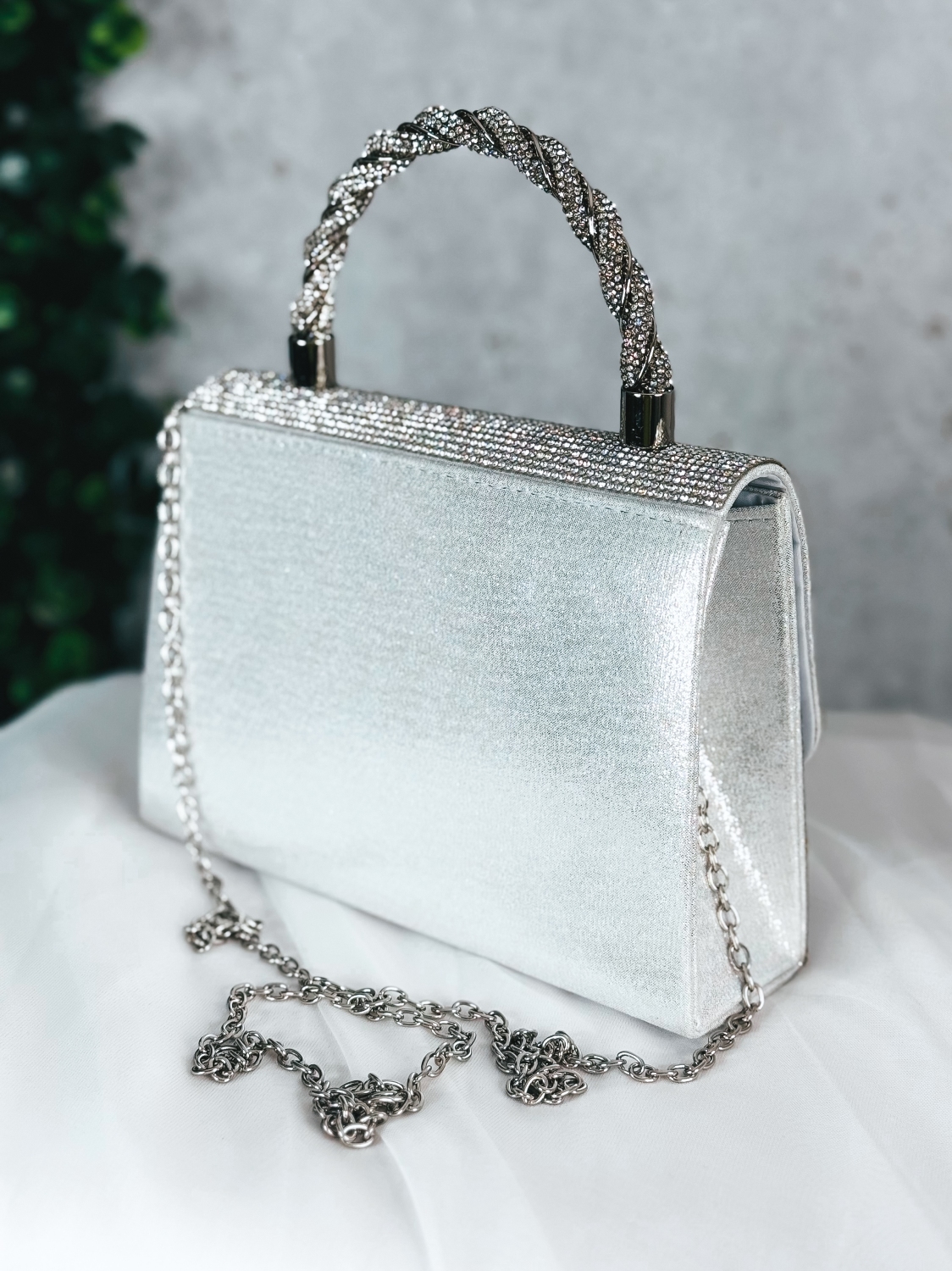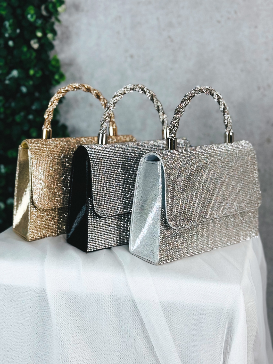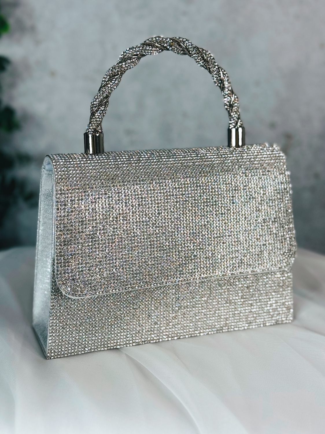Táto kabelka je skutočným stelesnením luxusu a žiarivej elegancie — doplnok, ktorý okamžite pritiahne pozornosť na každej spoločenskej udalosti. Celý jej povrch je bohato posiaty drobnými kryštálikmi, ktoré nádherne odrážajú svetlo a vytvárajú fascinujúci ligot pri každom pohybe. Tvar kabelky je klasicky obdĺžnikový, čo jej dodáva nadčasovosť a praktickosť. Elegantné skrútené držadlo, rovnako zdobené kamienkami, pôsobí luxusne a zároveň pohodlne padne do ruky. Kabelka má aj odnímateľný kovový retiazkový remienok, vďaka ktorému ju možno nosiť aj na pleci alebo ako crossbody. Uzáver je diskrétny a decentne zapracovaný pod chlopňou, čím zostáva zachovaná čistá línia dizajnu. Interiér kabelky ponúka dostatok miesta na nevyhnutné drobnosti — mobil, rúž, zrkadielko či kľúče — presne to, čo dáma potrebuje počas večera.