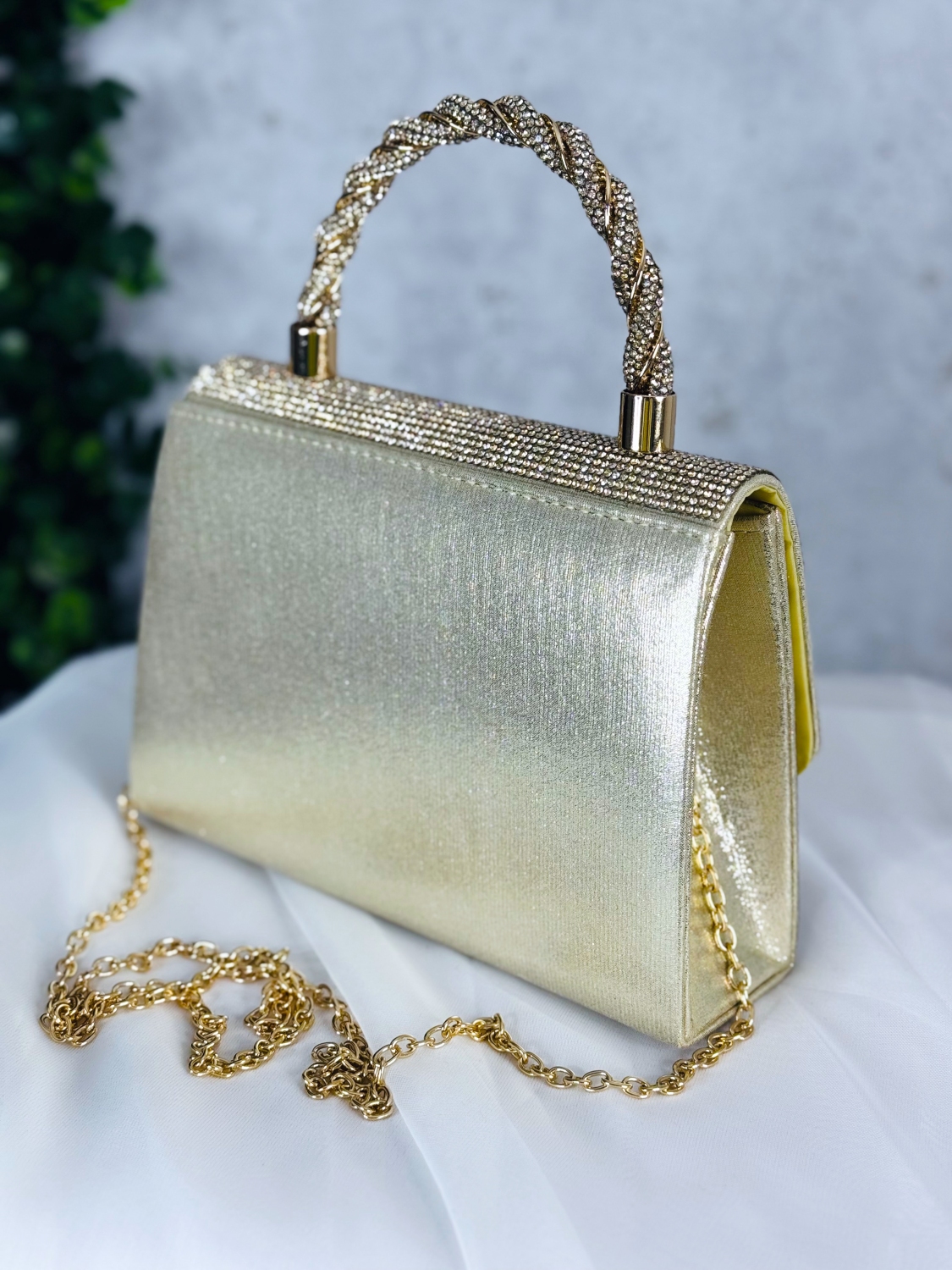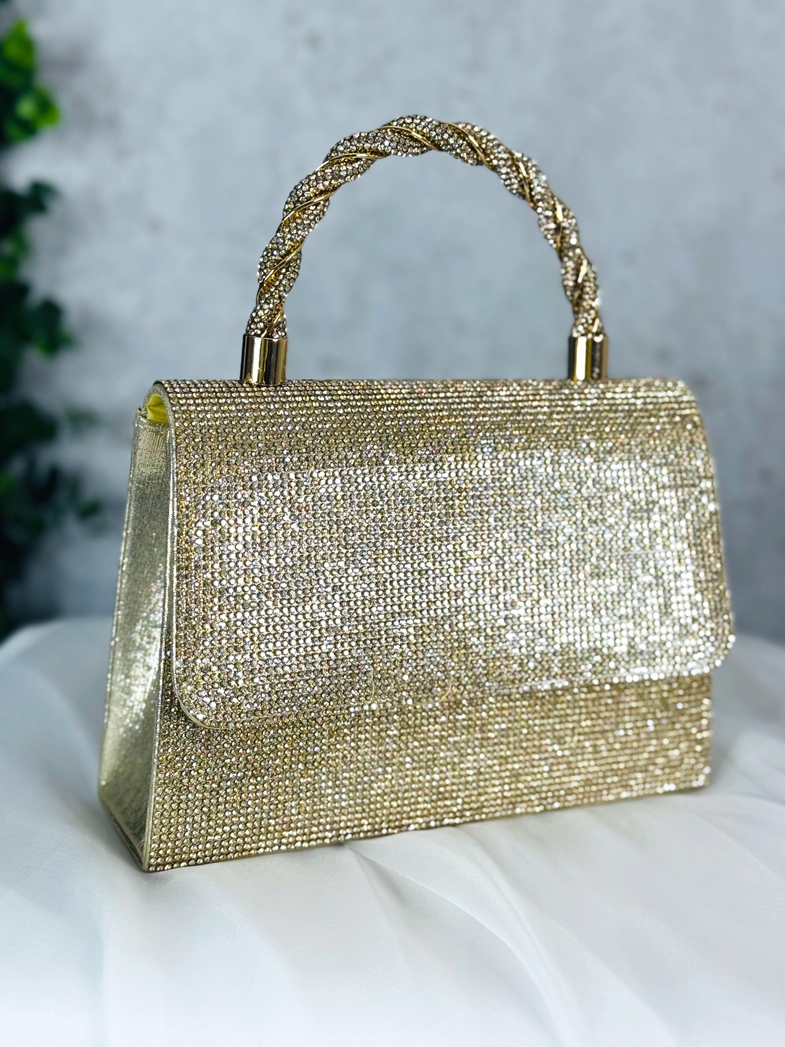 Táto kabelka je skutočným stelesnením luxusu a žiarivej elegancie — doplnok, ktorý okamžite pritiahne pozornosť na každej spoločenskej udalosti. Celý jej povrch je bohato posiaty drobnými kryštálikmi, ktoré nádherne odrážajú svetlo a vytvárajú fascinujúci ligot pri každom pohybe. Tvar kabelky je klasicky obdĺžnikový, čo jej dodáva nadčasovosť a praktickosť. Elegantné skrútené držadlo, rovnako zdobené kamienkami, pôsobí luxusne a zároveň pohodlne padne do ruky. Kabelka má aj odnímateľný kovový retiazkový remienok, vďaka ktorému ju možno nosiť aj na pleci alebo ako crossbody. Uzáver je diskrétny a decentne zapracovaný pod chlopňou, čím zostáva zachovaná čistá línia dizajnu. Interiér kabelky ponúka dostatok miesta na nevyhnutné drobnosti — mobil, rúž, zrkadielko či kľúče — presne to, čo dáma potrebuje počas večera.