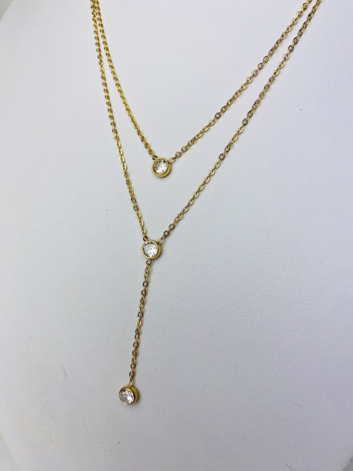 Dámska zlatá retiazka 2 v 1 s krúžkami a kryšálmi v nich. Hit tejto sezóny, ktorý nesmie chýbať žiadnej žene. Krásne oživí každý outfit. Je výrazný, no zároveň jemný a preto sa hodí naozaj ku všetkému.