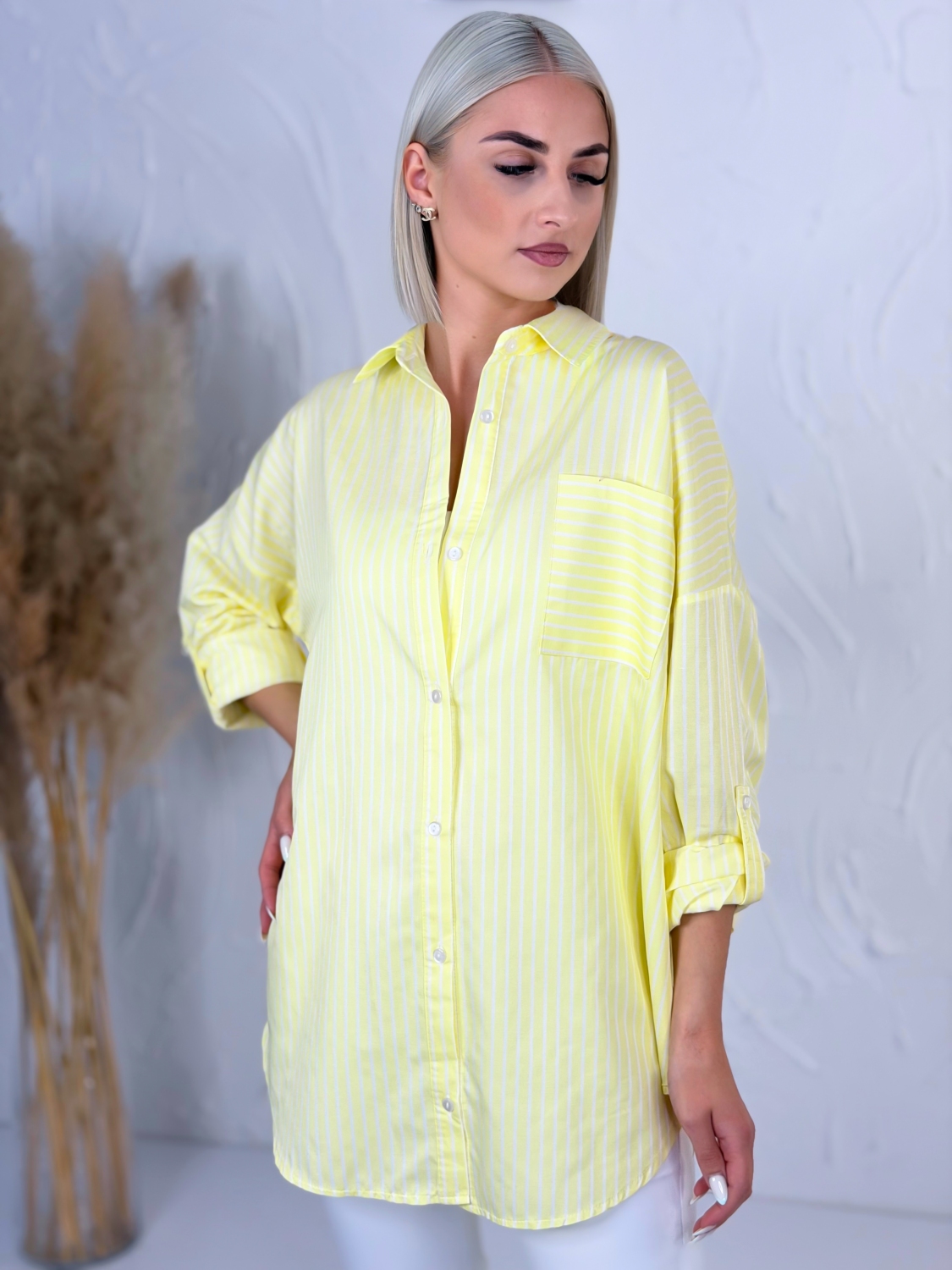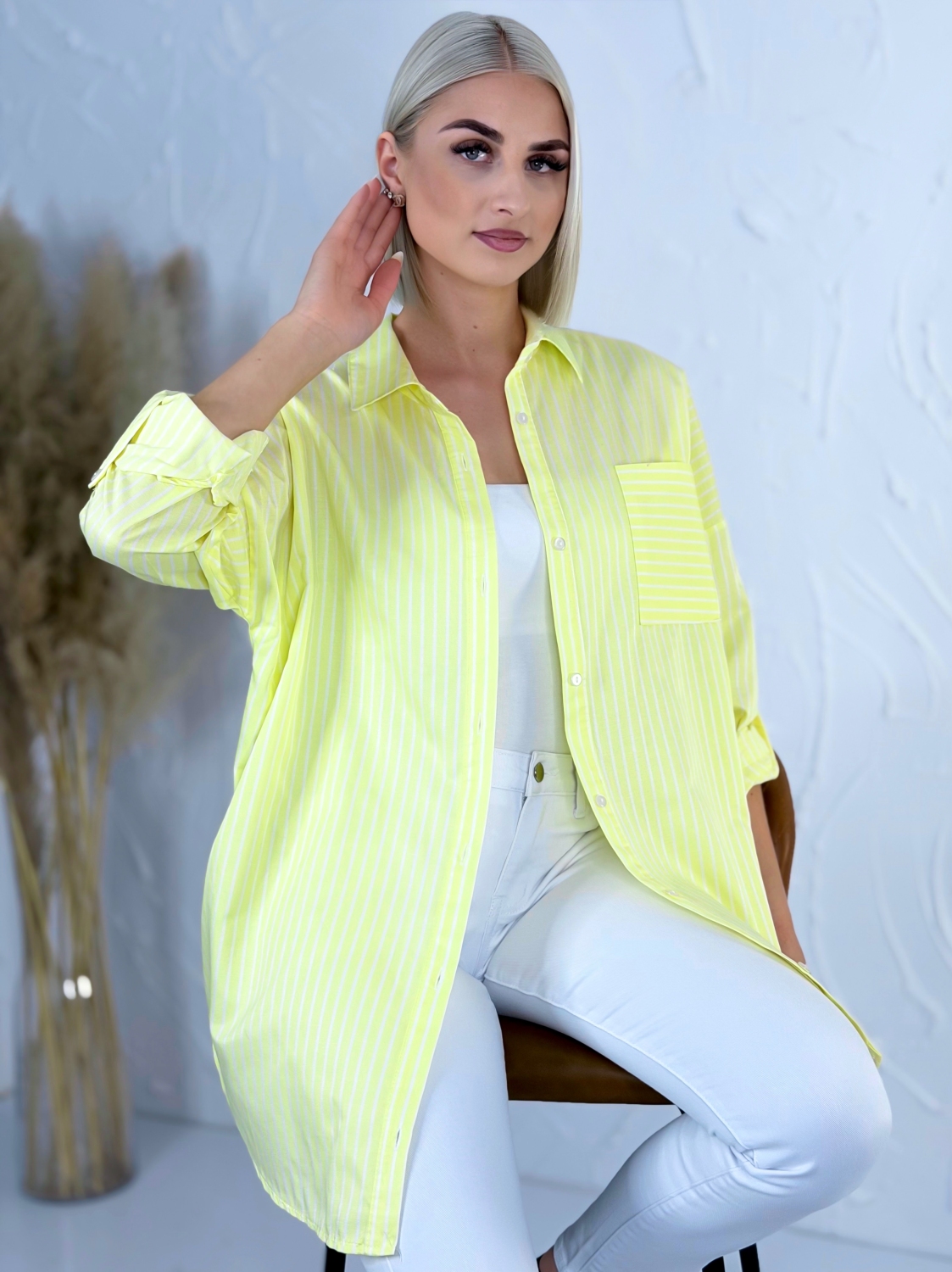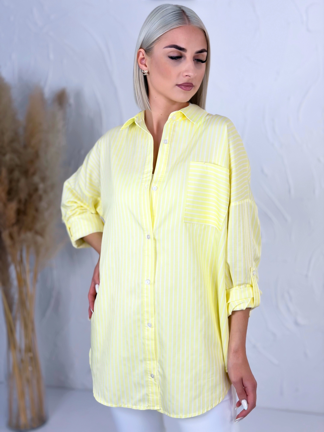 Táto štýlová pruhovaná košeľa s klasickým golierom je ideálnym kúskom pre každodenné nosenie aj ležérne elegantné kombinácie. Vyznačuje sa nadčasovým dizajnom s jemnými prúžkami, ktoré pôsobia sviežo a zároveň veľmi žensky. Vďaka oversize strihu krásne sadne každej postave, poskytuje maximálne pohodlie a voľnosť pohybu, pričom si zachováva moderný a upravený vzhľad. Košeľa má dlhé rukávy, ktoré si môžete podľa potreby vyhrnúť pre uvoľnenejší look alebo ich nechať spustené pre klasickejší štýl. Praktické predné vrecko dodáva košeli nielen štýlový detail, ale aj funkčnosť. Predĺžený strih je ideálny na nosenie k nohaviciam, legínam aj sukniam a ľahko sa kombinuje s rôznymi kúskami vo vašom šatníku. Materiál je príjemný na dotyk a vhodný na celodenné nosenie. Táto košeľa je skvelou voľbou pre ženy, ktoré hľadajú spojenie komfortu, štýlu a univerzálnosti v jednom kúsku.