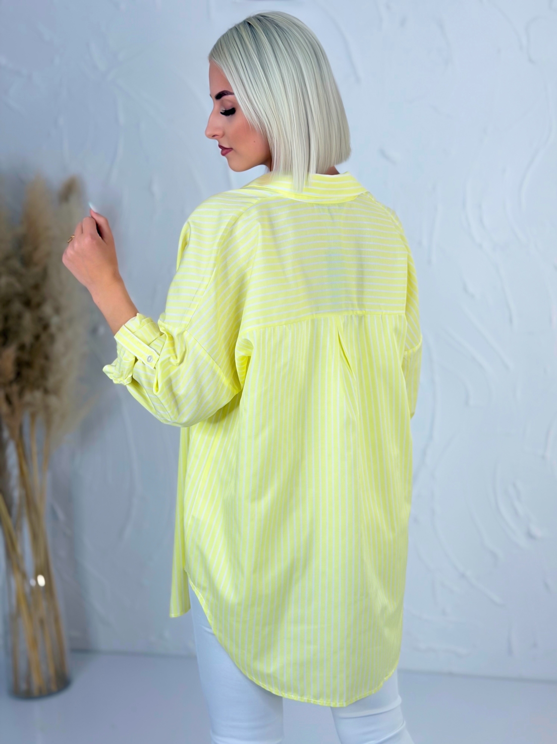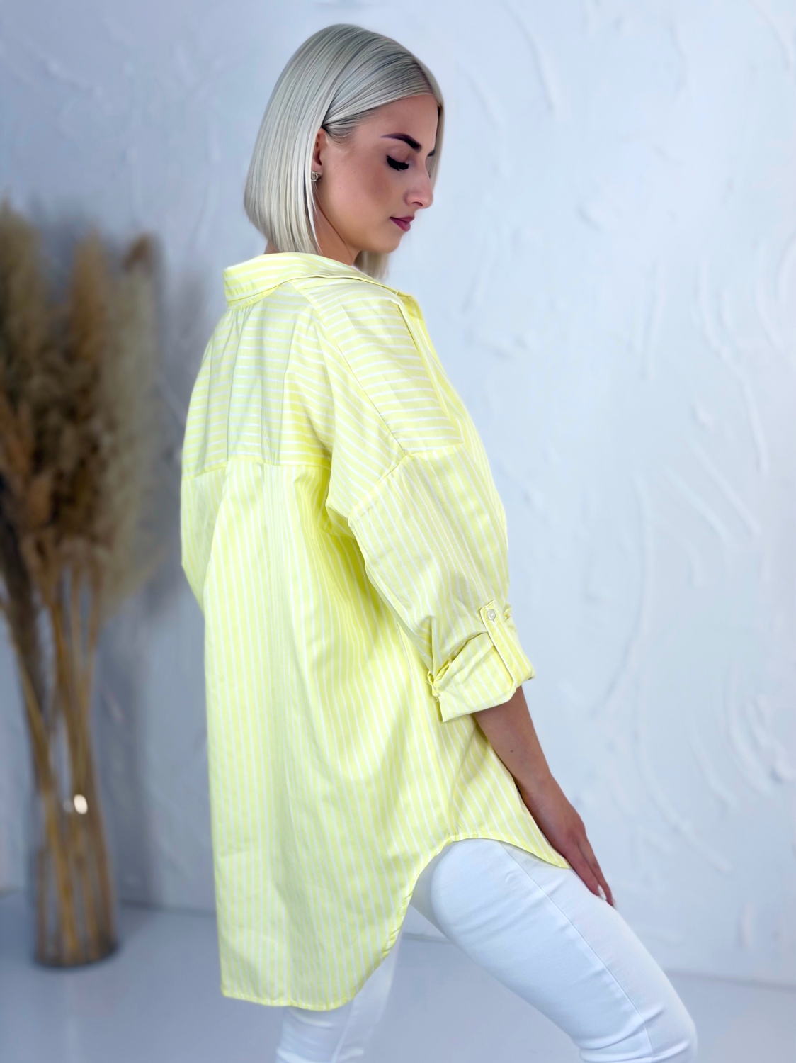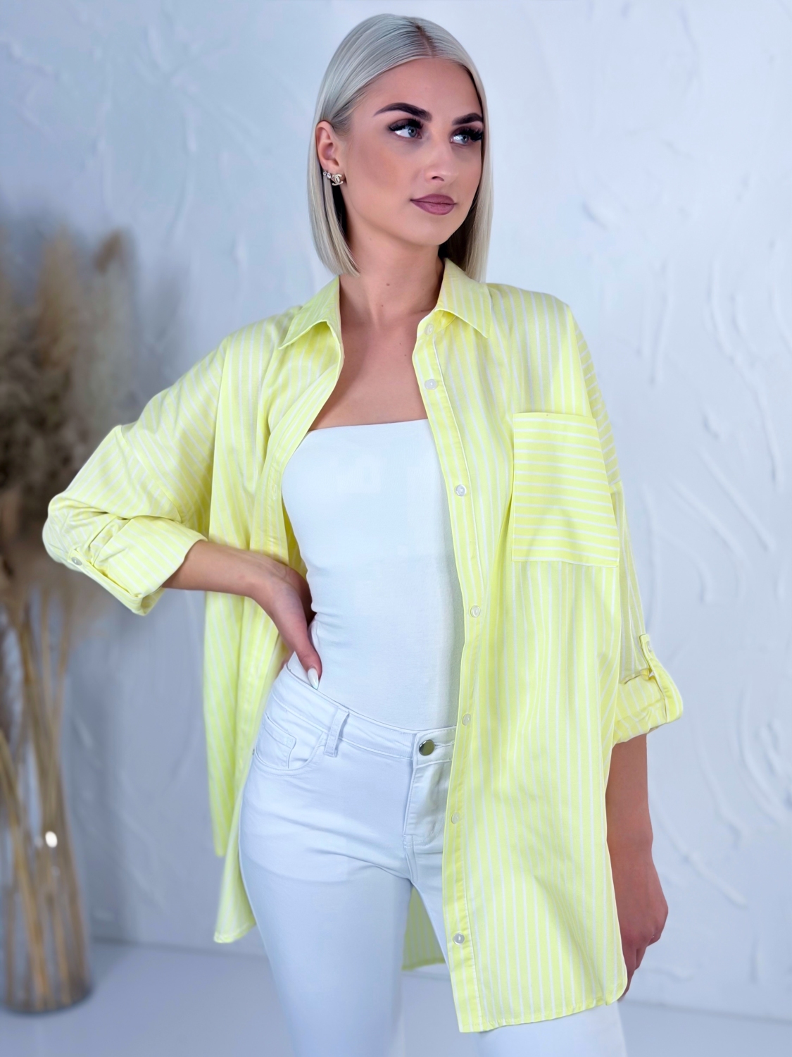Táto štýlová pruhovaná košeľa s klasickým golierom je ideálnym kúskom pre každodenné nosenie aj ležérne elegantné kombinácie. Vyznačuje sa nadčasovým dizajnom s jemnými prúžkami, ktoré pôsobia sviežo a zároveň veľmi žensky. Vďaka oversize strihu krásne sadne každej postave, poskytuje maximálne pohodlie a voľnosť pohybu, pričom si zachováva moderný a upravený vzhľad. Košeľa má dlhé rukávy, ktoré si môžete podľa potreby vyhrnúť pre uvoľnenejší look alebo ich nechať spustené pre klasickejší štýl. Praktické predné vrecko dodáva košeli nielen štýlový detail, ale aj funkčnosť. Predĺžený strih je ideálny na nosenie k nohaviciam, legínam aj sukniam a ľahko sa kombinuje s rôznymi kúskami vo vašom šatníku. Materiál je príjemný na dotyk a vhodný na celodenné nosenie. Táto košeľa je skvelou voľbou pre ženy, ktoré hľadajú spojenie komfortu, štýlu a univerzálnosti v jednom kúsku.