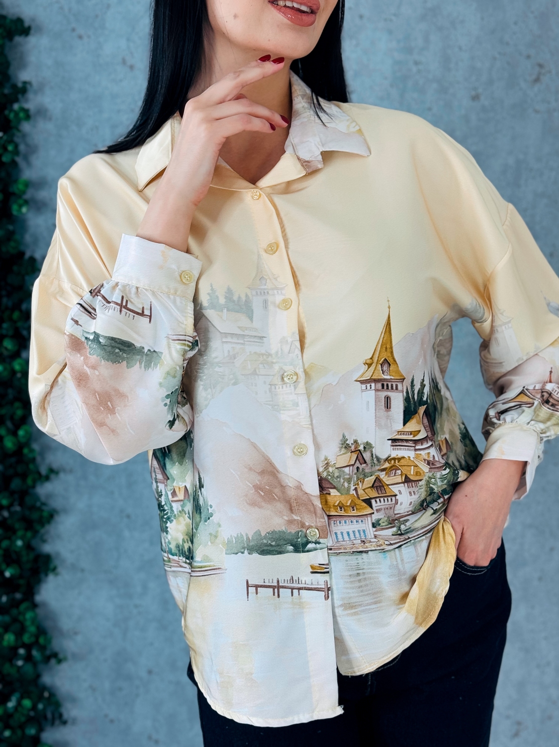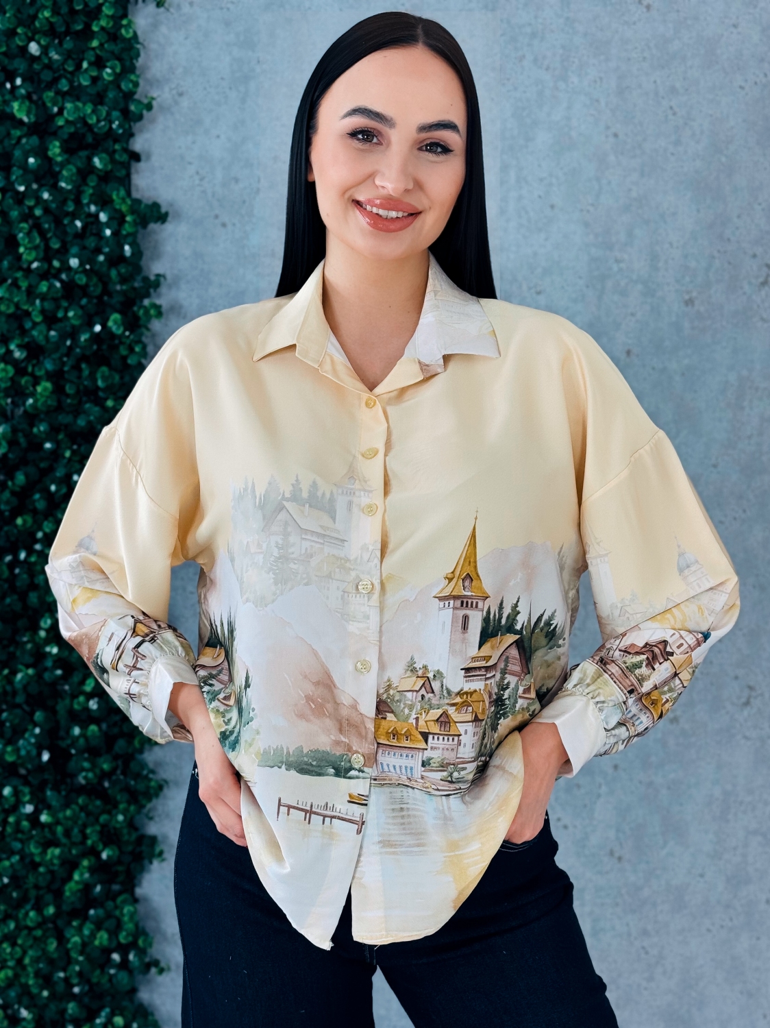 Dámska blúzka s dlhými rukávmi je elegantný a štýlový kúsok, ktorý zaujme na prvý pohľad svojím vzorovaným dizajnom a jemne hravými detailmi, blúzka je vyrobená z príjemného, ľahkého a pohodlného materiálu, ktorý je vhodný na celodenné nosenie, jej strih je klasický s mierne voľnejším padnutím, ktoré lichotí rôznym typom postavy, vpredu sa nachádza praktické zapínanie na gombíky, ktoré umožňuje jednoduché obliekanie a dodáva blúzke elegantný a sofistikovaný vzhľad, dlhé rukávy sú pohodlné, mierne nadýchané pri zápästí a doplnené jemnými manžetami, ktoré dotvárajú celkový vzhľad a pridávajú blúzke jemný detail, vzorovaný motív po celej ploche blúzky pôsobí moderne, sviežo a originálne, a dodáva outfitu osobitý charakter, strih blúzky je vhodný na kombinovanie s nohavicami, sukňou alebo rifľami, čím sa stáva univerzálnym kúskom pre každodenné nosenie, do práce, na voľný čas alebo spoločenské príležitosti, a jej dizajn spája pohodlie, štýl a výrazný vizuálny efekt, vďaka čomu je ideálnym doplnkom šatníka každej ženy, ktorá chce vyzerať moderne, sviežo a elegantne zároveň.
