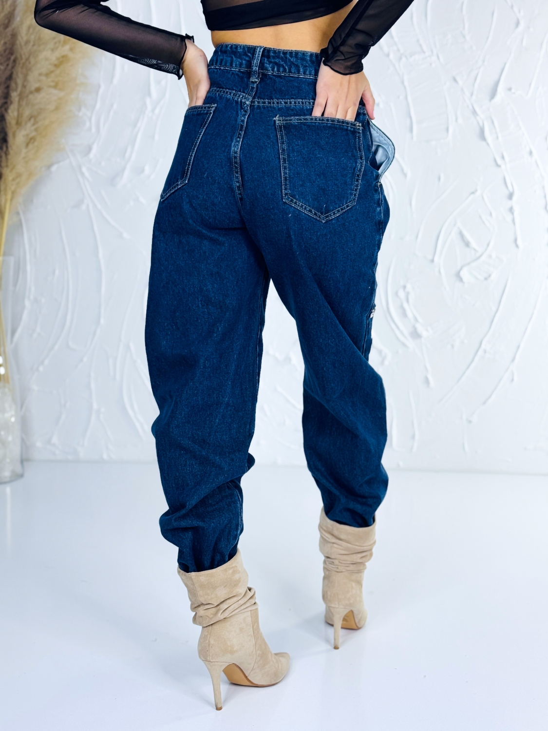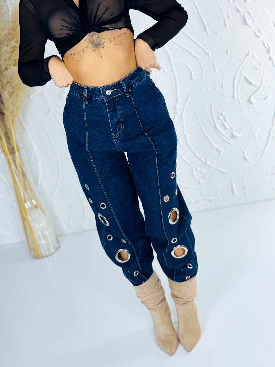 Dámske baggy tmavomodré rifle s cvokmi. Tieto štýlové dámske baggy rifle ponúkajú kombináciu pohodlia a moderného dizajnu. Vyrobené z kvalitného tmavomodrého denimu, ktorý je odolný a zároveň príjemný na nosenie, sú ideálne na každodenné nosenie i voľnočasové aktivity. Rifle majú voľný, baggy strih, ktorý poskytuje dostatok pohybu a vytvára uvoľnený, trendový vzhľad. Dekorované sú praktickými cvokmi. Klasické zapínanie na zips a gombík zaručuje pohodlné obliekanie a bezpečné držanie. Rifle sú vybavené typickými vreckami – dvoma vpredu a dvoma vzadu – pre praktické uloženie drobností. Tieto baggy rifle sú skvelou voľbou pre každú ženu, ktorá chce kombinovať pohodlie s mestským, moderným lookom. Ideálne sa hodia k teniskám, topánkam na platforme či voľným mikinám a tričkám.