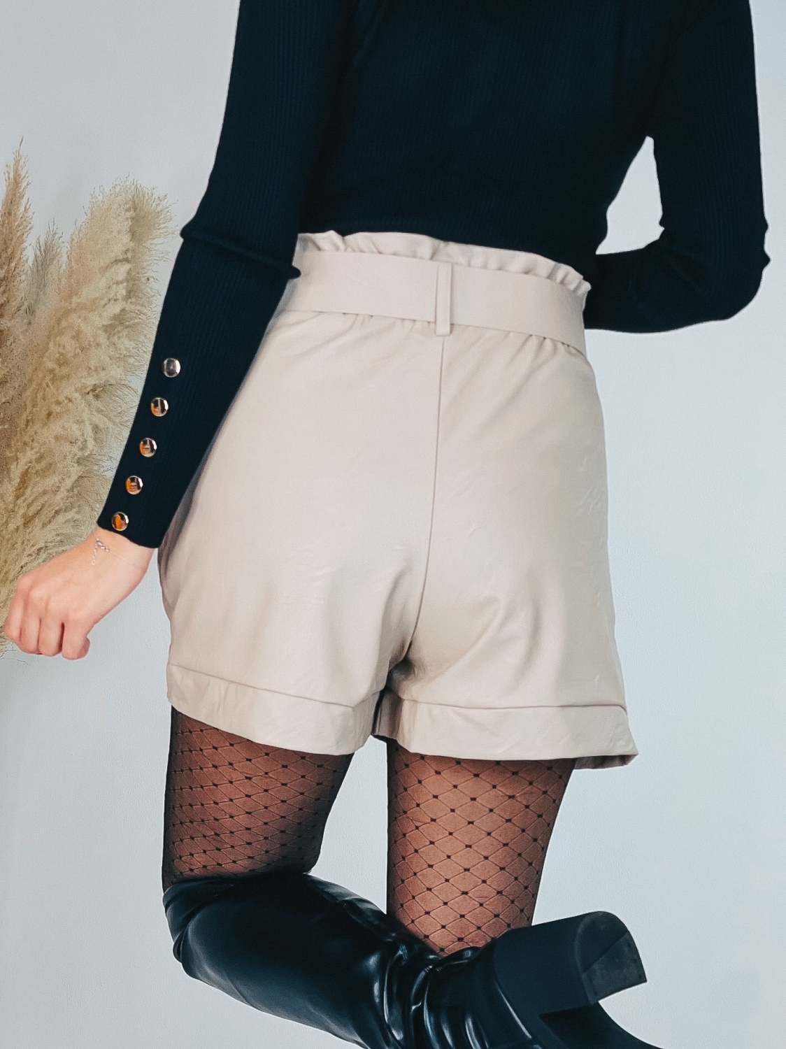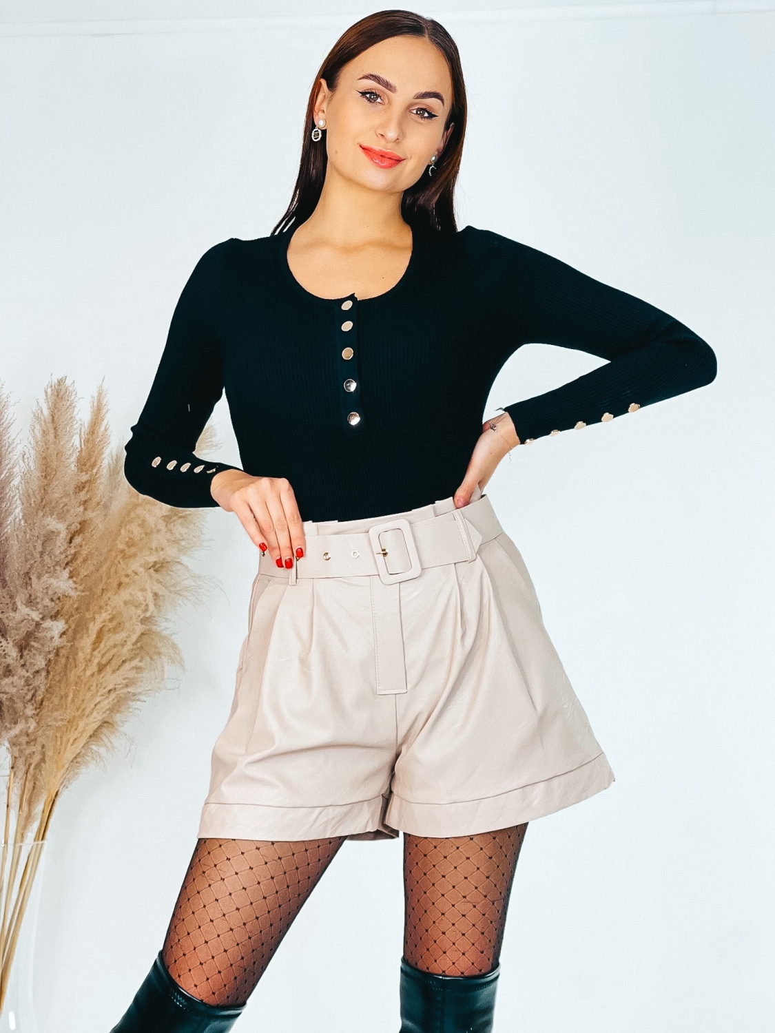 Dámske koženkové kraťasy v áčkovom strihu v TOP farbe, ktoré sú doplnené opaskom a vreckami na oboch stranách. Vzadu pružná gumička. Kraťasy sú s klasicky strihaným pásom. Vhodné pre každú z Vás, ktorá má rada trendy kúsky zaujímavého strihu. Tieto kraťasy sa prispôsobia vašej postave. Kraťasy sú s vysokým pásom. Vyrobené z kvalitného a veľmi pohodlného materiálu. Skombinujte tieto kraťase s vysokými čižmami a vytvorte dokonalý look. Modelka je vysoká 175 cm a oblečenú má veľkosť S.
