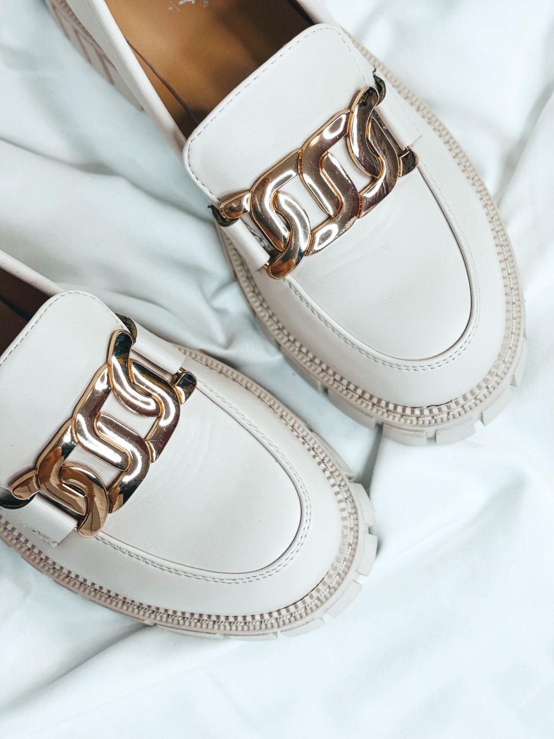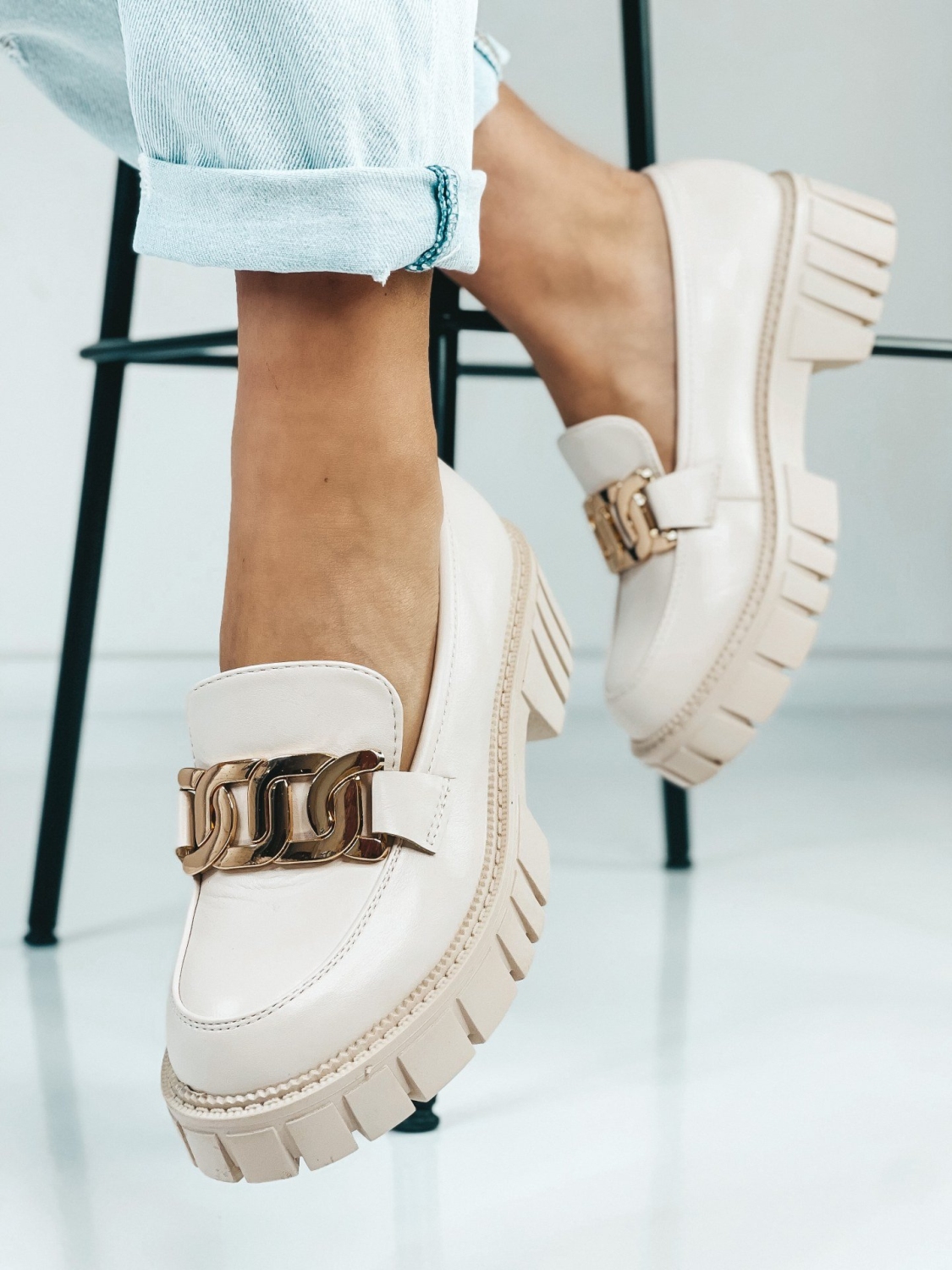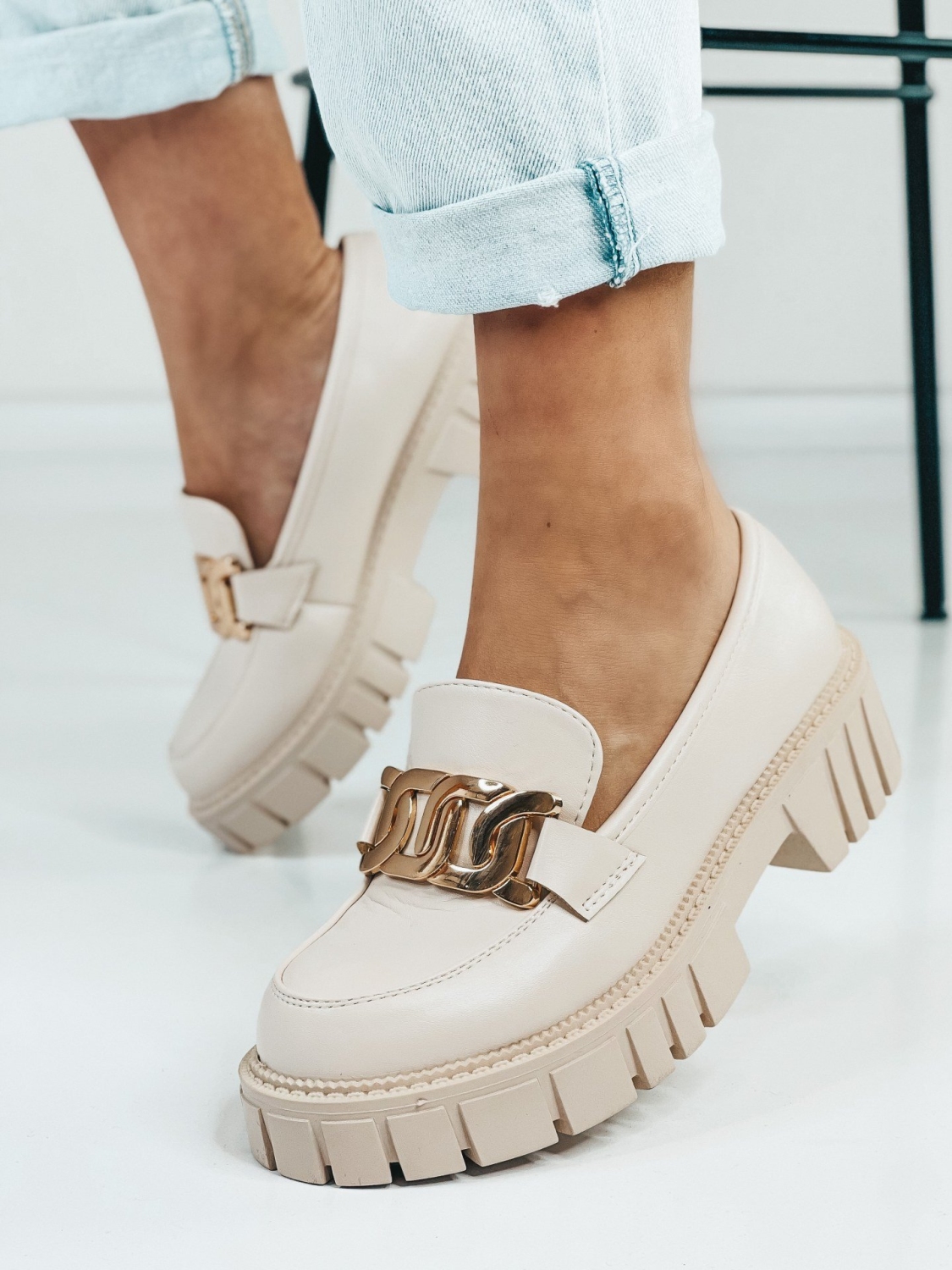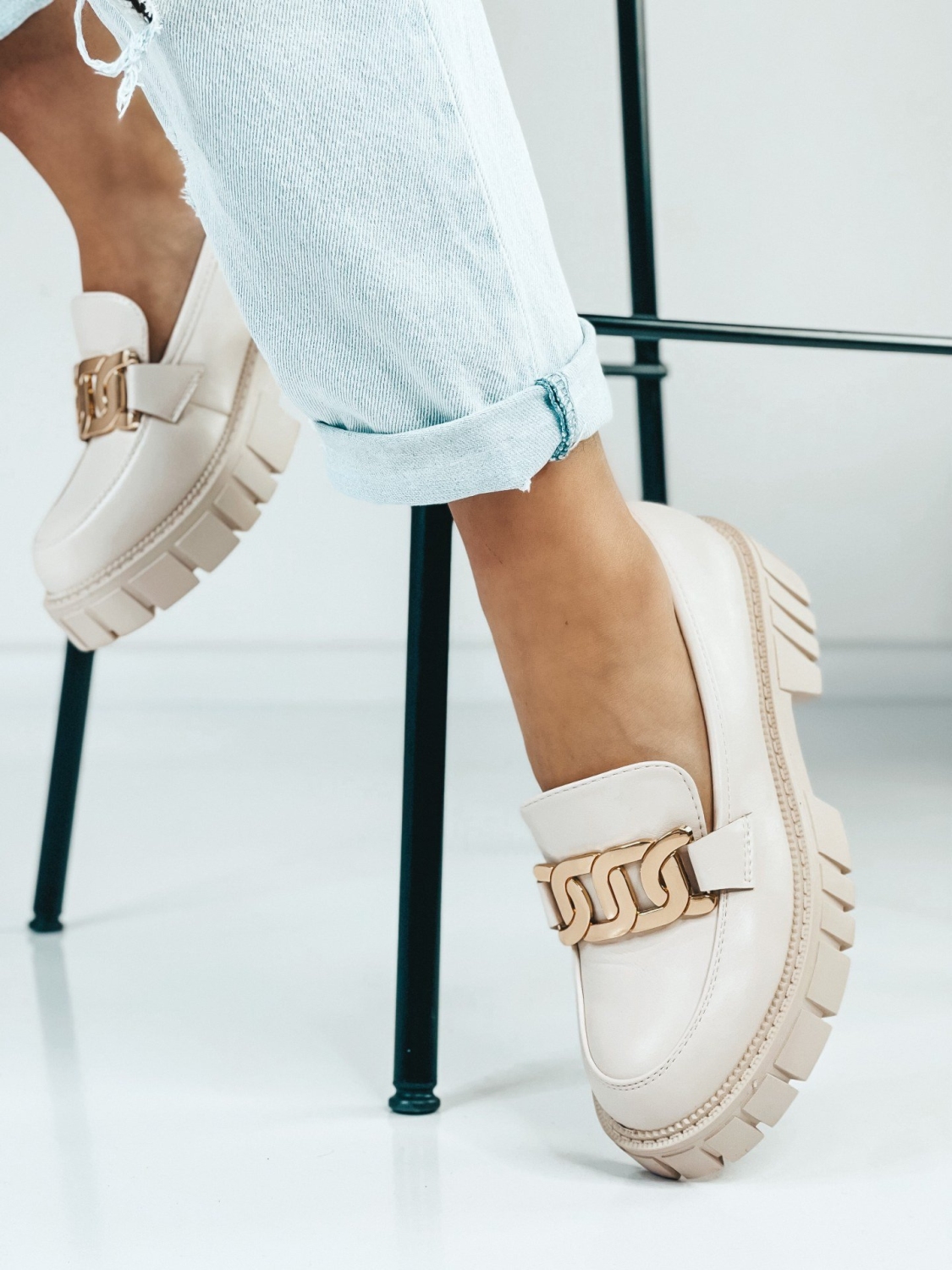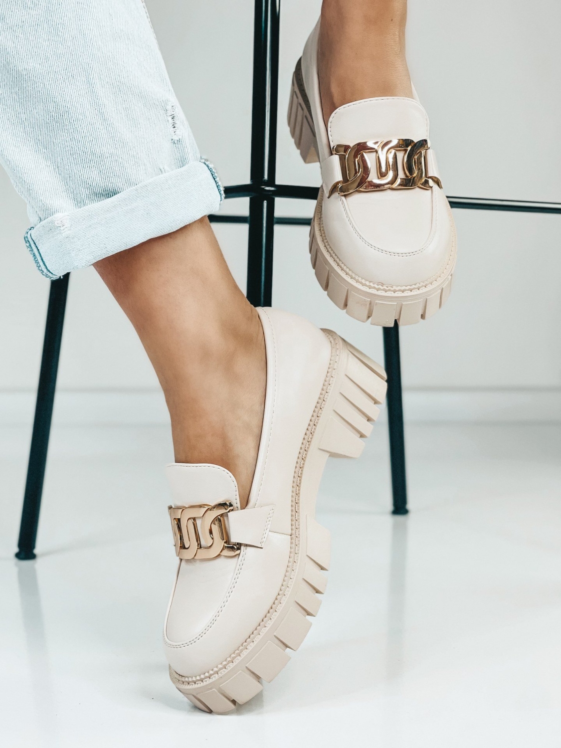 Dámske béžové mokasíny so zlatou reťazou, ktoré Vám túto sezónu nesmú chýbať. Zvršok mokasín je matného materiálu. Mokasíny, ktoré sú na platforme sú veľmi elegantnou a zároveň pohodlnou voľbou. Ak chcete získať trochu na výške, zvoľte si tieto mokasíny. Budú sa Vám skvelo hodiť k obyčajnej blúzke, ale aj k množstvo iným outfitom.